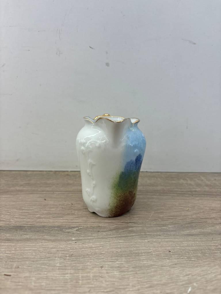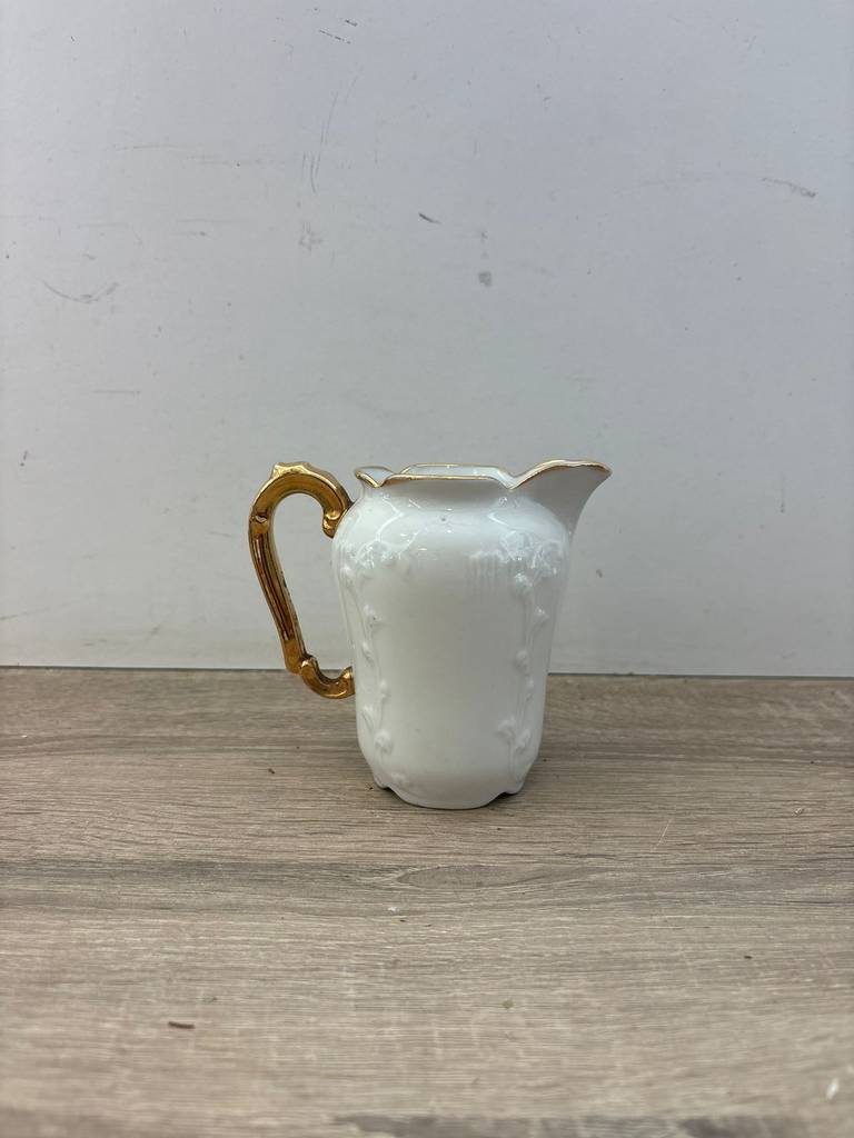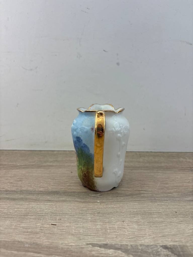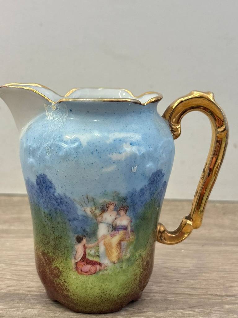 Jarrita de porcelana de buena cálida de color blanco con una imagen muy bucólica de unas señoritas en un prado de pasto verde y un cielo azul. Se trata de una jarrita de porcelana que tiene un asa en un lateral de color dorado para poder cogerla con mayor facilidad. Es una jarrita ideal para tenerla en un salón comedor como elemento decorativo. Como se puede observar en las fotografías se encuentra en buenas condiciones.