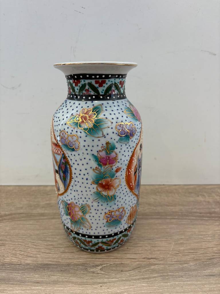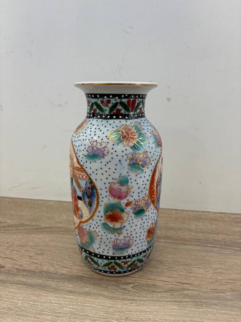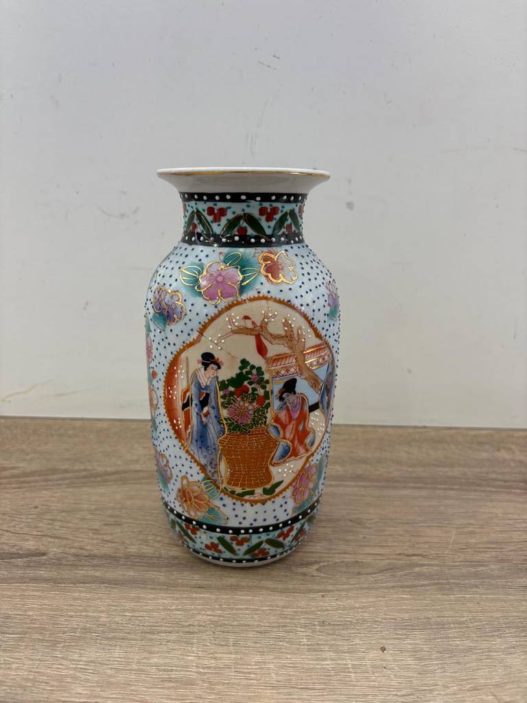 Jarrón de cerámica decorado con un estilo oriental muy bonito. Se trata de un jarrón de cerámica de tamaño mediano que tiene unos dibujos muy bonitos de estilo oriental. Es un jarrón perfecto para colocarlo encima de una cómoda o de una mesa en un salón comedor. Como se puede observar en las fotografías se encuentra en buenas condiciones.