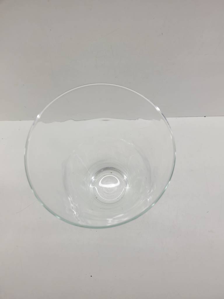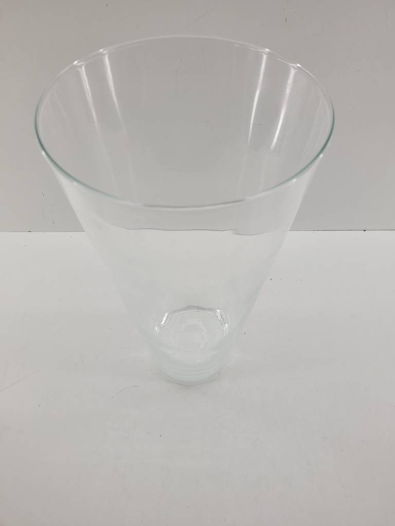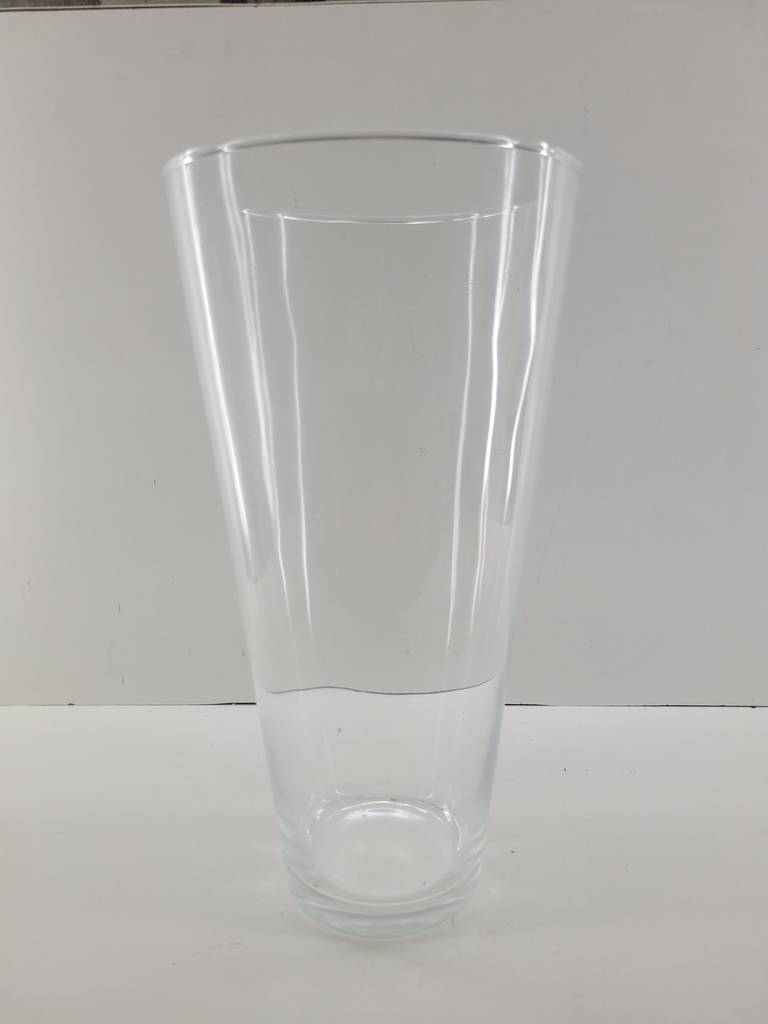 Jarrón de vidrio transparente duro y resistente con una forma cónica abierta por la parte superior. Se trata de un jarrón de vidrio de tamaño mediano que resulta ideal para llenarlo de agua y colocar dentro unas flores frescas. Es un jarrón perfecto para colocarlo encima de una cómoda en un salón comedor. Como se puede observar en las fotografías se encuentra en buenas condiciones.