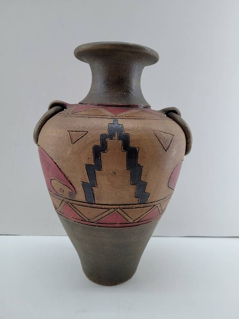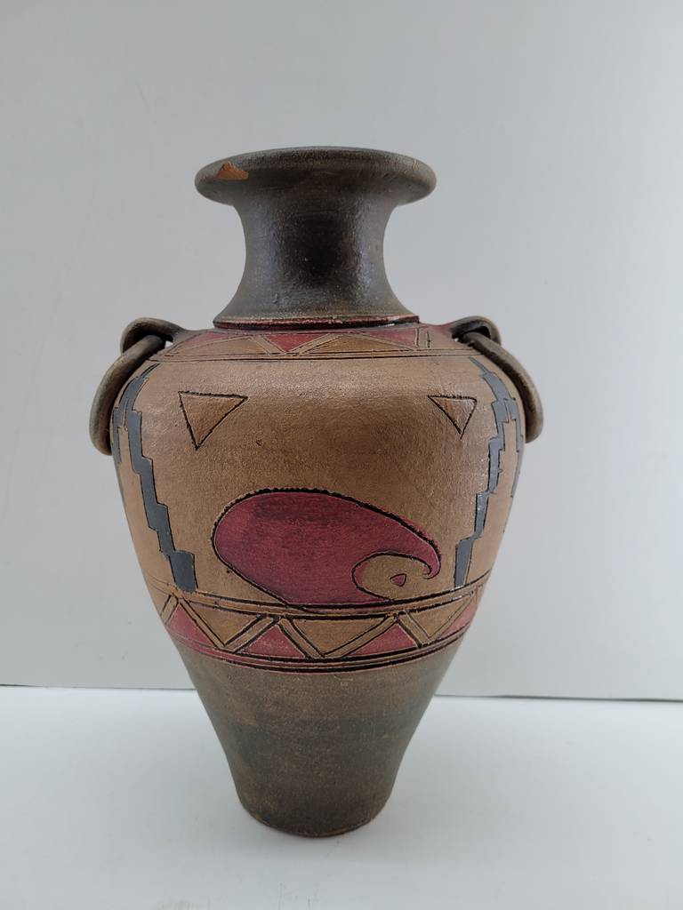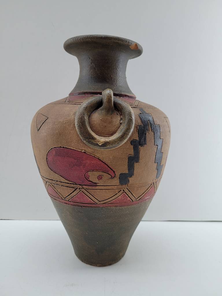 Jarrón muy bonito y original con una decoración ideal para decorar y aportar un toque único a nuestro salón comedor o recibidor. Dispone de asas en los laterales en forma de anilla y una parte superior fina y circular. Como podemos observar en las fotografías presenta un desperfecto en la parte superior, pero en general se encuentra en buenas condiciones.