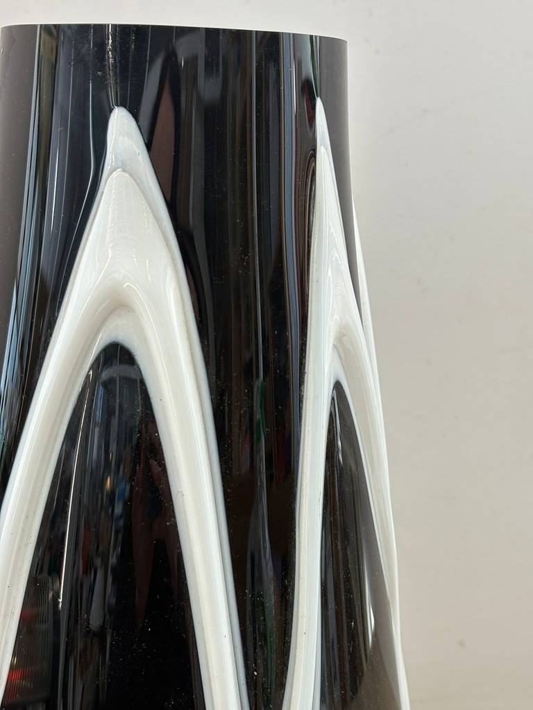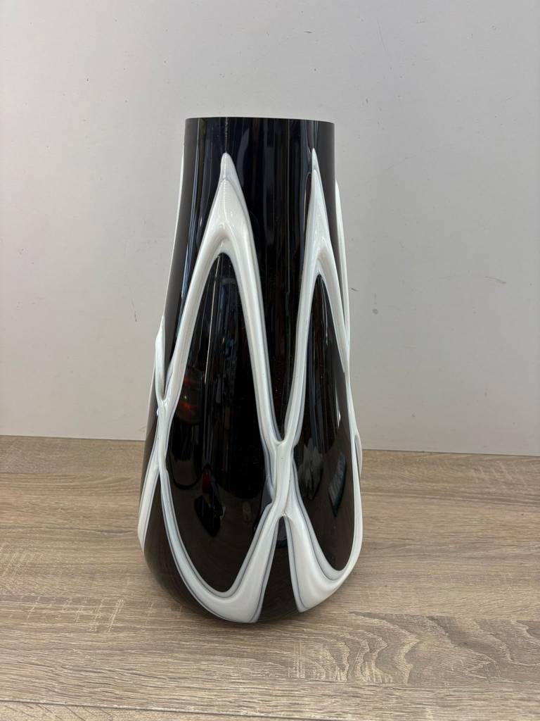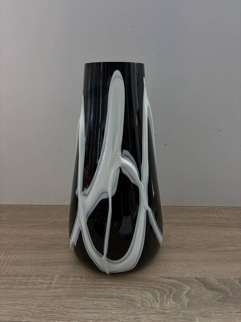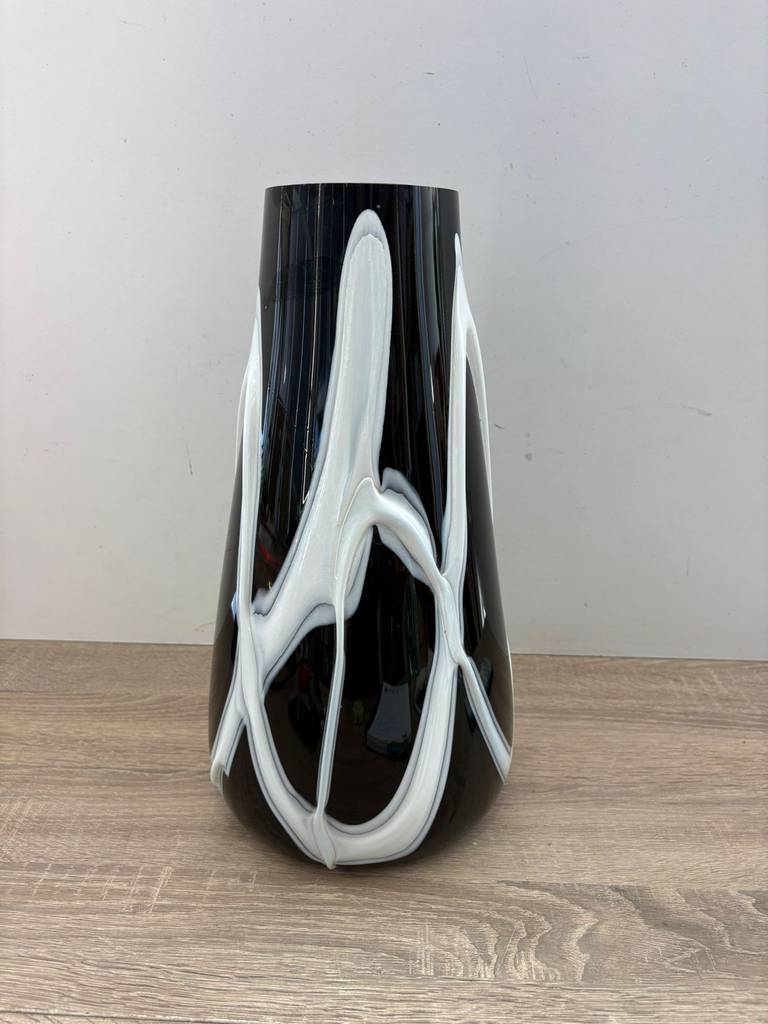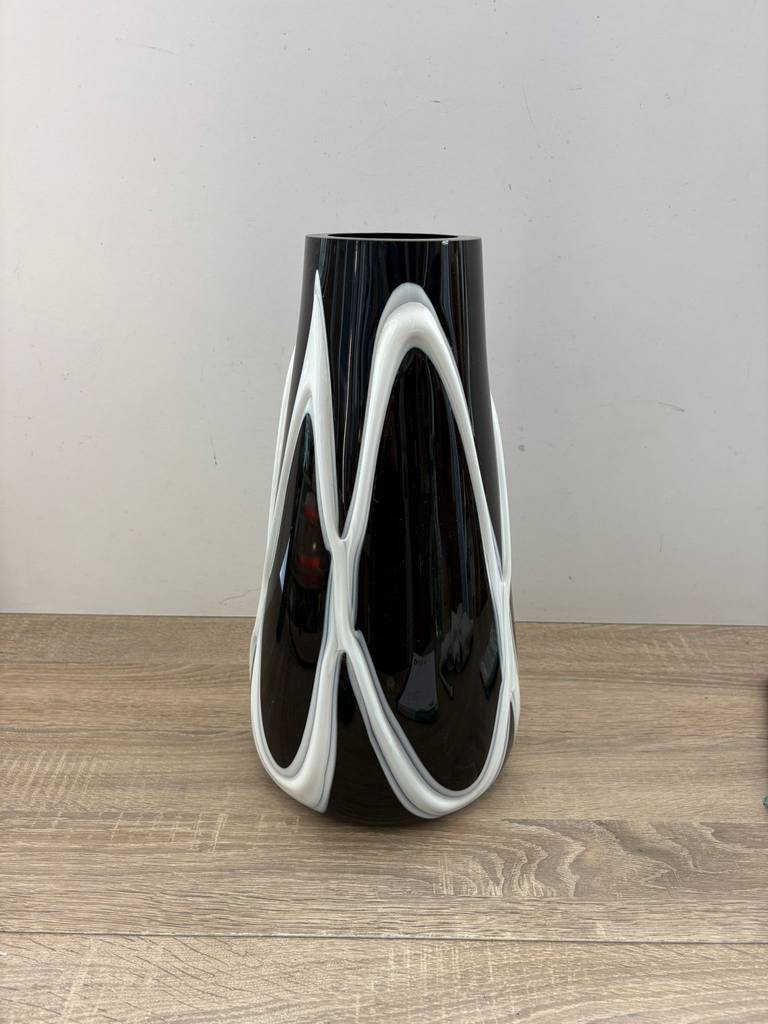 Jarrón de estilo moderno y actual de color negro con dibujos en relieve de rayas de color blanco. Se trata de un bonito jarrón de tamaño mediano que cuenta con una base más ancha y una superficie más estrecha y resulta ideal para meter dentro flores y ponerlo encima de una cómoda en un salón comedor. Como se puede observar en las imágenes se encuentra en buenas condiciones.