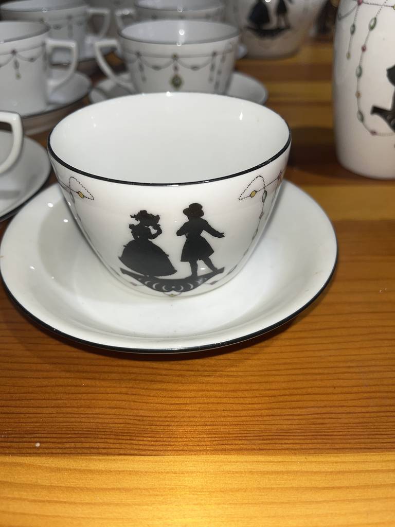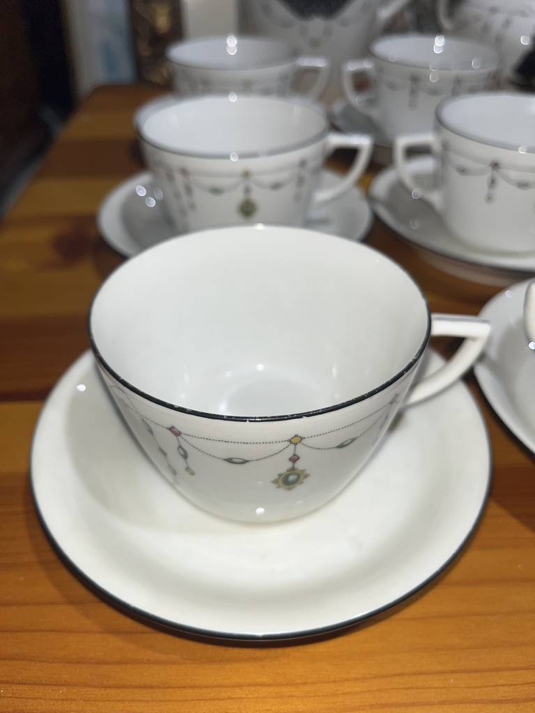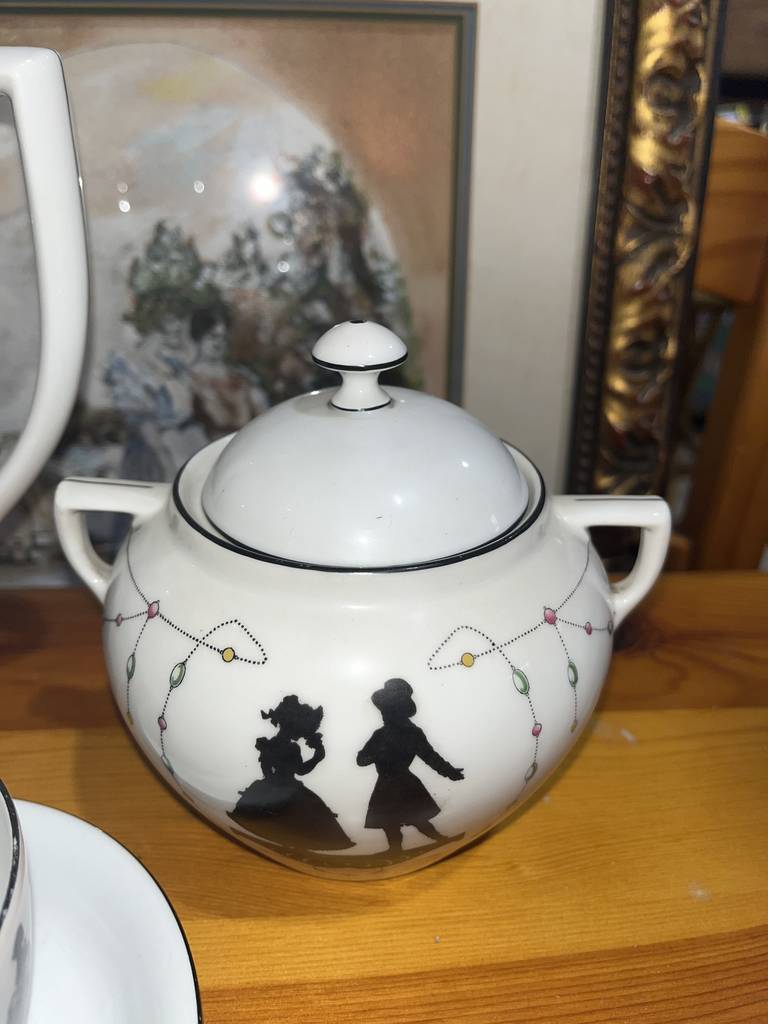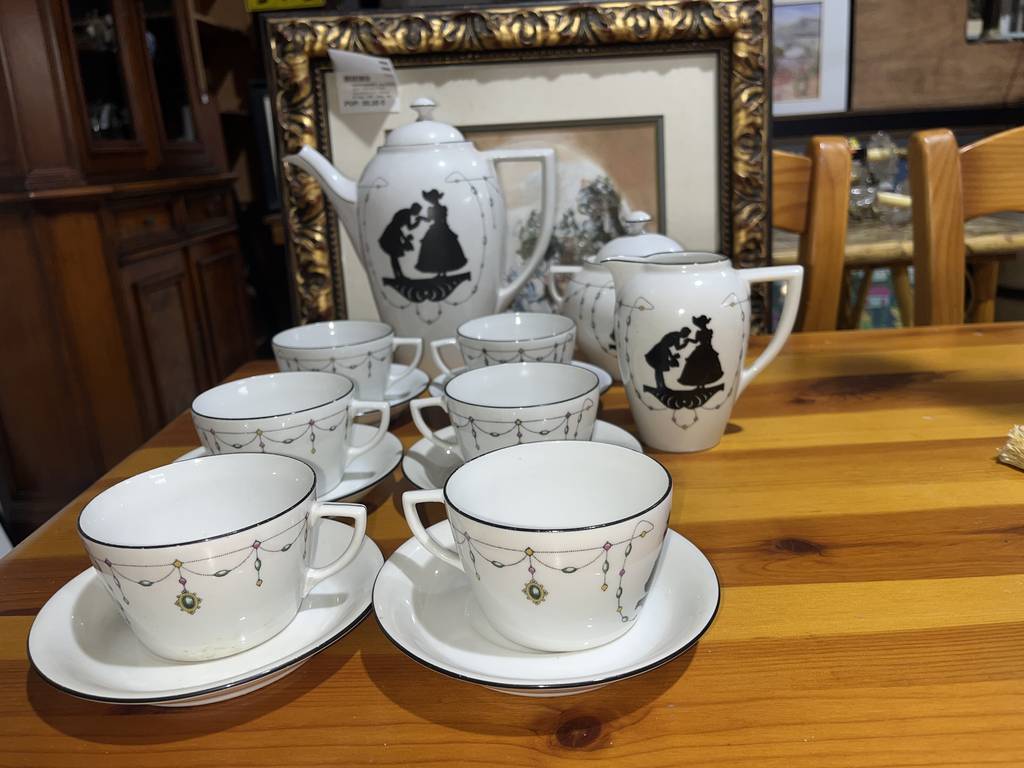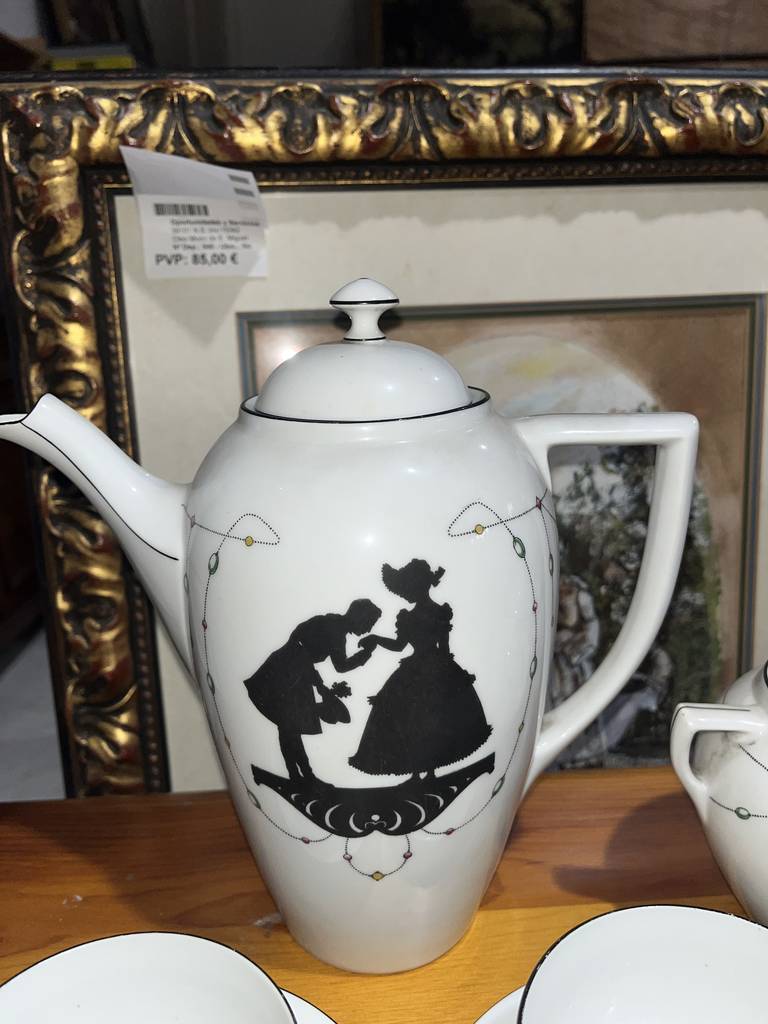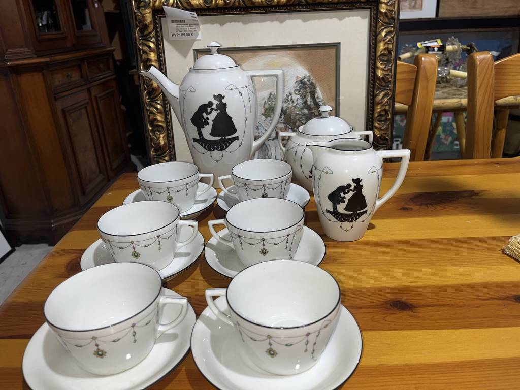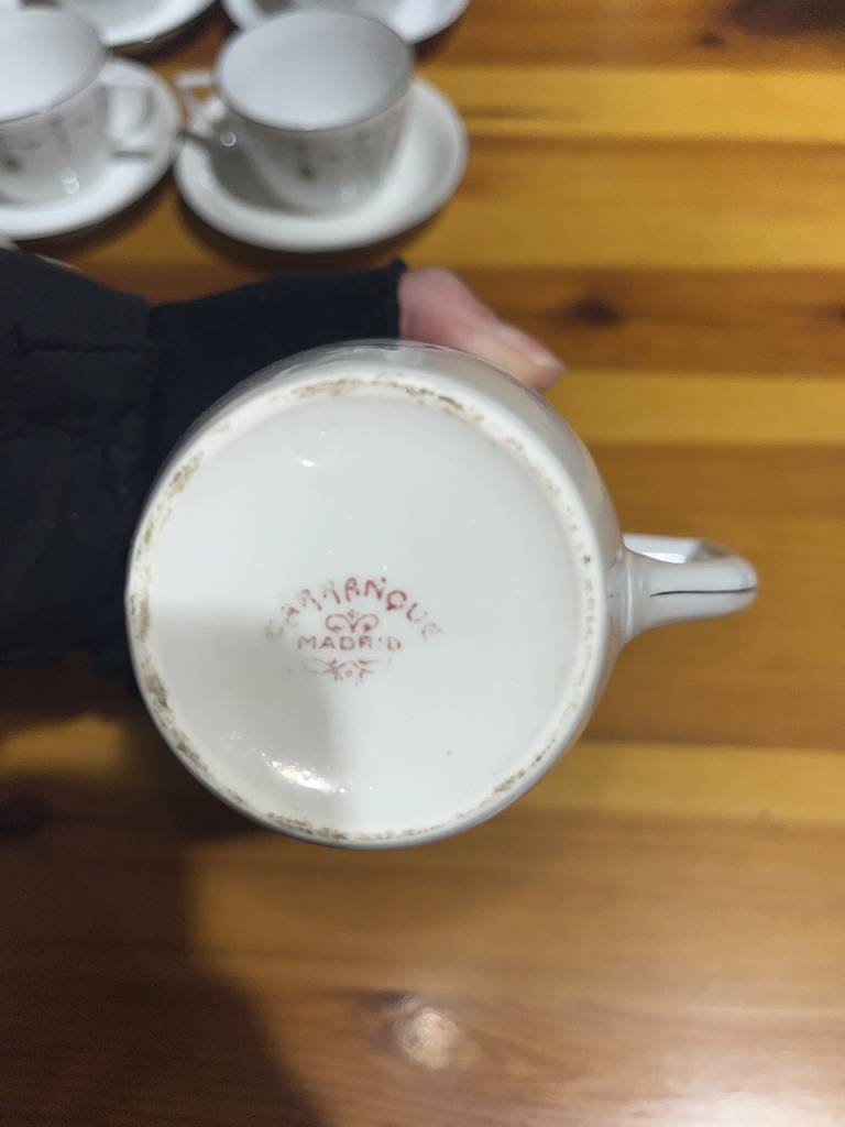 Juego de café o té de la marca Carranque que ha sido fabricado en porcelana de buena calidad. Se trata de un coqueto juego compuesto por 6 tazas con platos incluidos, una jarra, un azucarero y una lechera. Resaltan por su bonita decoración realizada con detalle. Son ideales para utilizar a la hora del café cuando recibamos invitados. Como podemos observar en las fotografías se encuentran en buenas condiciones.