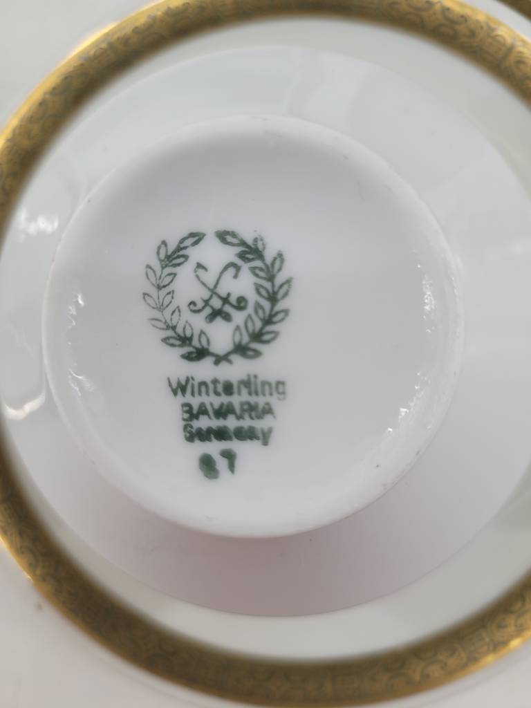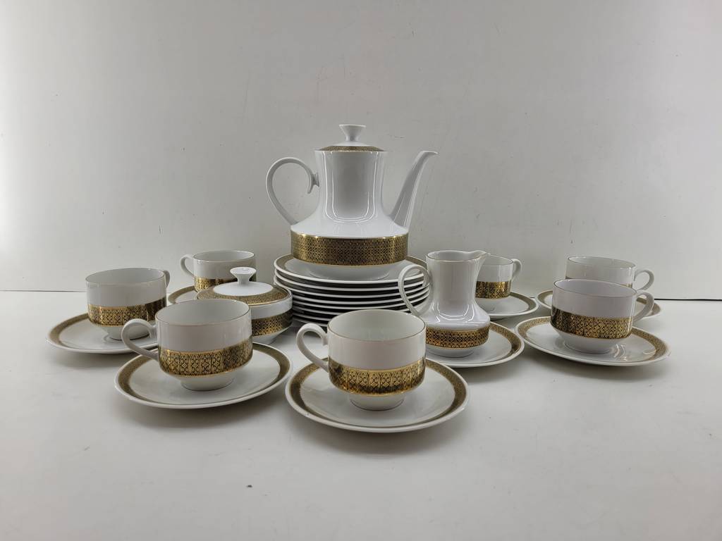 Juego de café de Bavaria compuesto por un total de siete tazas con sus platos, una jarra para la leche, un azucarero, una tetera y ocho platos medianos. Se trata de un juego de café de porcelana de color blanco con detalles dorados. Es un juego de café perfecto para tenerlo en el hogar y servir café a los invitados. Como se puede observar en las fotografías se encuentra en buenas condiciones.
