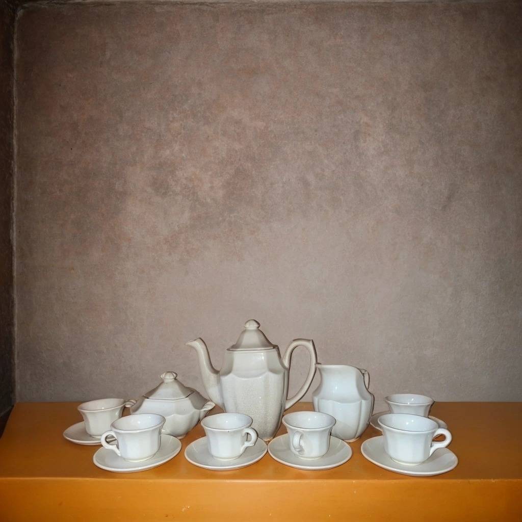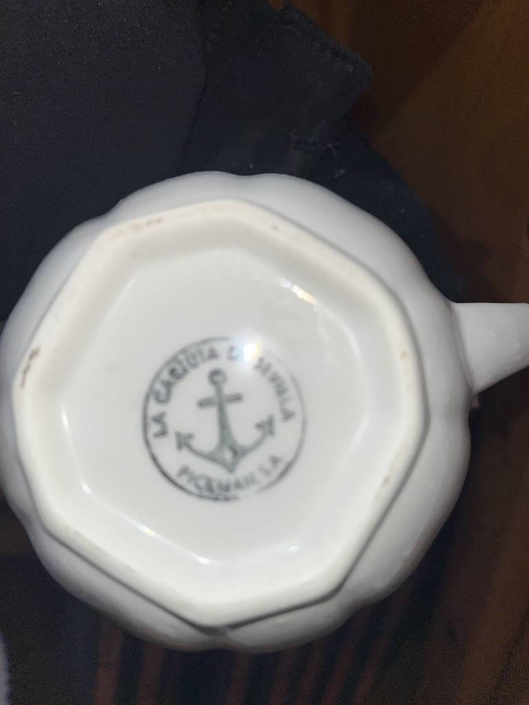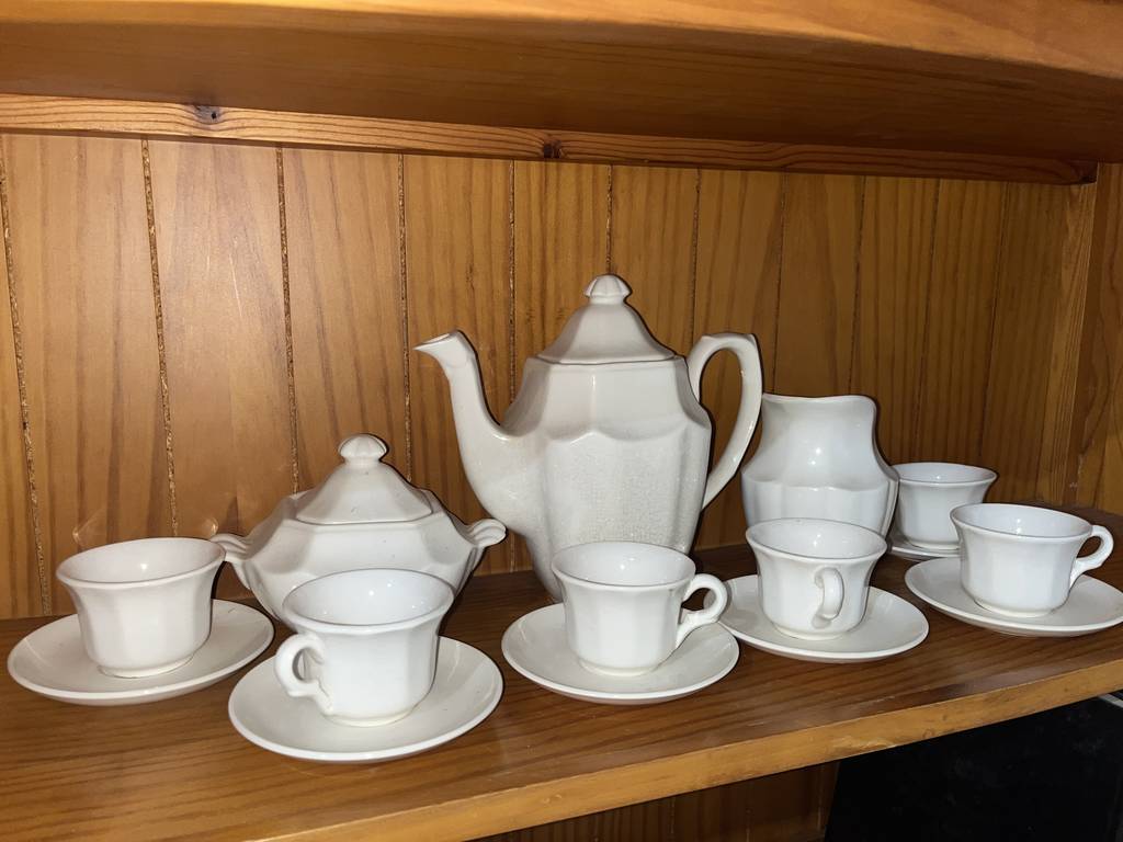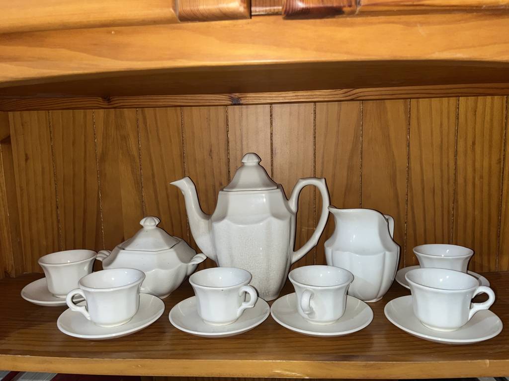 Juego de café o té de la marca La cartuja que ha sido fabricada en porcelana de buena calidad. Se trata de un coqueto juego compuesto por 6 tazas con platos incluidos, una jarra, un azucarero y una lechera. Son ideales para utilizar a la hora del café cuando recibamos invitados. Como podemos observar en las fotografías se encuentran en buenas condiciones.