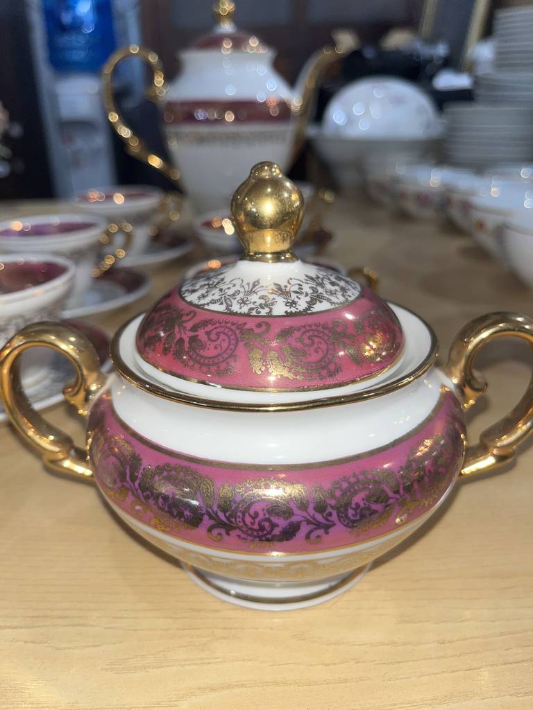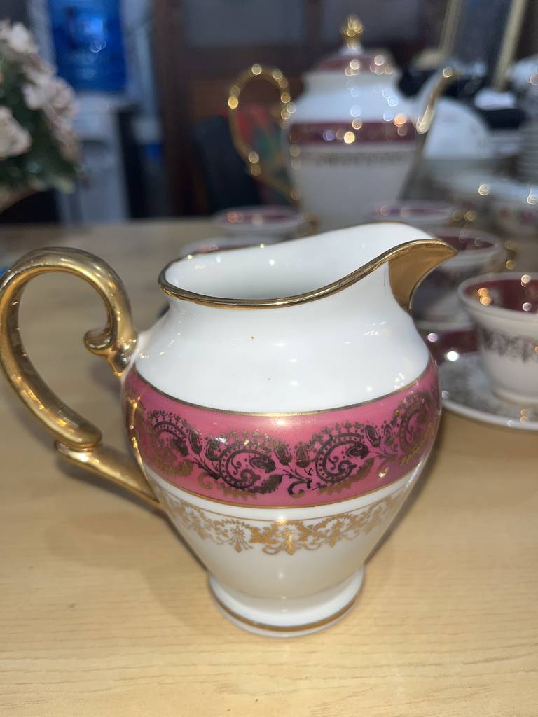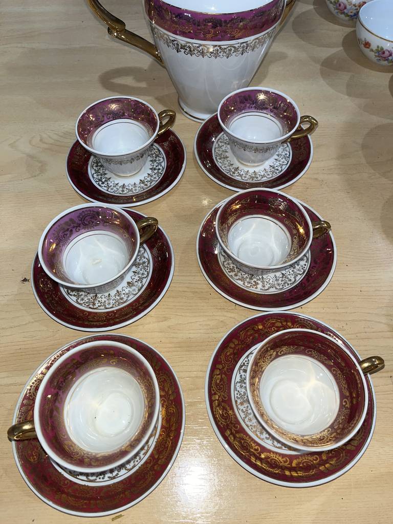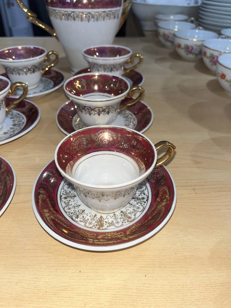 Juego de café de estilo vintage formado por seis tazas pequeñas, una lechera, una jarra en la que servir el café y un azucarero. Se trata de un juego de café completo para un total de 6 comensales, ya sea la familia o invitados que se tengan en el hogar. Es un juego completo perfecto para colocarlo en una cocina o en una vitrina en un salón comedor. Como se puede observar en las fotografías se encuentra en buenas condiciones.