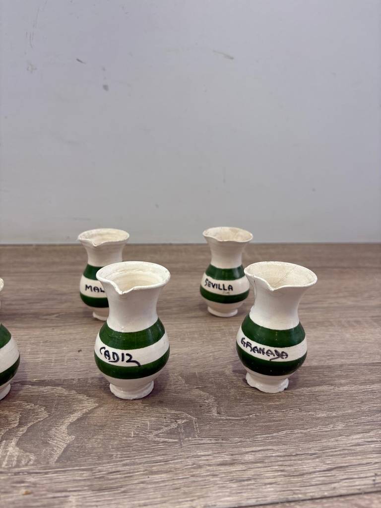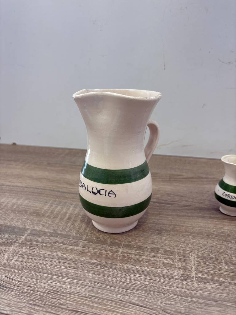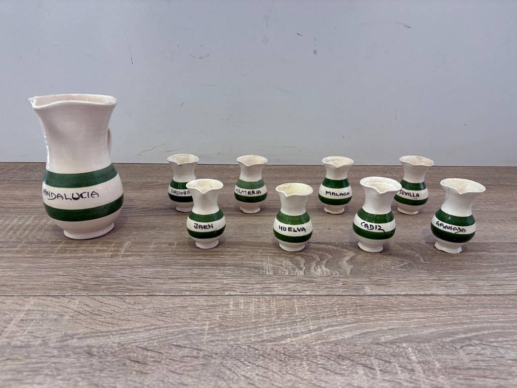 Juego de cerámica artesanal andaluza compuesto por una jarra y ocho vasitos pequeños. Se trata de un juego de cerámica de color blanco con dos franjas horizontales verdes que está compuesto por una jarra y ocho vasitos pequeños. Es un juego perfecto para lucirlo en una vitrina de un salón comedor. Como se puede observar en las fotografías se encuentra en buenas condiciones.