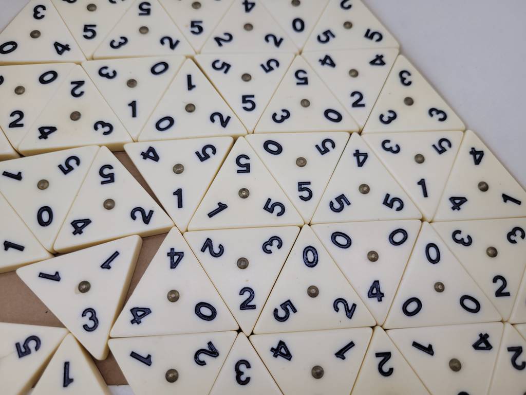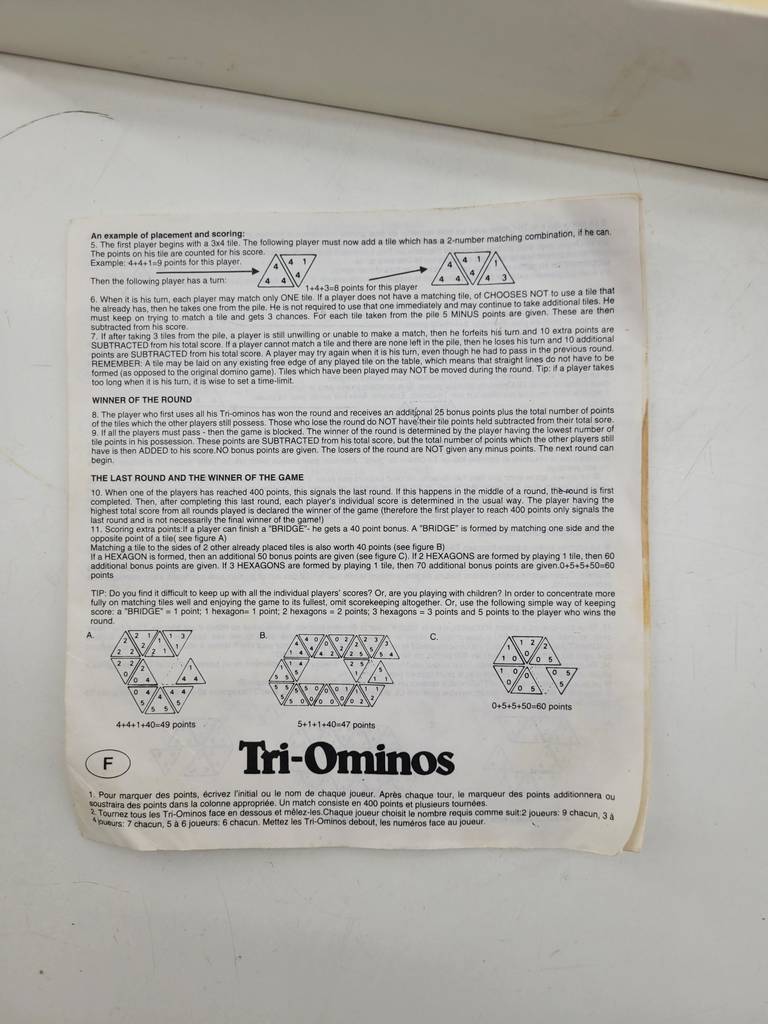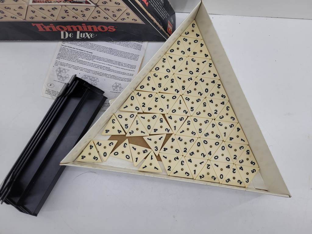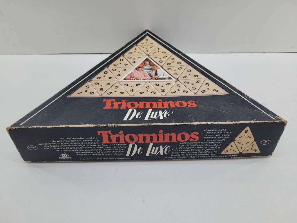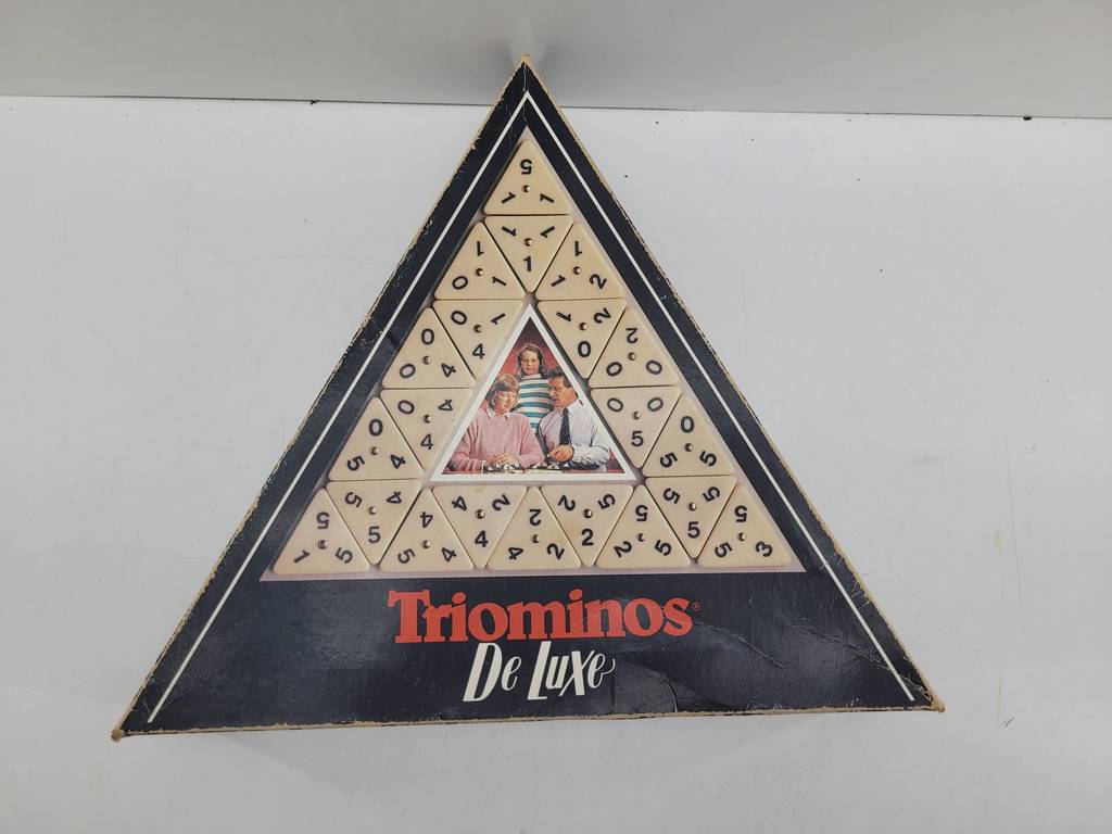 Juego clásico llamado triominos de luxe que viene en una caja triangular. Se trata de una caja con forma de triángulo en la que viene un juego clásico con multitud de fichas triangulares con números escritos en ellas. Es un juego ideal para coleccionistas de juegos clásicos o para amantes de los juegos de mesa. Como se puede observar en las fotografías se encuentra en buenas condiciones.