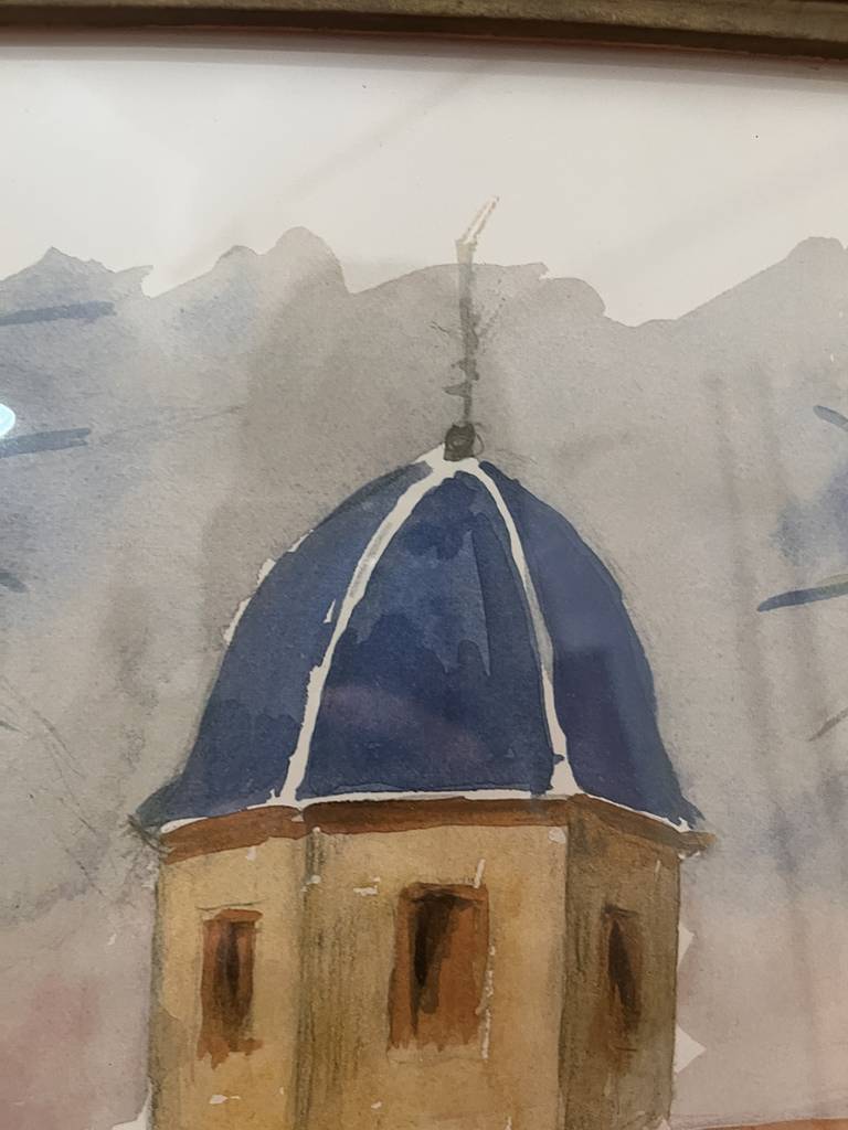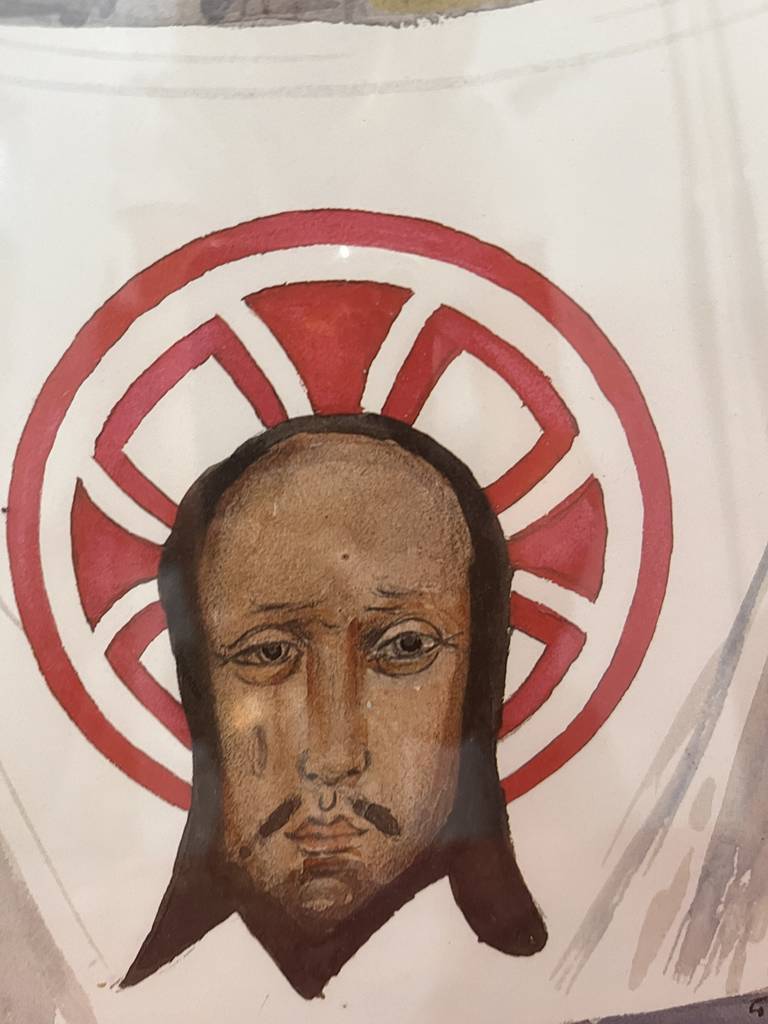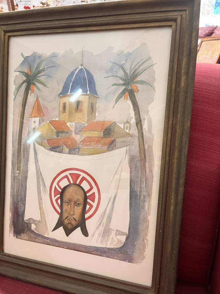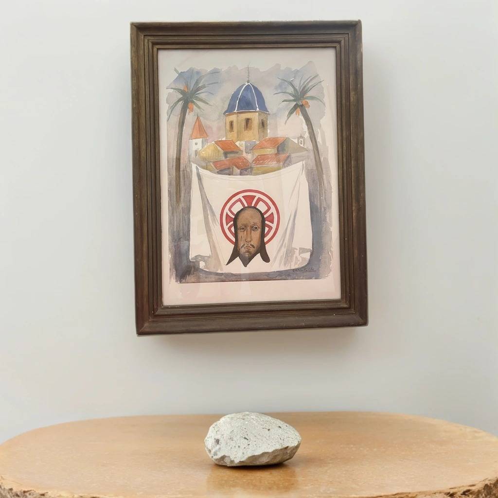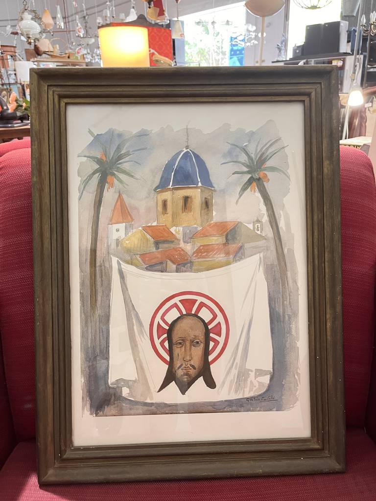 Lámina del artista Gastón Castelló que viene firmada por el autor. Se trata de una lámina que está enmarcada con un marco de madera ancho de color marrón oscuro y resulta ideal para colgarla de la pared de cualquier estancia de un hogar. La lámina refleja la imagen de una cúpula azul junto con una bandera y la cara de un hombre con barba y pelo largo. Como se puede observar en las fotografías se encuentra en buenas condiciones.