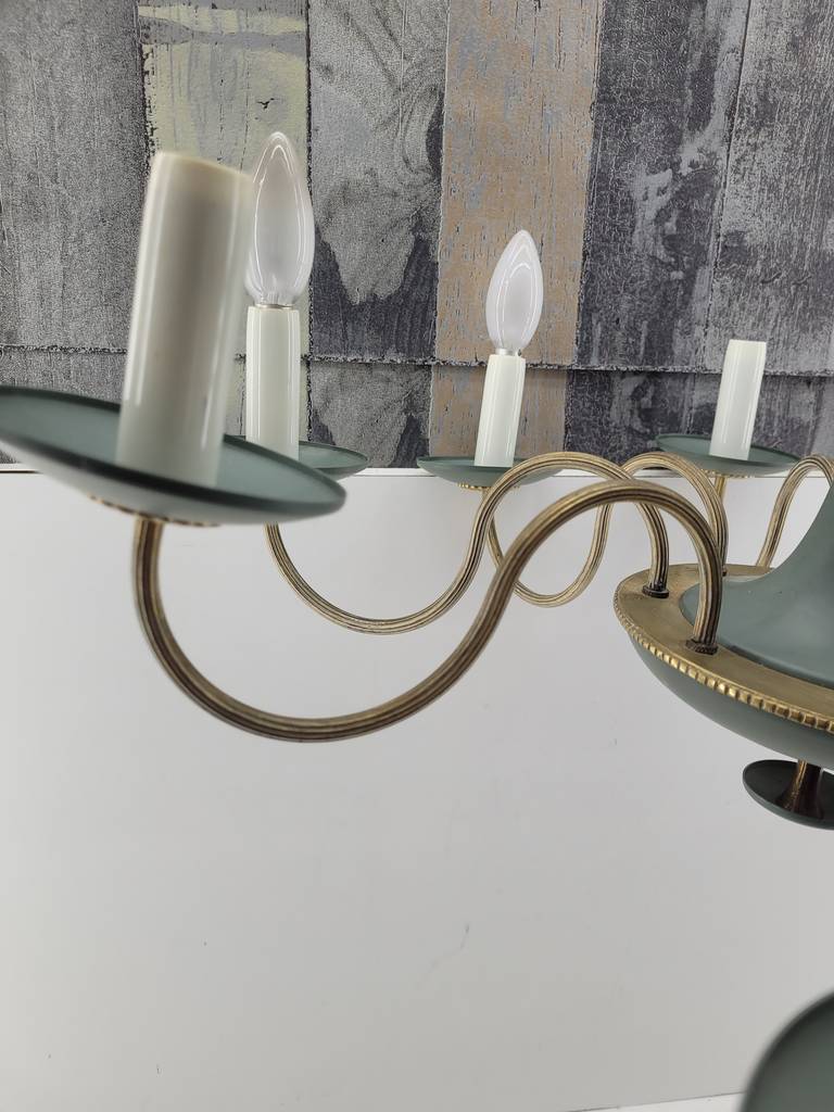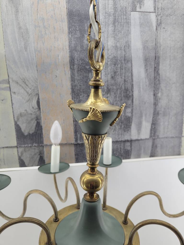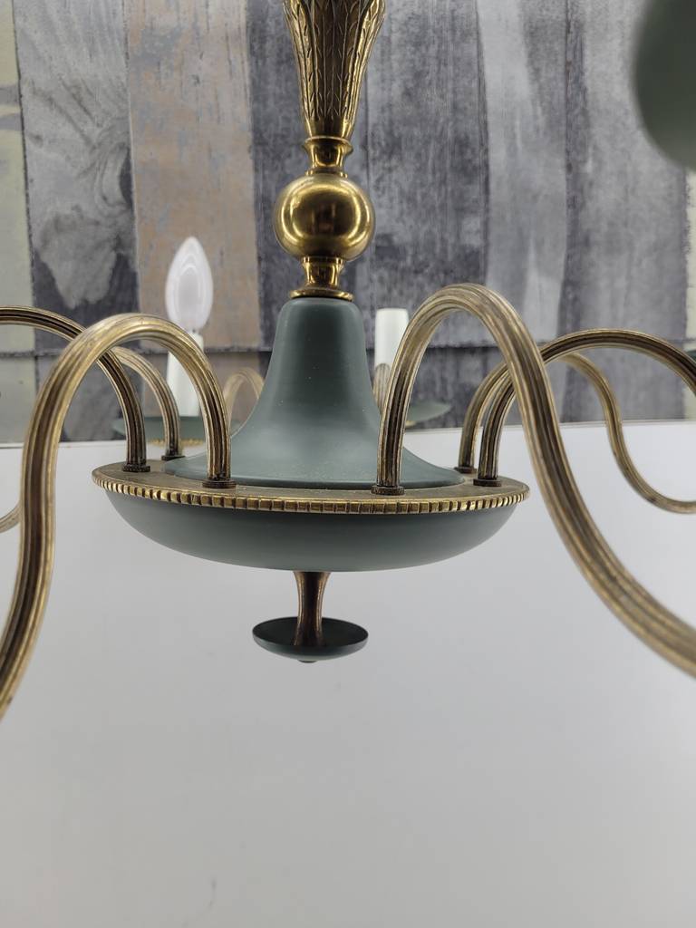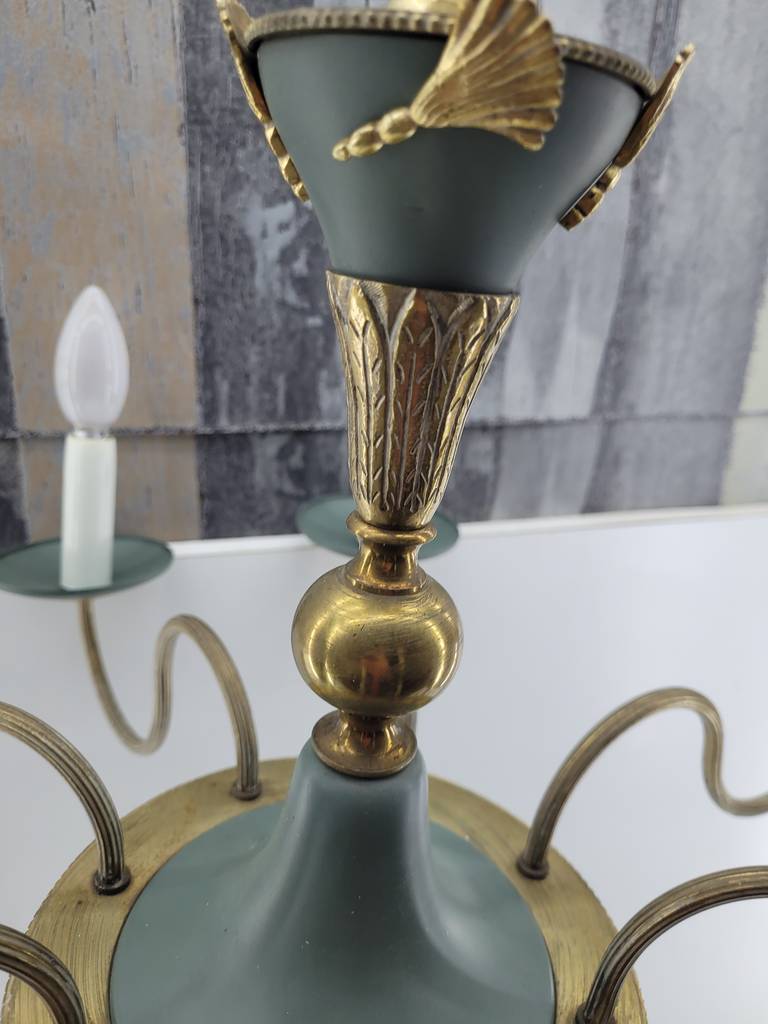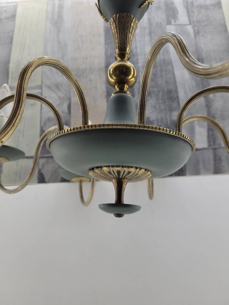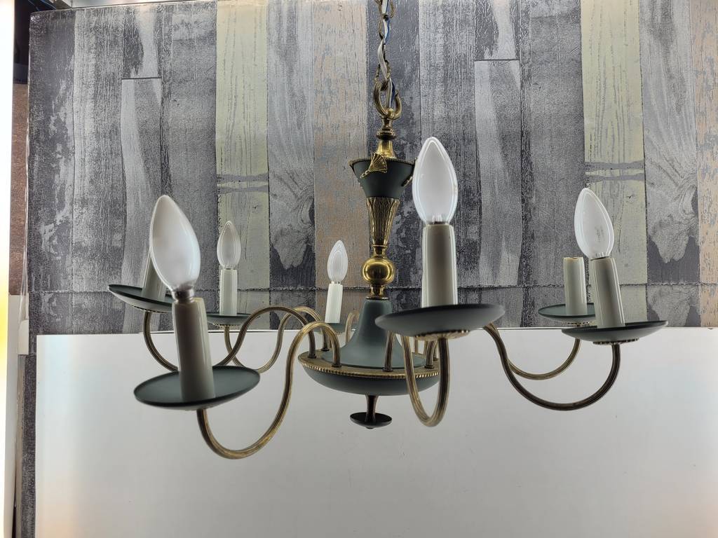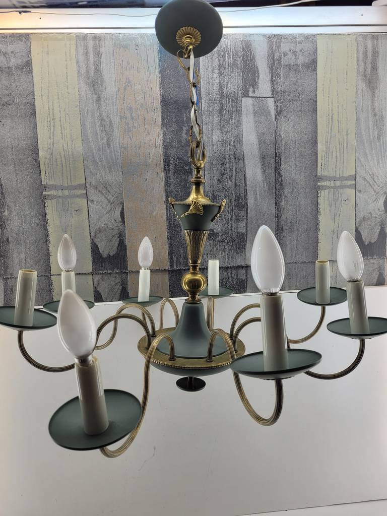 Lámpara en forma de araña de estilo art decó muy bonita y original. Se compone de una estructura con detalles en dorado que la hacen resaltar y con ocho brazos que terminan en forma de velas. Es una lámpara que aportará elegancia a nuestro salón comedor o despacho. Como podemos observar en las fotografías se encuentra en buenas condiciones.