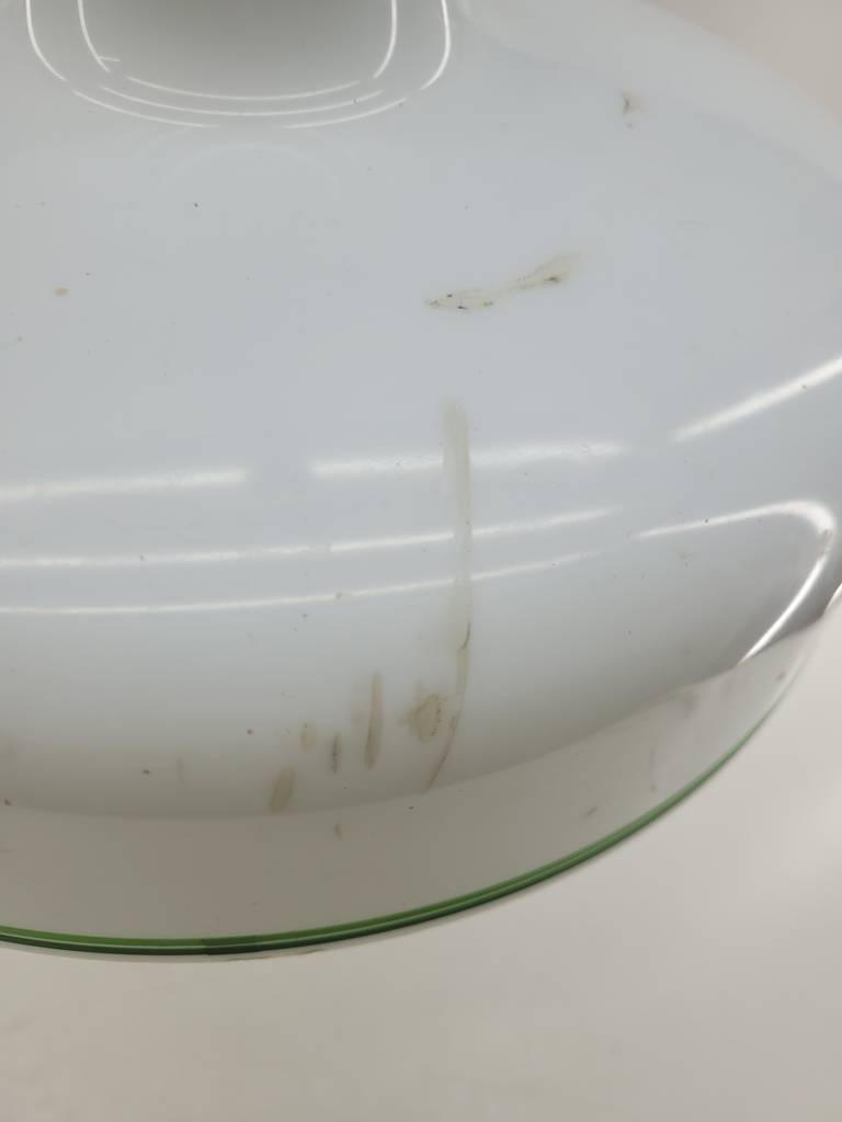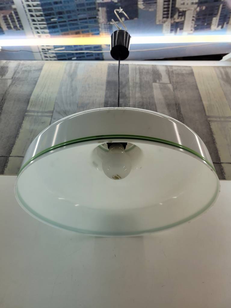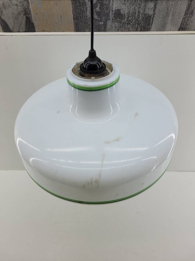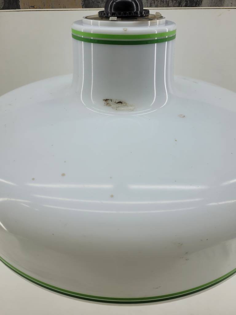 Lámpara de techo con un estilo industrial compuesta por un cable negro y una tulipa amplia en blanco esmaltado y con detalles en color verde. Es perfecta para ser colocada en cualquier tipo de estancia gracias a su diseño original. Sería ideal en un salón comedor o en un dormitorio. Como podemos observar en las fotografías presenta desperfectos.