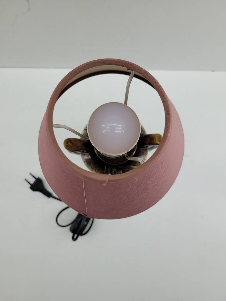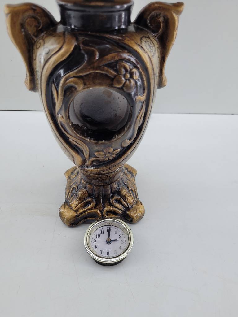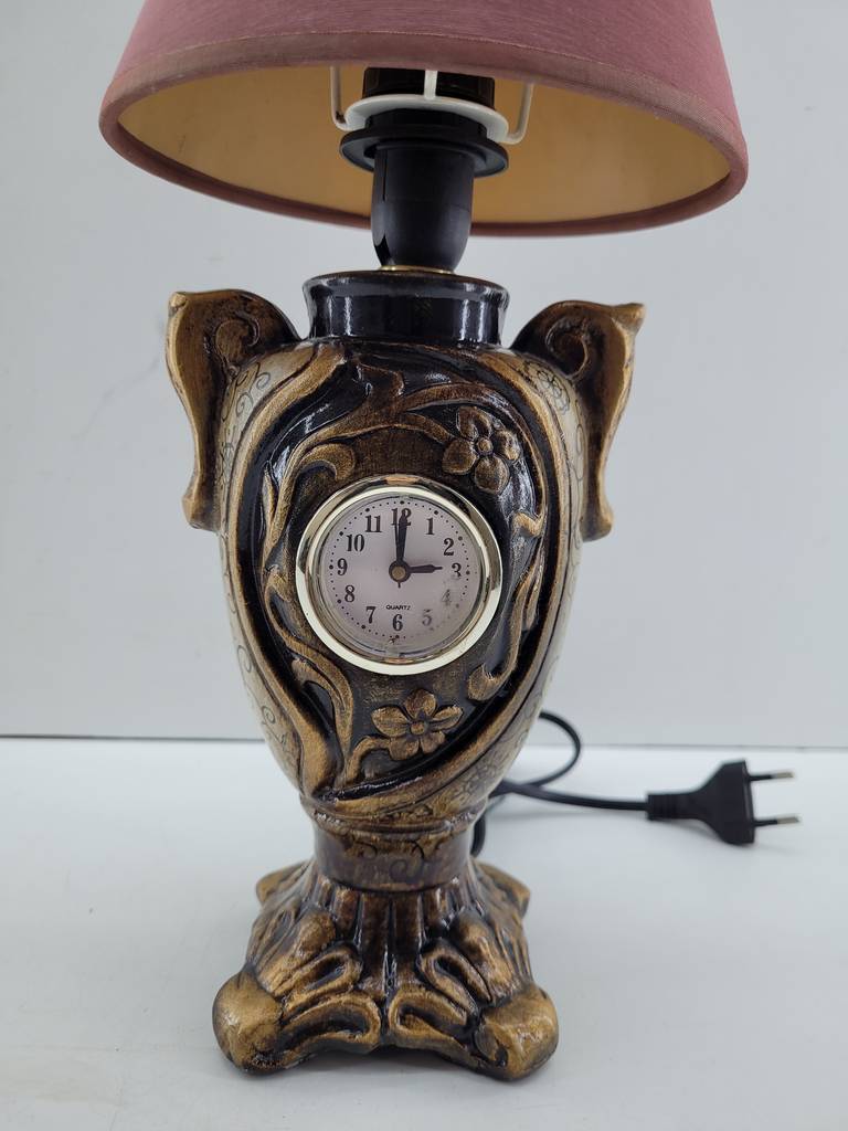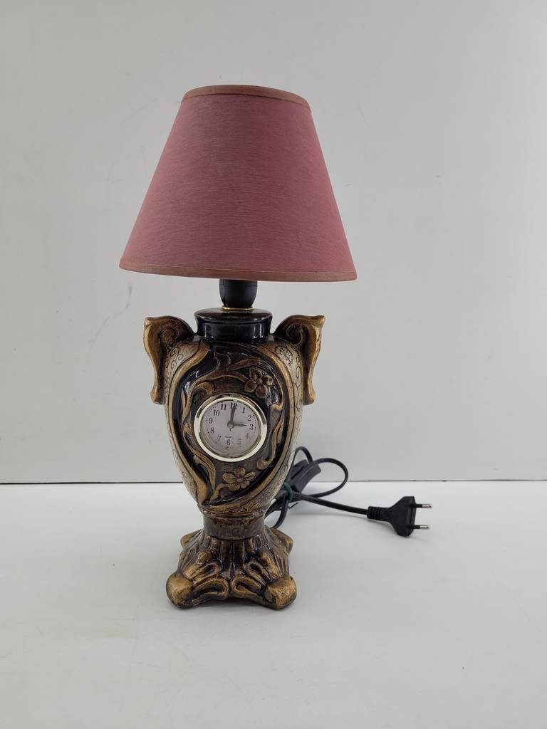 Lámpara de mesa con reloj incorporado. Se trata de una original y única lámpara de mesa que resaltará en nuestro salón comedor o dormitorio. Se compone de una base en forma de copa con asas y decoraciones realizadas con mucho detalle. En el centro se encuentra el reloj y en la parte superior una tulipa roja. Como podemos observar en las fotografías se encuentra en buenas condiciones.