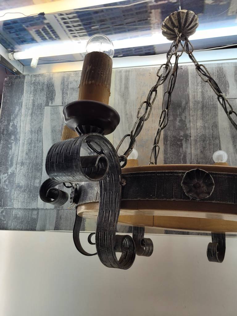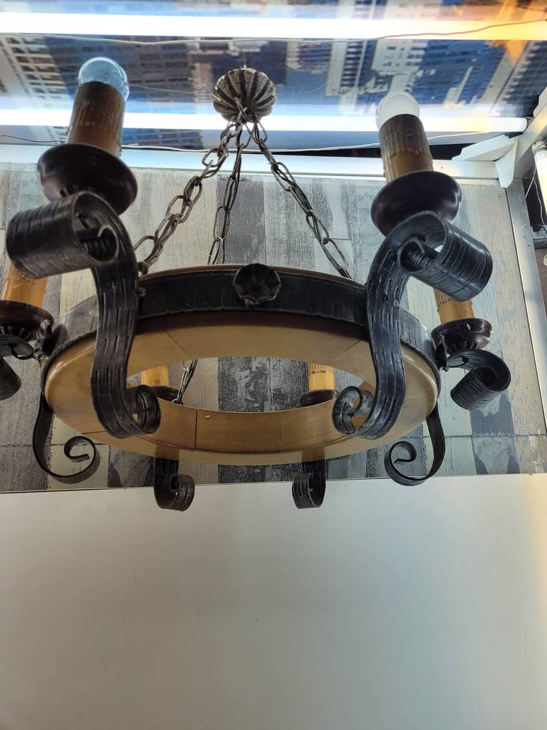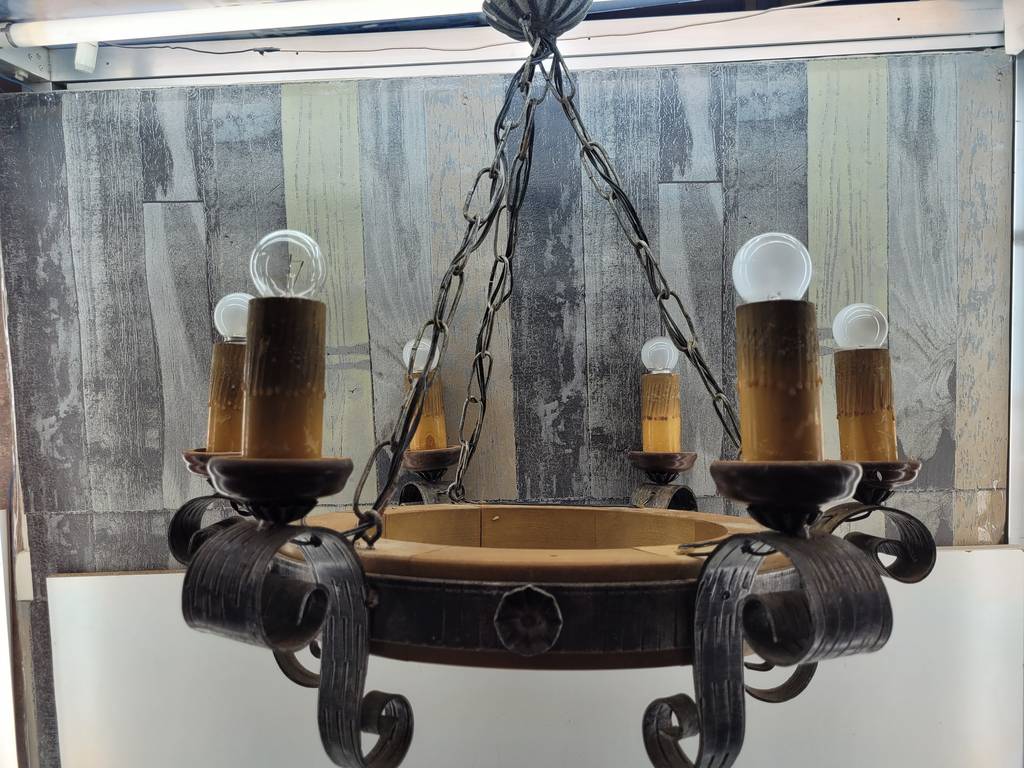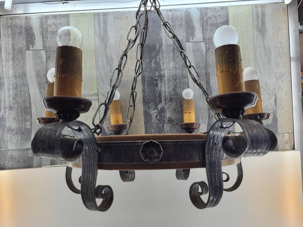 Lámpara realizada en forja de color negro y compuesta por seis puntos de luz a modo de velas y con seis bombillas superiores. Se trata de una lámpara muy elegante y única con un diseño que la hace resaltar, sus detalles y formas la hacen ideal para colocar en un salón comedor con techos altos. Como podemos observar en las fotografías presenta desgaste pero funciona correctamente.