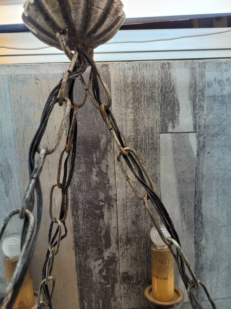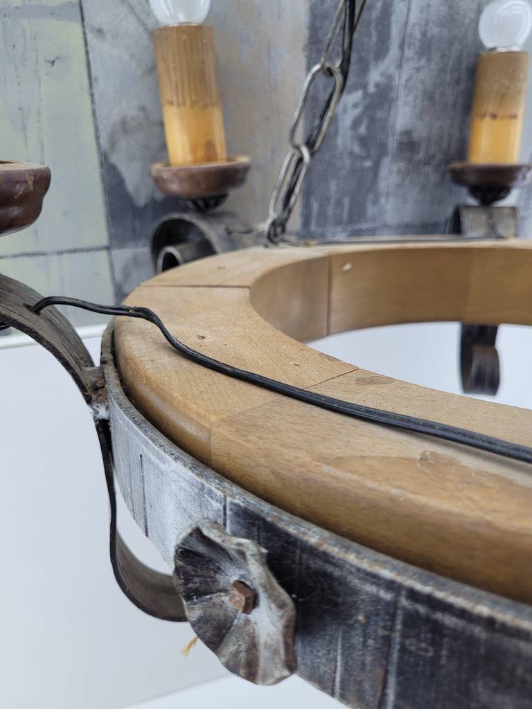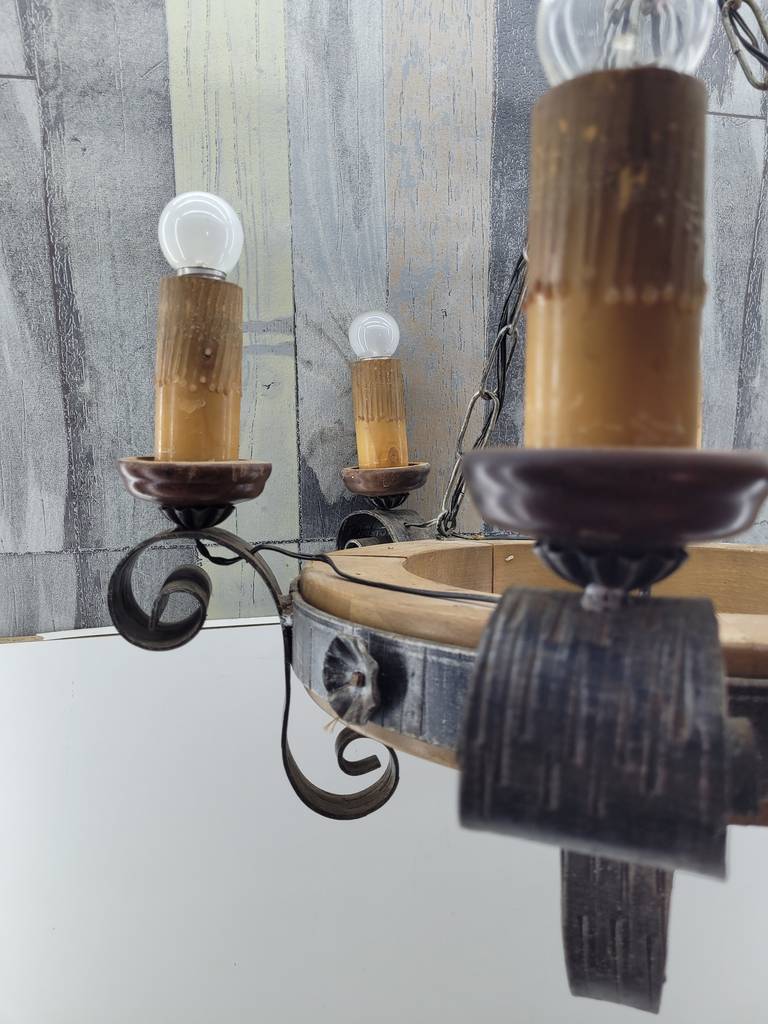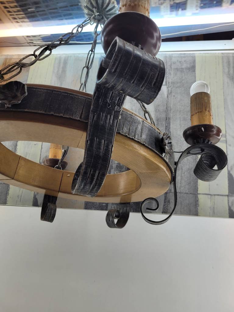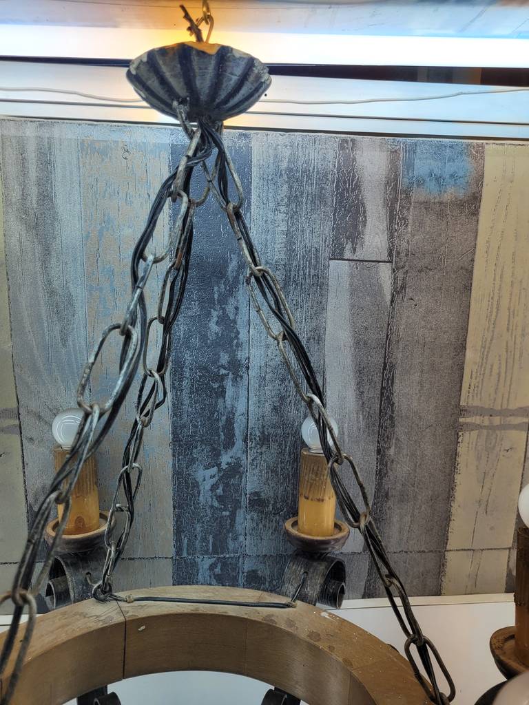Lámpara realizada en forja de color negro y compuesta por seis puntos de luz a modo de velas y con seis bombillas superiores. Se trata de una lámpara muy elegante y única con un diseño que la hace resaltar, sus detalles y formas la hacen ideal para colocar en un salón comedor con techos altos. Como podemos observar en las fotografías presenta desgaste pero funciona correctamente.