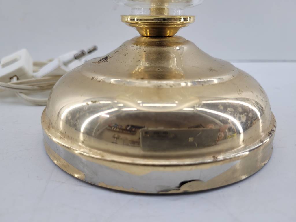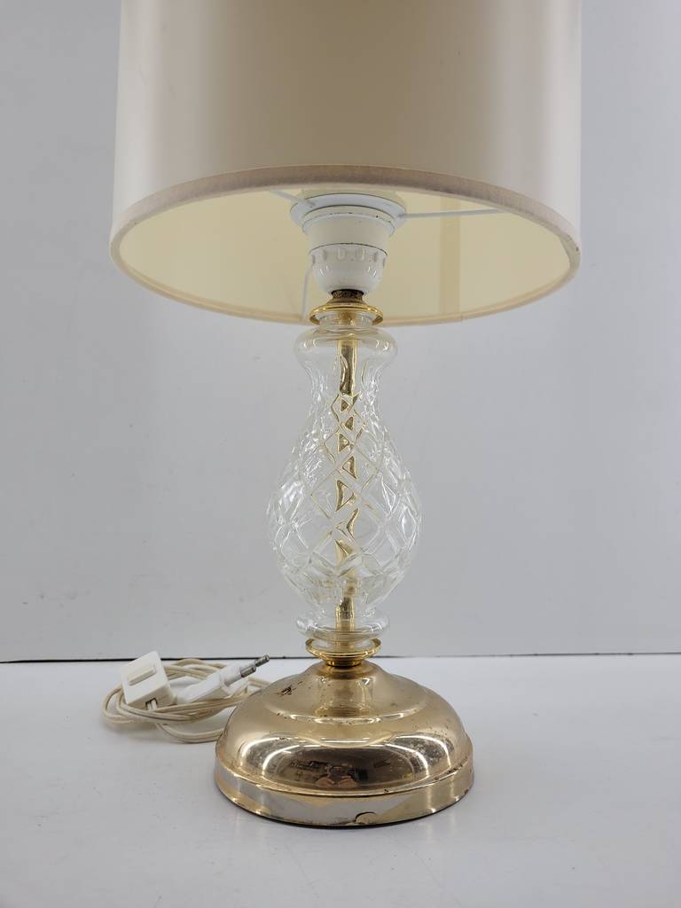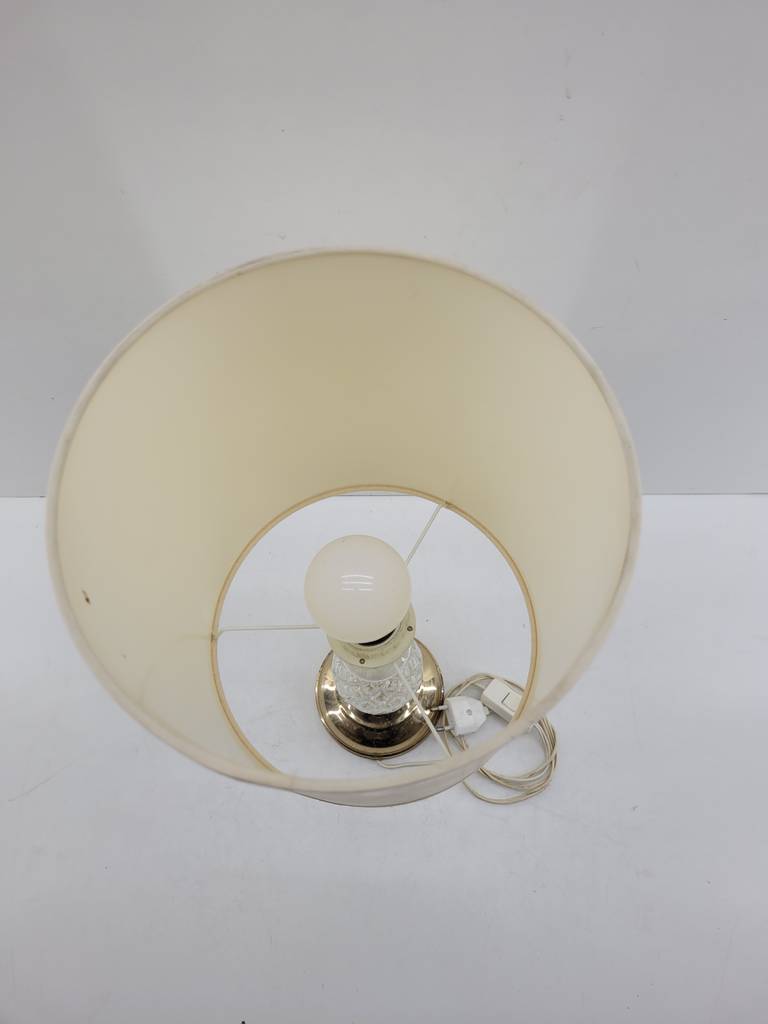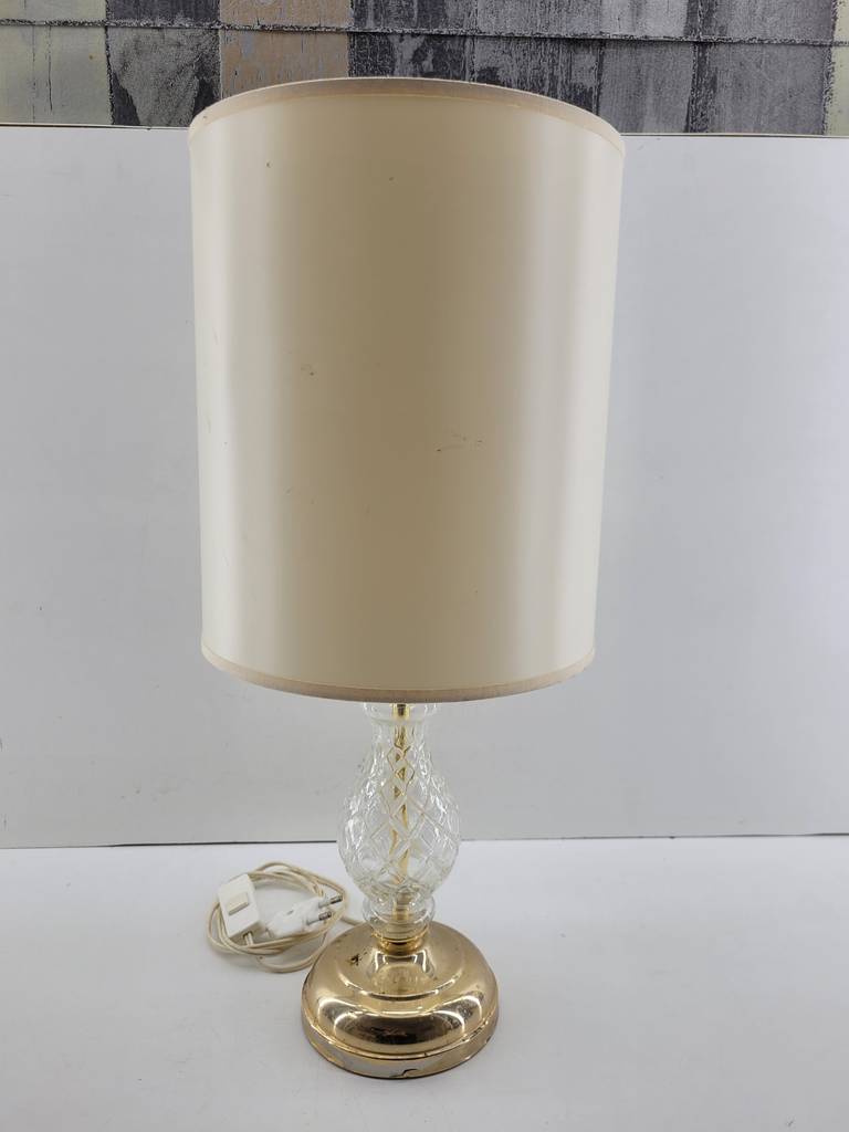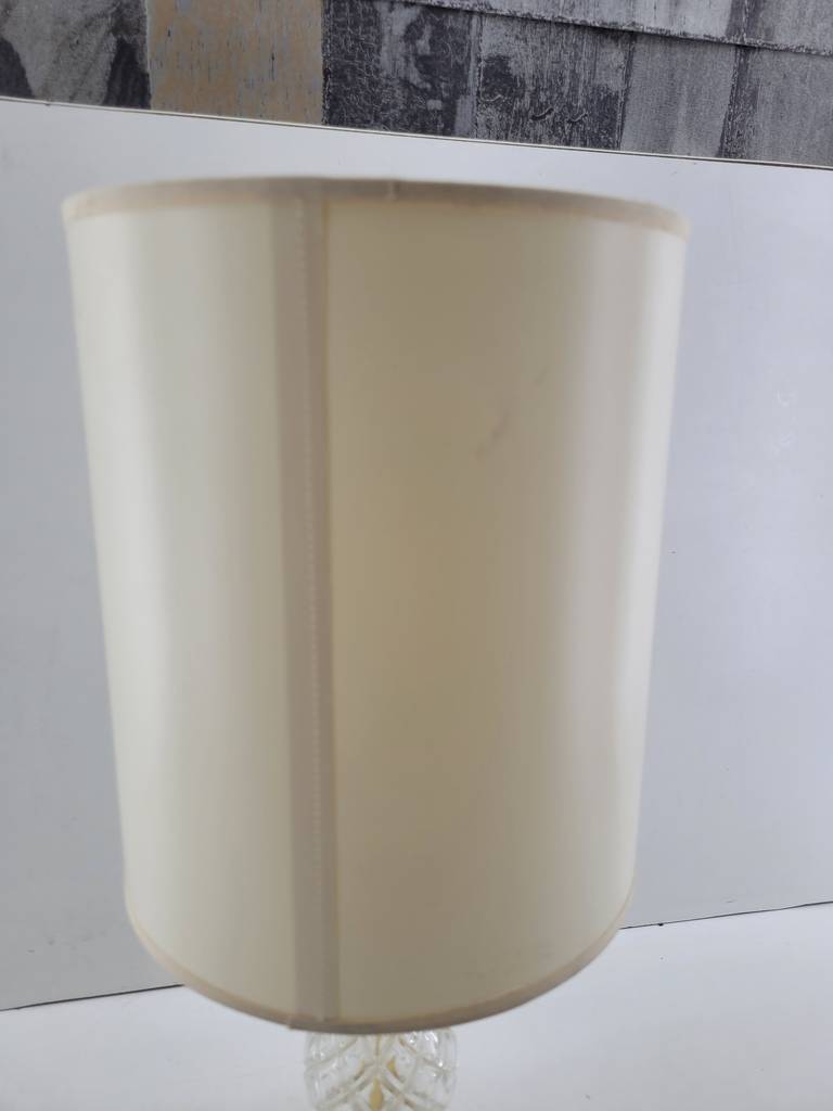 Lámpara de mesa cuya estructura está fabricada en cristal tallado de buena calidad. Se trata de una lámpara que tiene una base redonda y cuenta con una tulipa de gran tamaño con una forma cilíndrica de color beige. Es una lámpara perfecta para colocarla encima de una mesa en un salón comedor. Como se puede observar en las fotografías se encuentra en buenas condiciones.