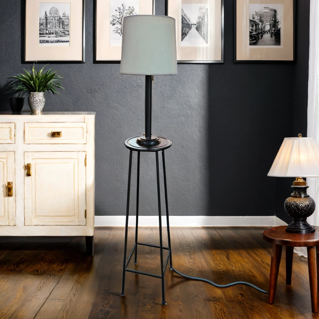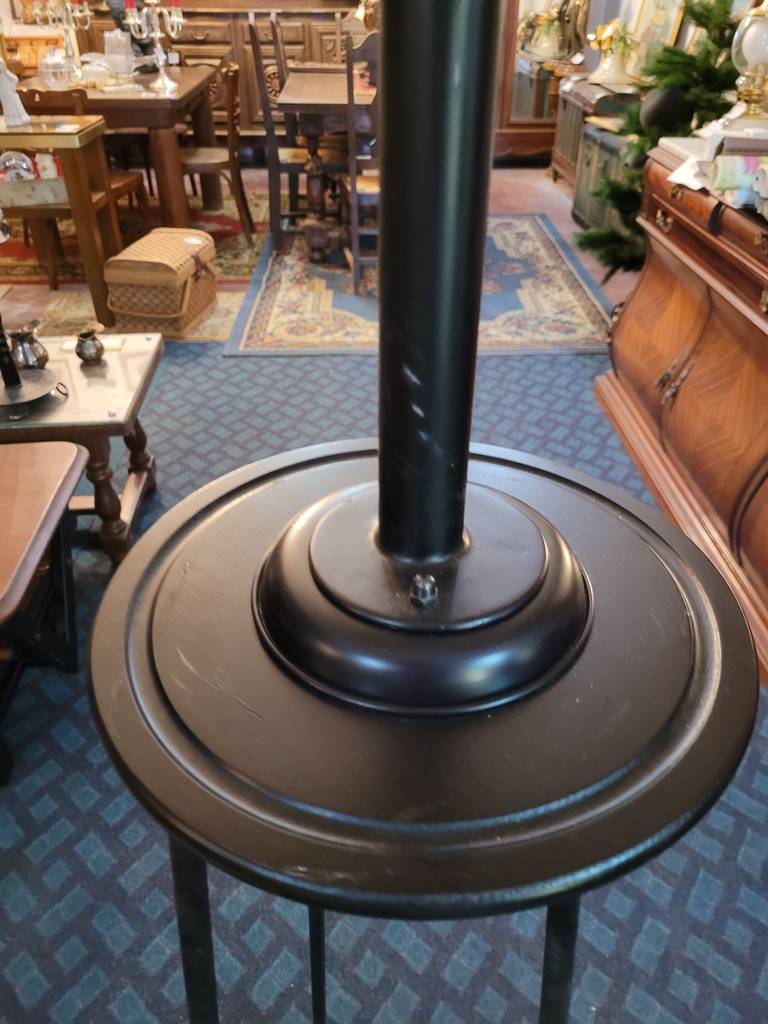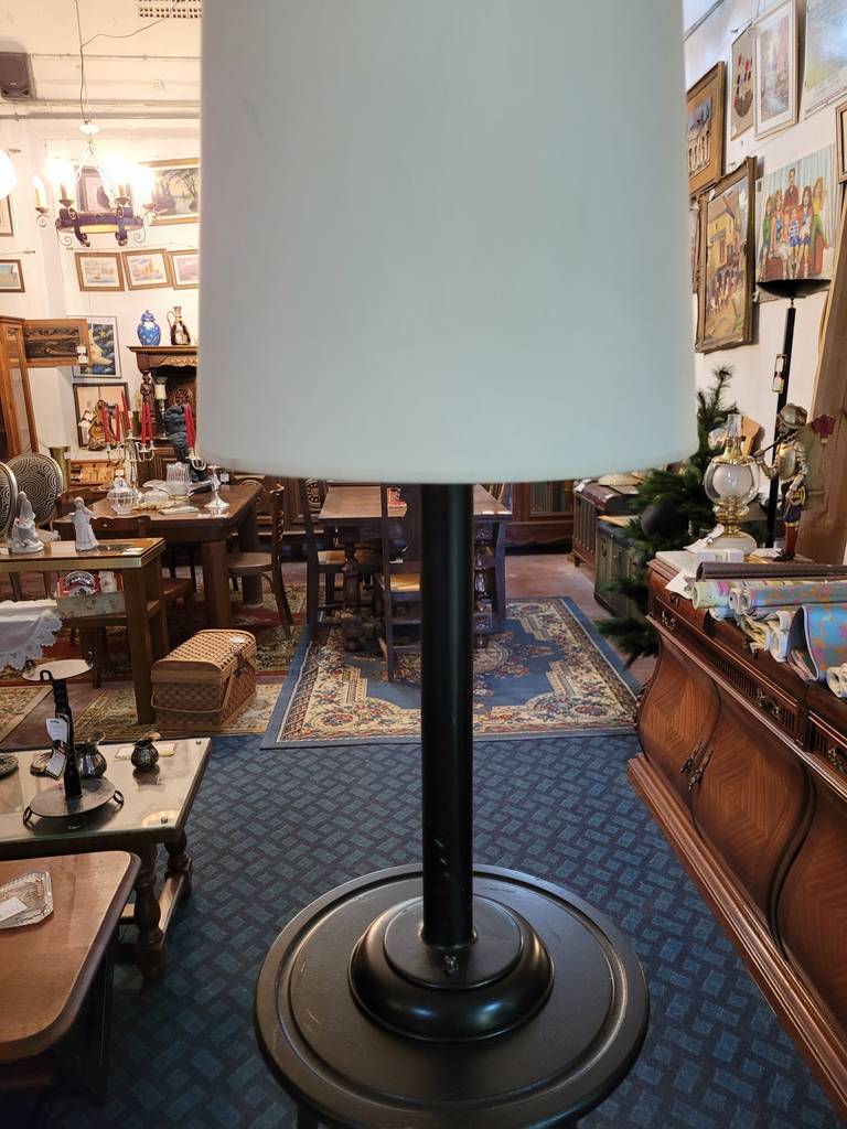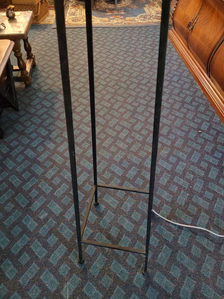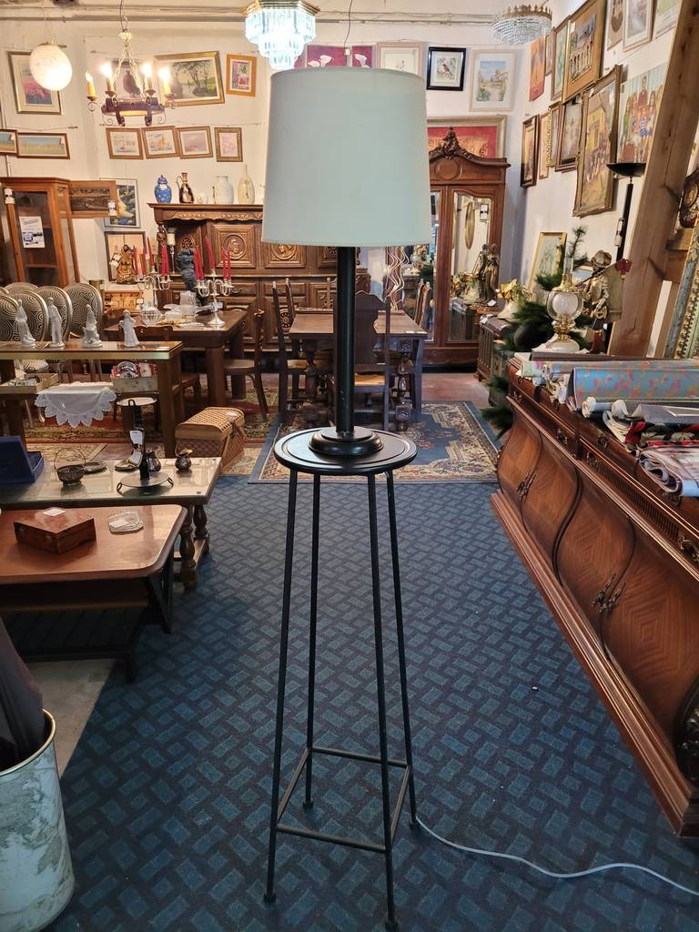 Lámpara de pie de estatura alta con una estructura metálica de color negro. Se trata de una lámpara de pie que tiene una estructura con cuatro patas y cuenta con una tulipa cilíndrica de color crema. Es una lámpara perfecta para colocarla en un salón comedor al lado de un sofá. Como se puede observar en las fotografías se encuentra en buenas condiciones.