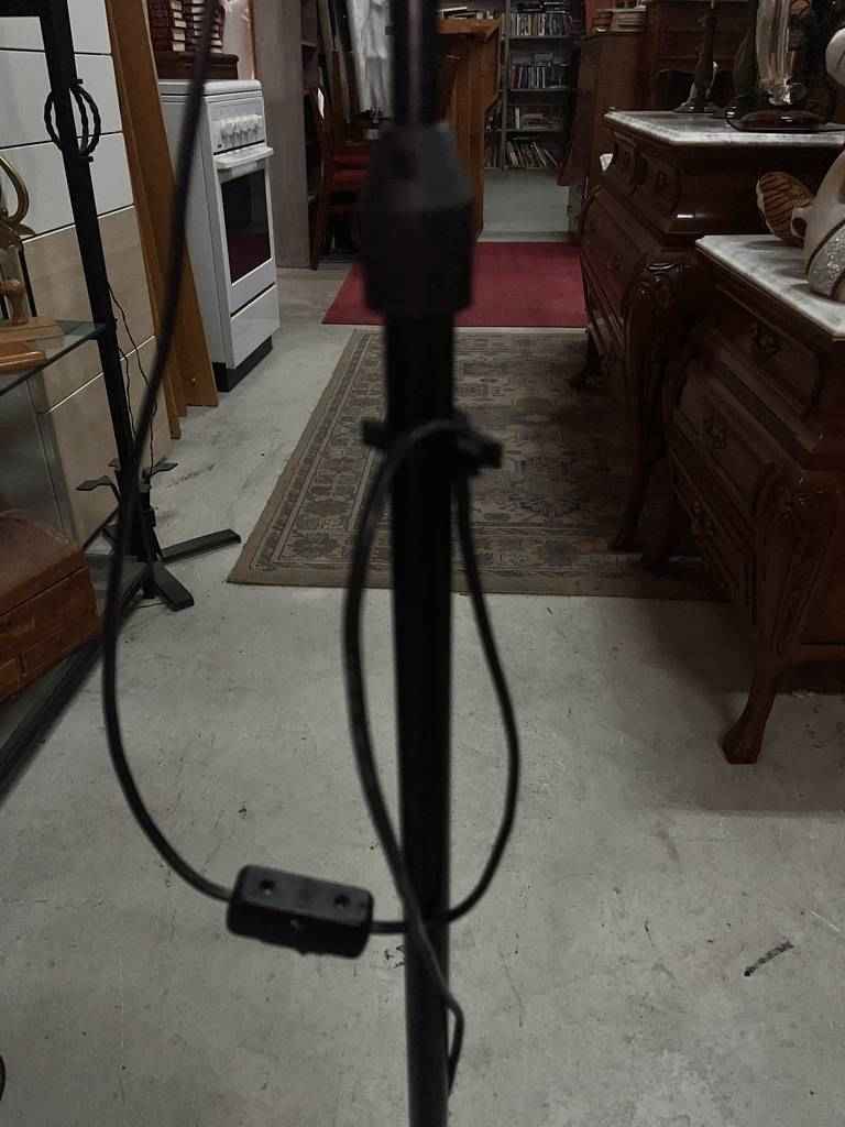Lámpara de pie con dos focos de color negro. Se trata de una lámpara de pie que cuenta con dos grandes focos, cada uno mira hacia un lado diferente. Es una lámpara ideal para colocarla en un salón comedor al lado de un sofá para alumbrar la estancia de manera tenue. Como se puede observar en las fotografías se encuentra en buenas condiciones para ser utilizada.