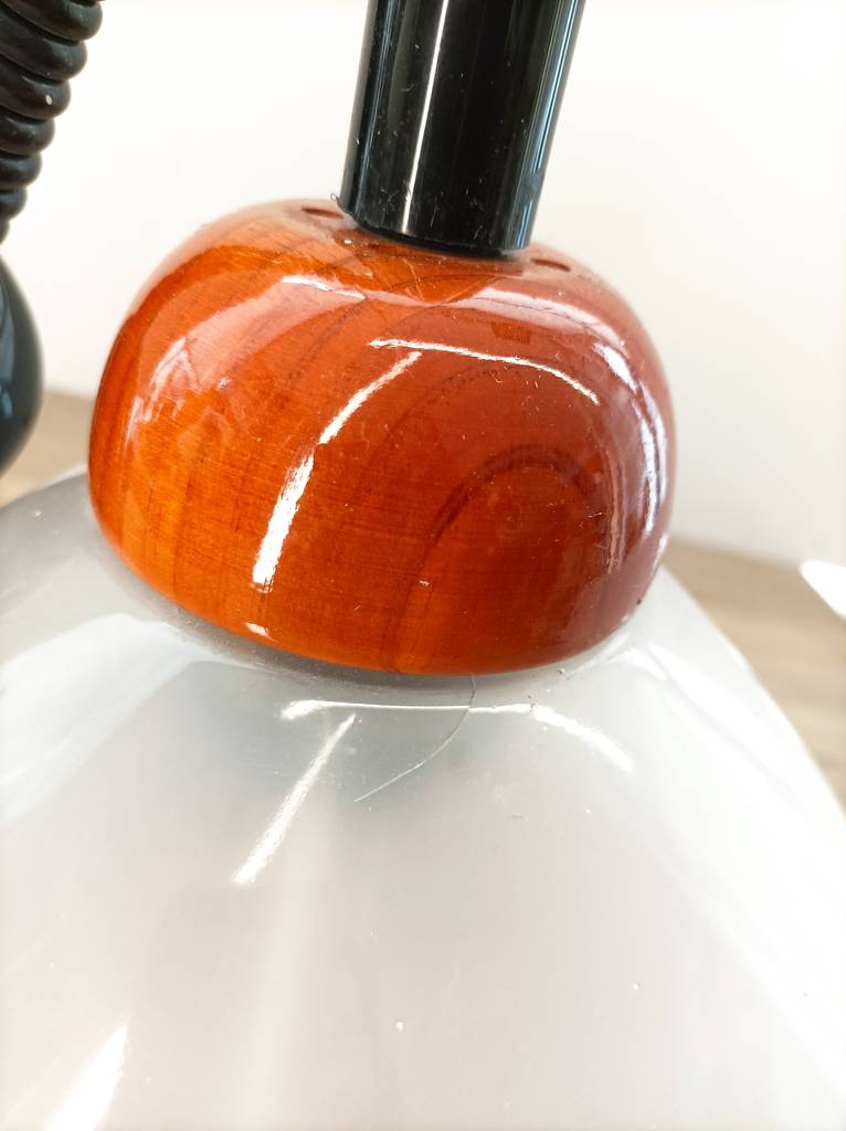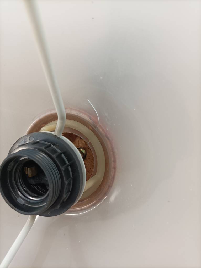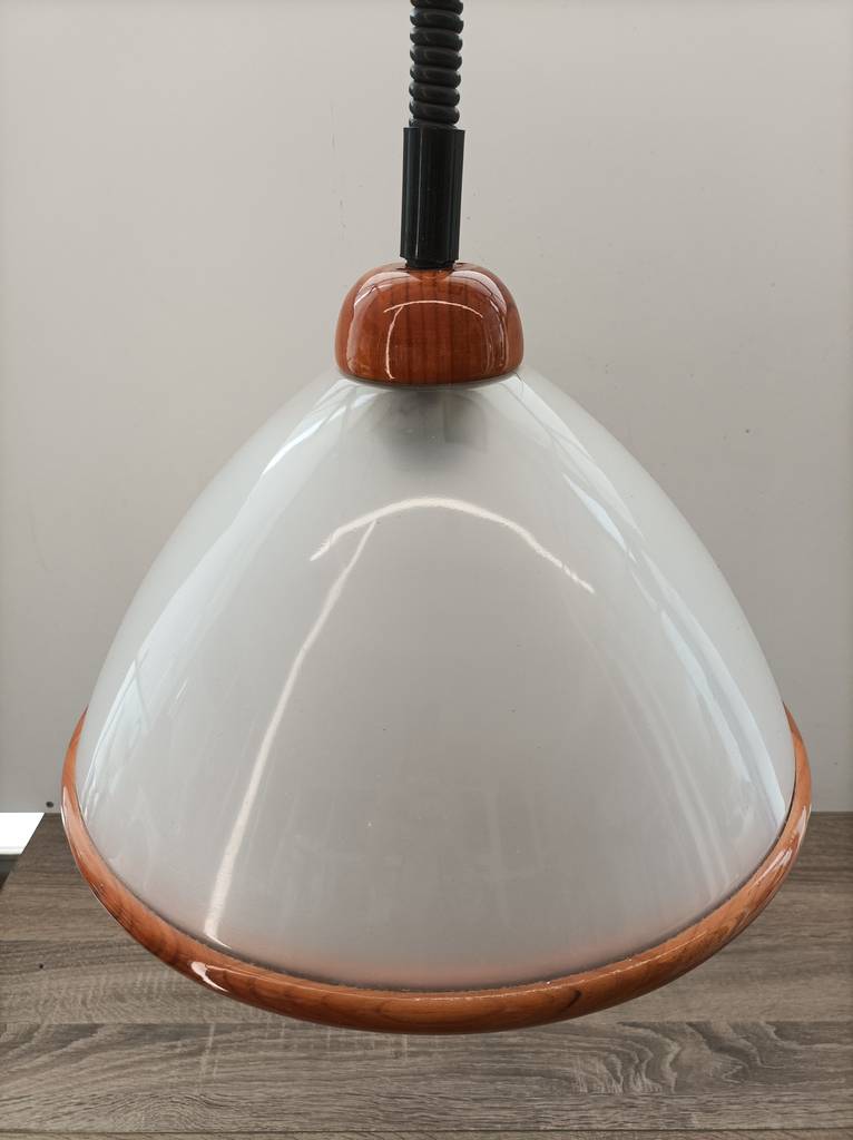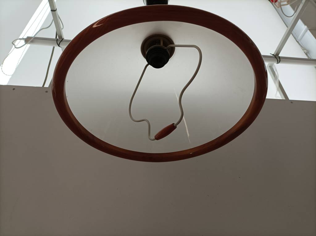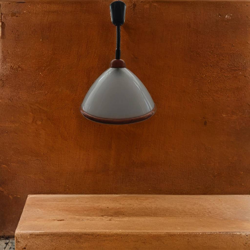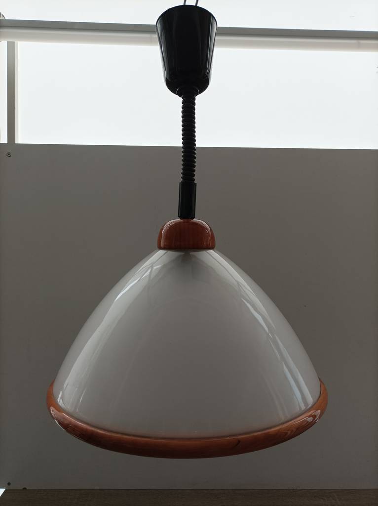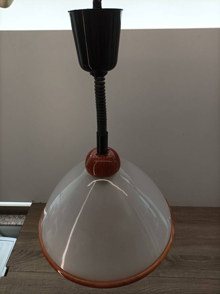 Lámpara de techo colgante de estilo moderno y actual de color blanco y marrón. Se trata de una lámpara de techo que tiene una tulipa ancha y cuelga de un soporte de color negro. Es una lámpara ideal para colgarla de cualquier techo de nuestro hogar, ya que aportará luz y calidez a la estancia. Como se puede observar en las fotografías se encuentra en buenas condiciones para ser utilizada.