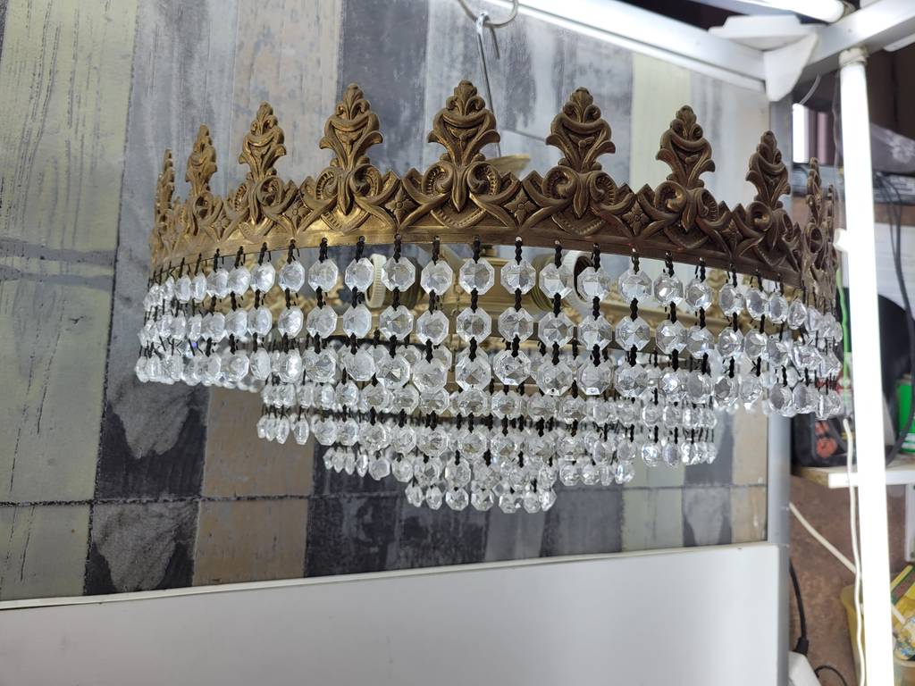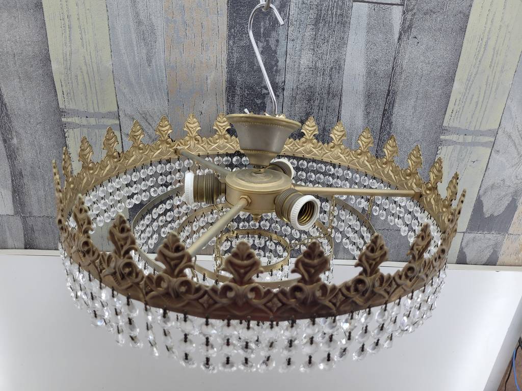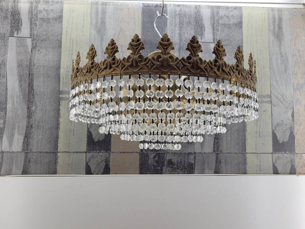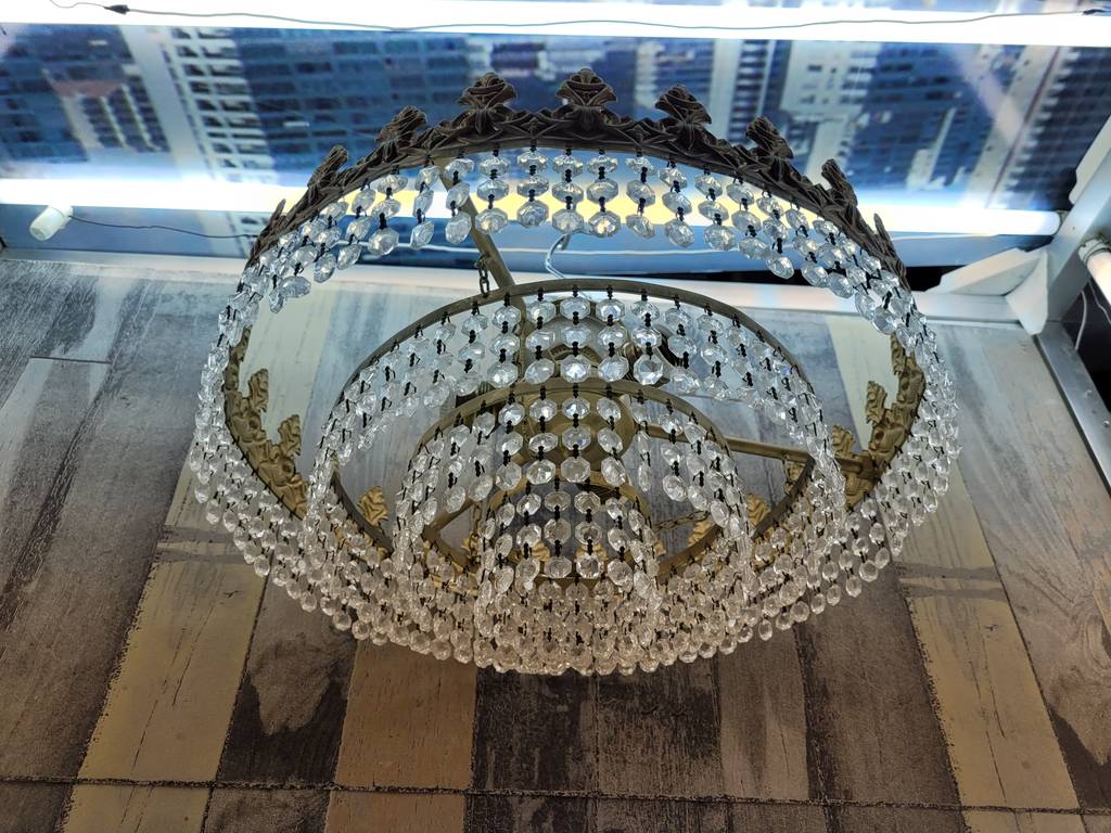Lámpara de techo de estilo elegante cuya estructura es metálica de color dorado y cuenta con unos cristales colgantes en forma de lágrima geométrica. Se trata de una bonita lámpara de techo de gran tamaño que resulta ideal para colocarla en el techo de un salón comedor de estilo clásico. Como se puede observar en las distintas fotografías la lámpara se encuentra en buenas condiciones.