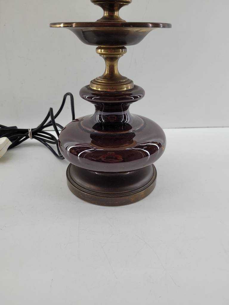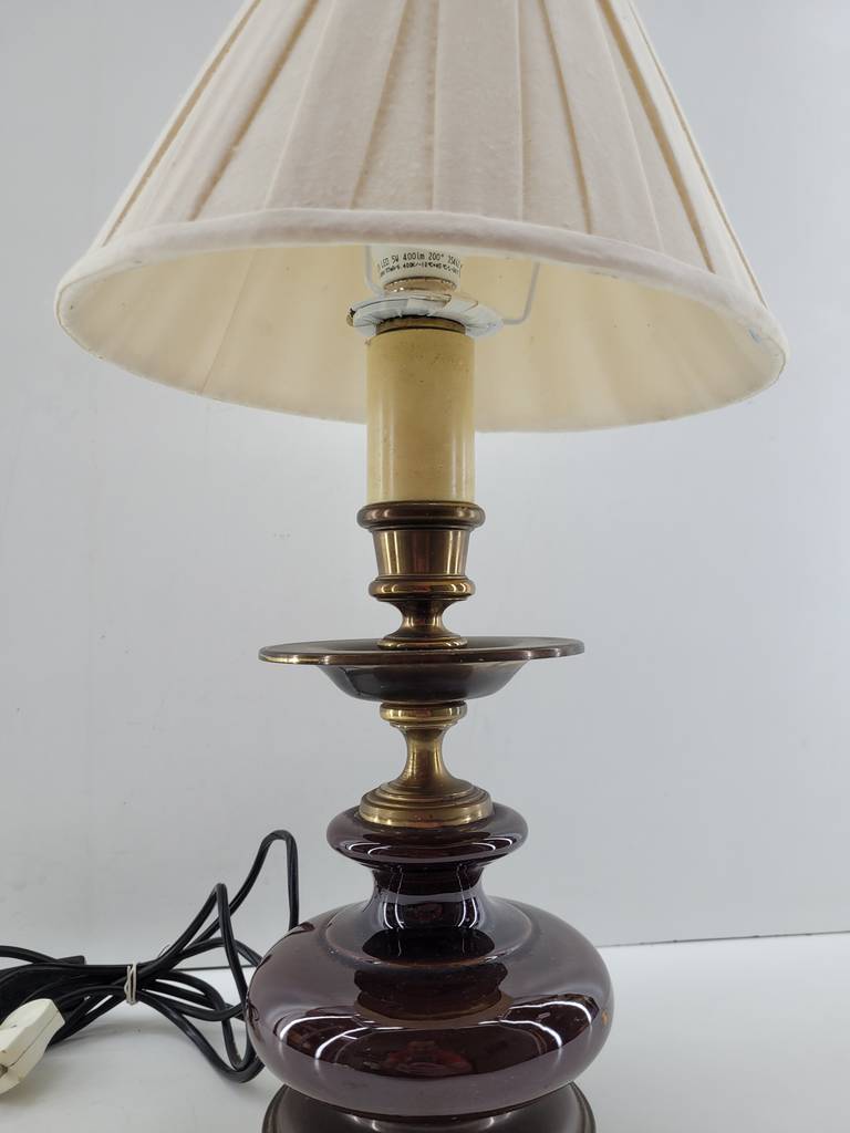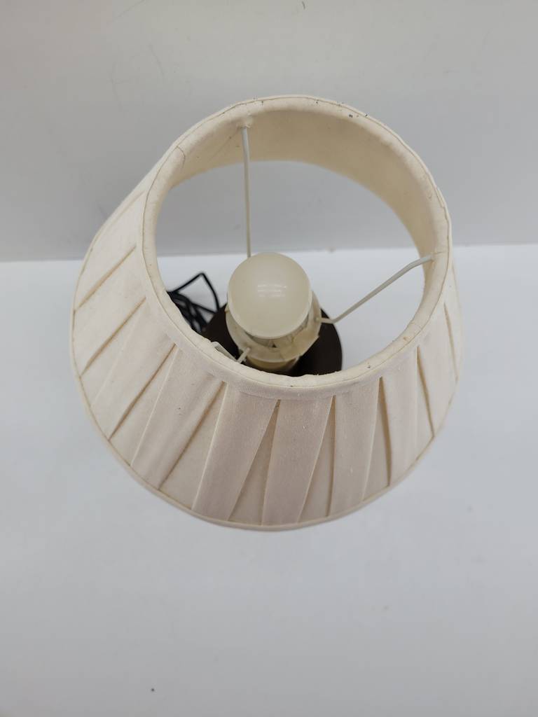 Lámpara de mesa de estilo vintage con una estructura de color marrón oscuro y una tulipa de color blanco. Se trata de una lámpara de mesa que tiene un estilo clásico y resulta ideal para colocarla encima de una mesa en un salón comedor o encima de una mesita de noche en un dormitorio. Como se puede observar en las fotografías se encuentra en buenas condiciones.