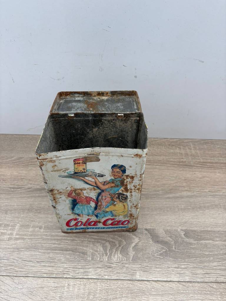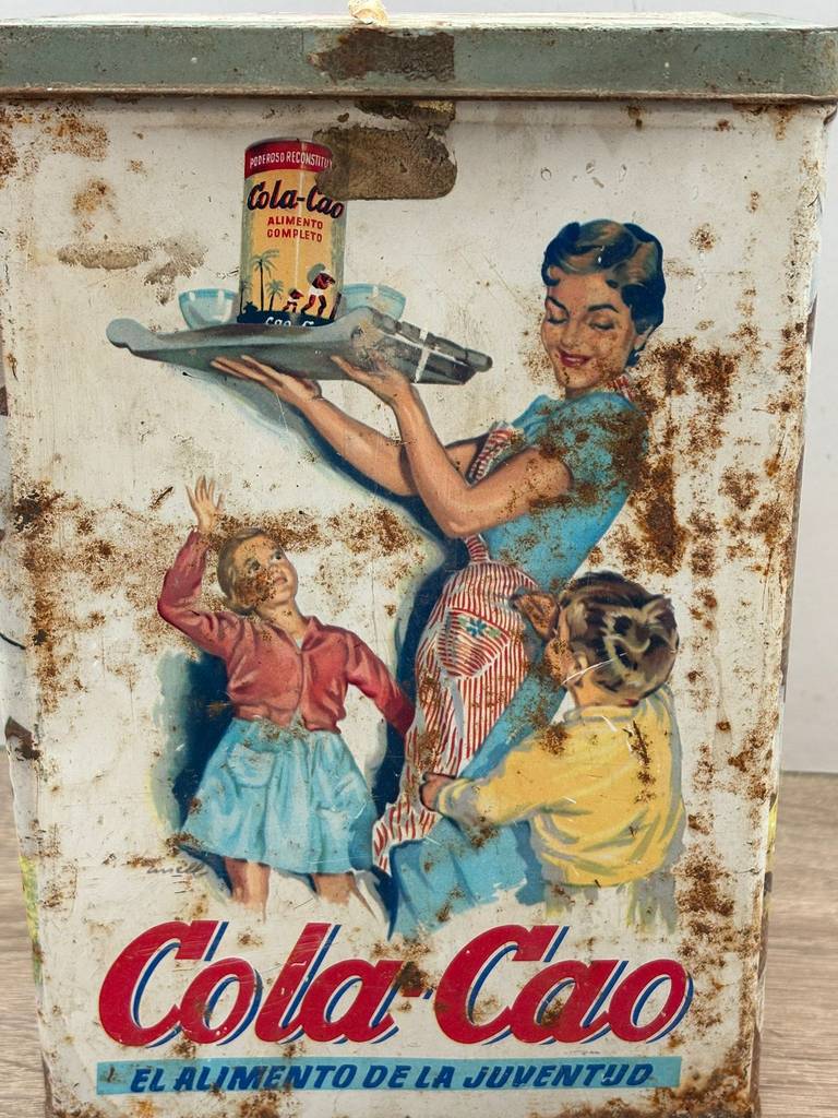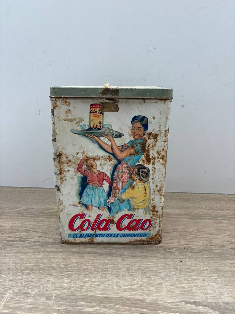 Lata de metal vintage original con diseño clásico de la marca Colacao. Es una lata ideal para coleccionistas y amantes de artículos retro. Se trata de una pieza perfecta para exhibición, colección o decoración con estilo nostálgico en un salón comedor o junto con otras piezas coleccionables del mismo estilo. Como podemos observar en las fotografías presenta desperfectos.