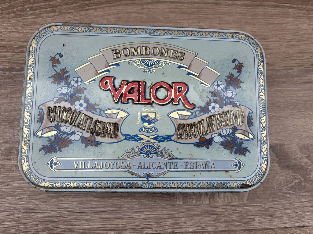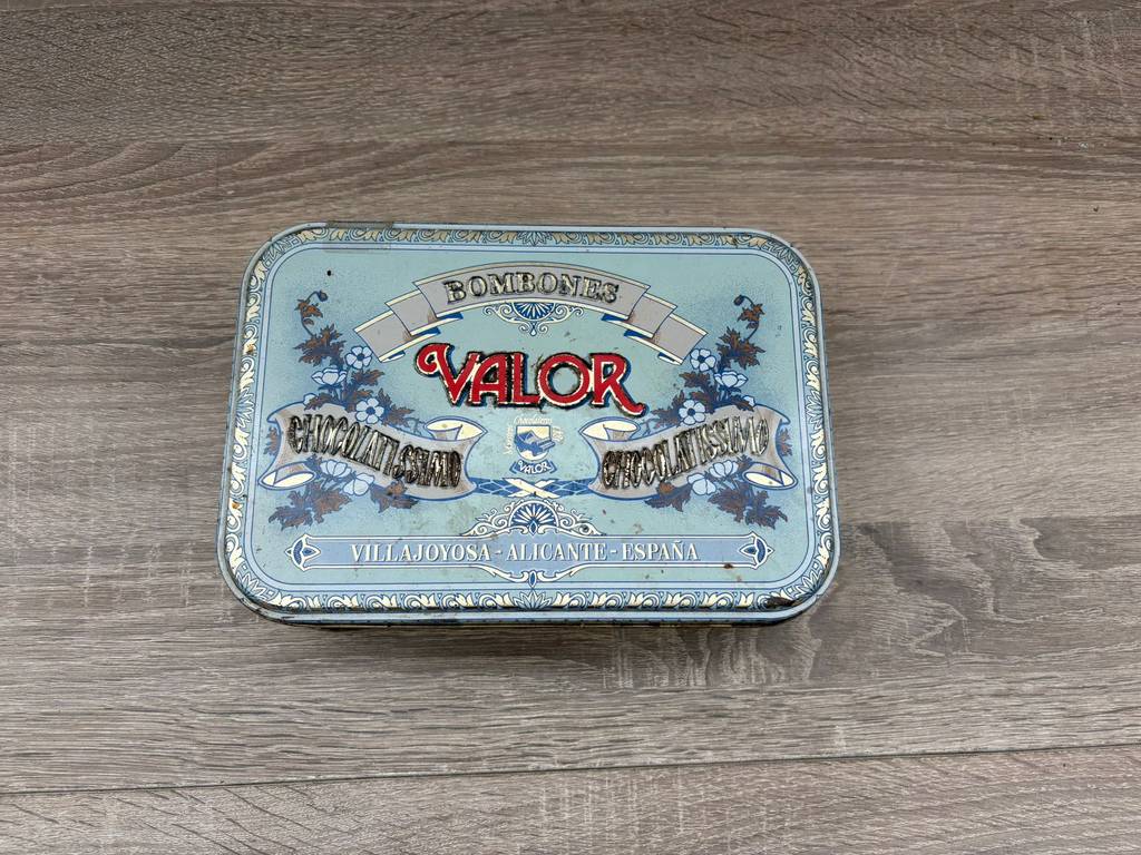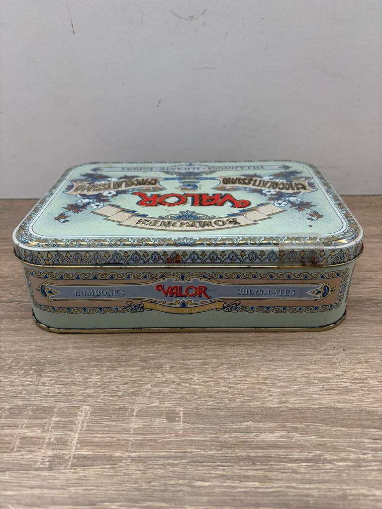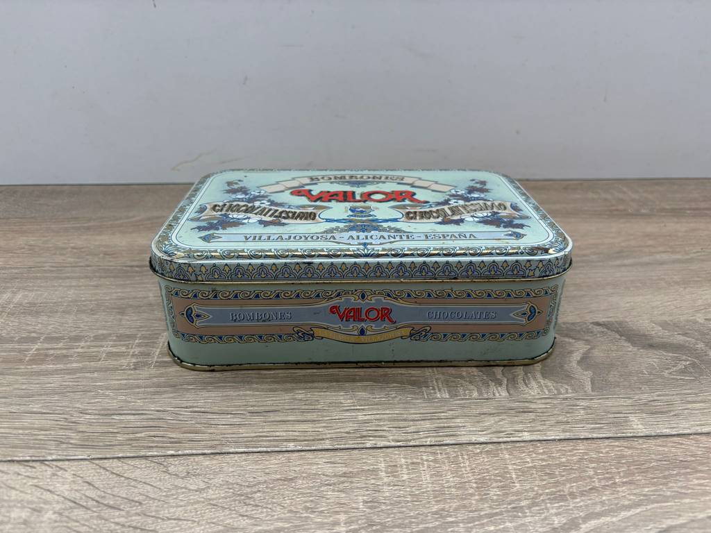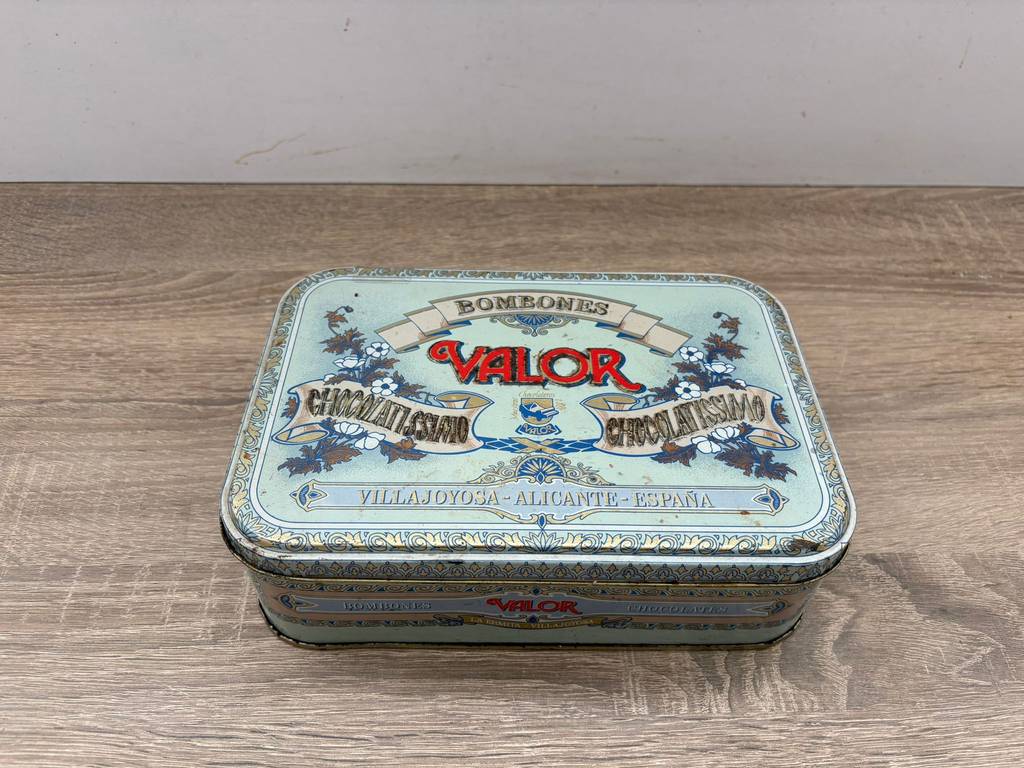 Lata de metal vintage original con diseño clásico de la marca de chocolates “Valor”. Es una lata ideal para coleccionistas y amantes de artículos retro. Se trata de una pieza perfecta para exhibición, colección o decoración con estilo nostálgico en un salón comedor o junto con otras piezas coleccionables del mismo estilo. También nos puede servir para almacenar pequeños enseres. Como podemos observar en las fotografías presenta desgaste.