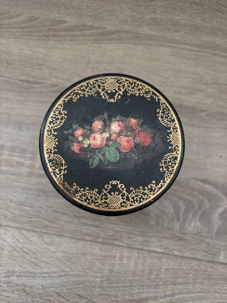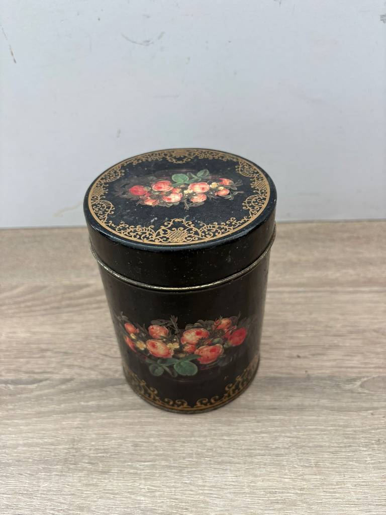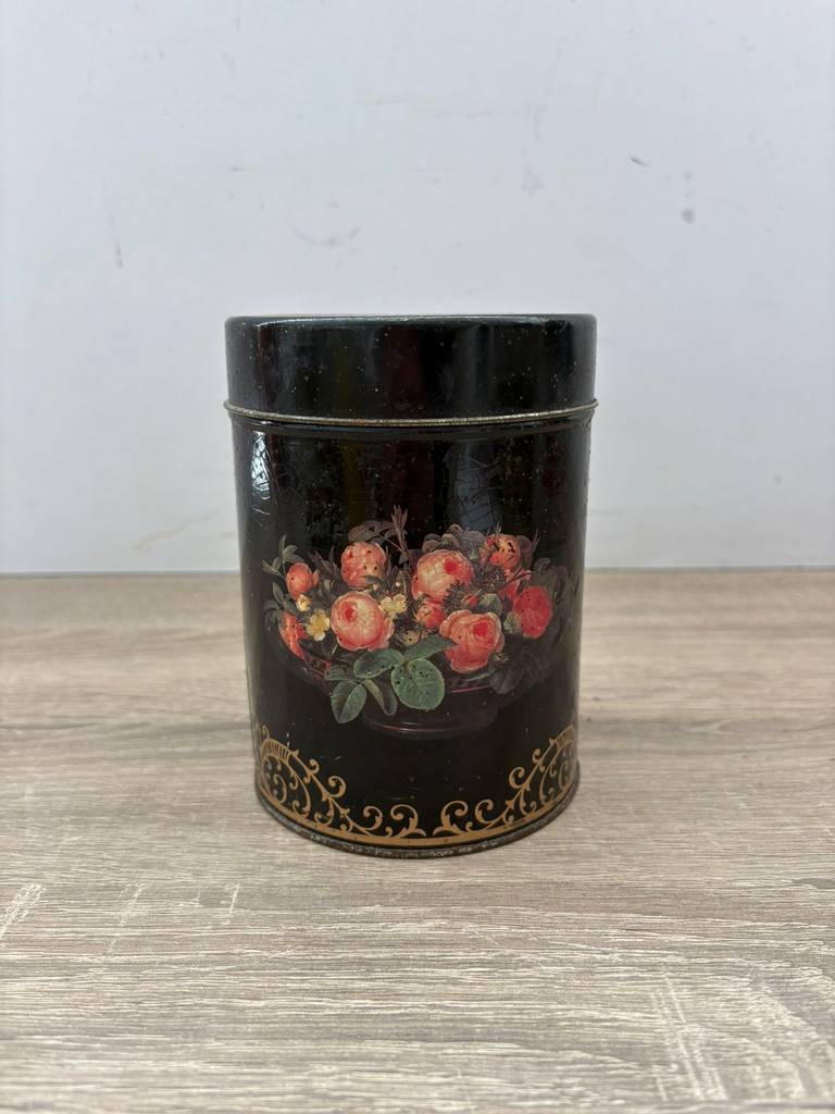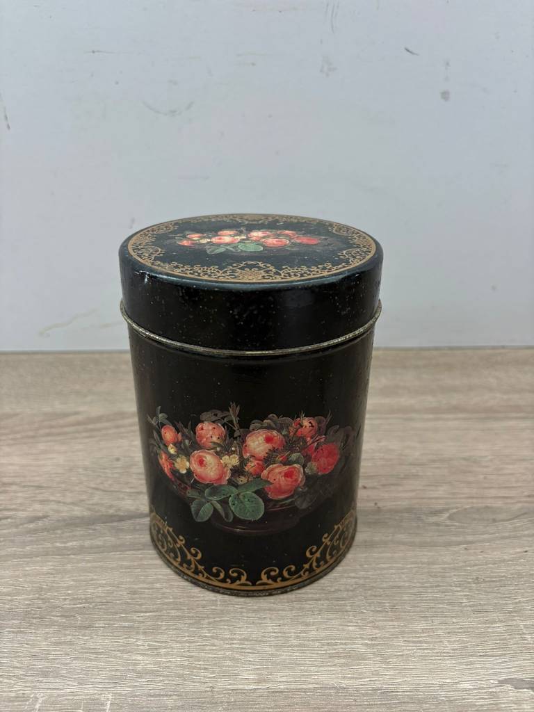 Lata de metal vintage original con diseño clásico inglés de color negro y con flores pintadas con mucha precisión y detalle. Es una lata ideal para coleccionistas y amantes de artículos retro. Se trata de una pieza perfecta para exhibición, colección o decoración con estilo nostálgico en un salón comedor o junto con otras piezas coleccionables del mismo estilo. Como podemos observar en las fotografías presenta desperfectos.