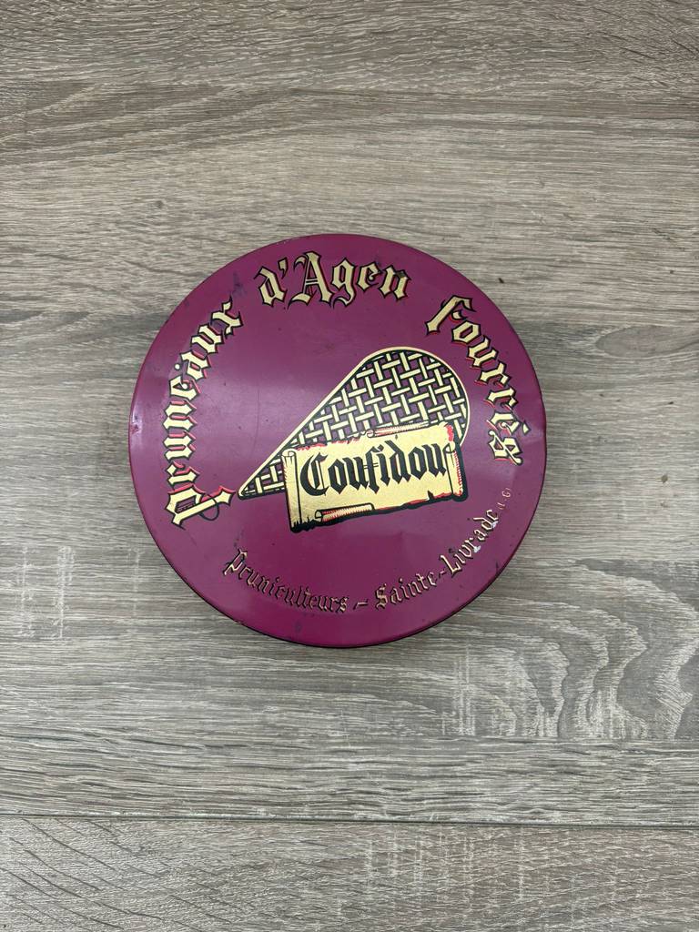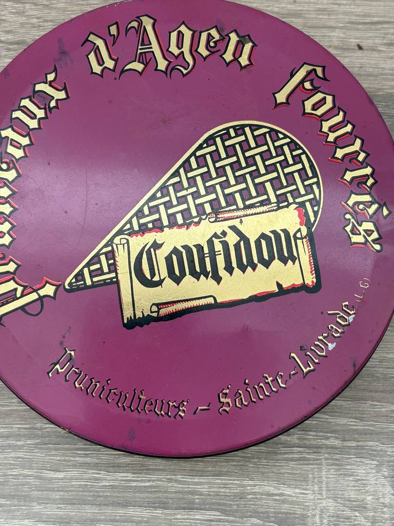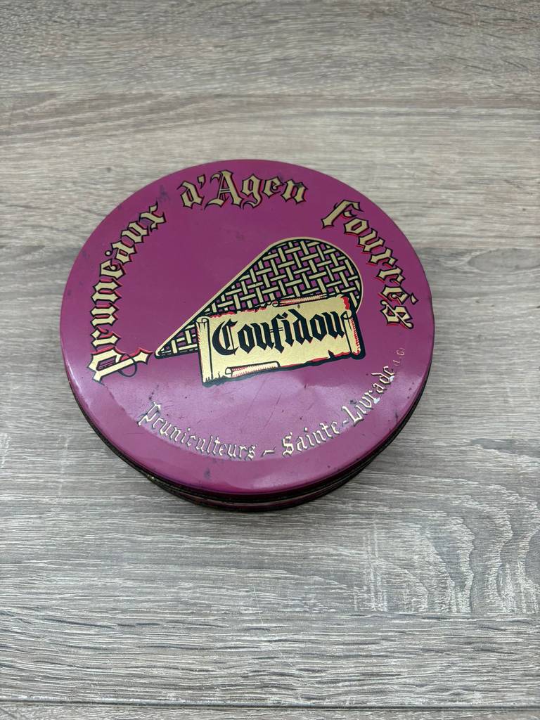 Lata de metal vintage original con diseño clásico de la marca Coufidou “Pruneaux Dagen”. Es una lata ideal para coleccionistas y amantes de artículos retro. Se trata de una pieza perfecta para exhibición, colección o decoración con estilo nostálgico en un salón comedor o junto con otras piezas coleccionables del mismo estilo. Como podemos observar en las fotografías presenta desperfectos.