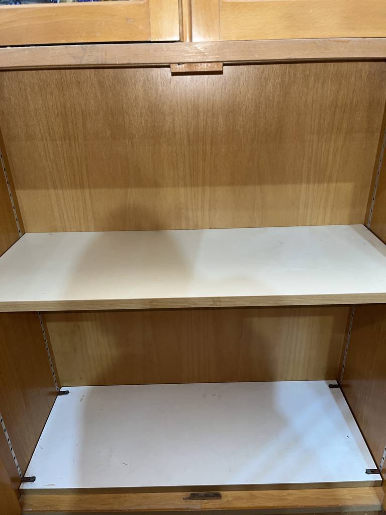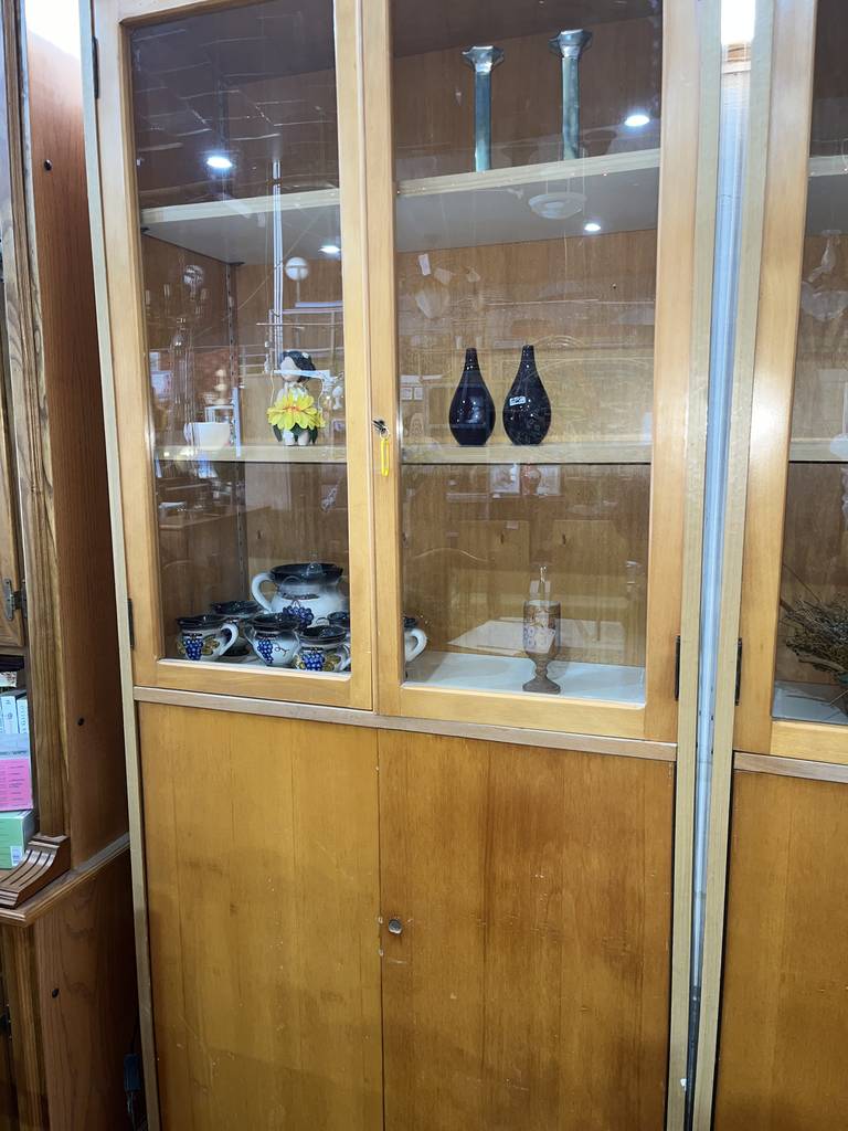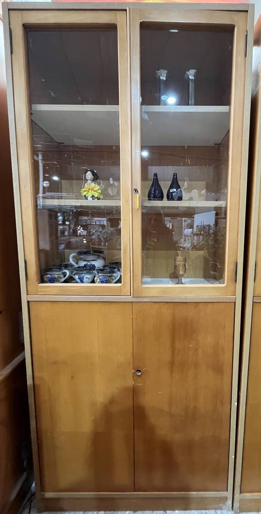 Librería o estantería que ha sido fabricada con madera de buena calidad y robusta. Se compone de una parte superior con dos puertas a modo de vitrina con cristal transparente y una inferior con dos puertas cerradas. La parte superior incorpora llave para una mayor seguridad. Es ideal para colocar en un estudio o salón comedor. Como podemos observar en las fotografías se encuentra en buenas condiciones, aunque le falta la cerradura de la puerta de abajo.