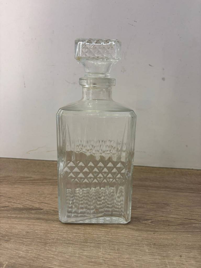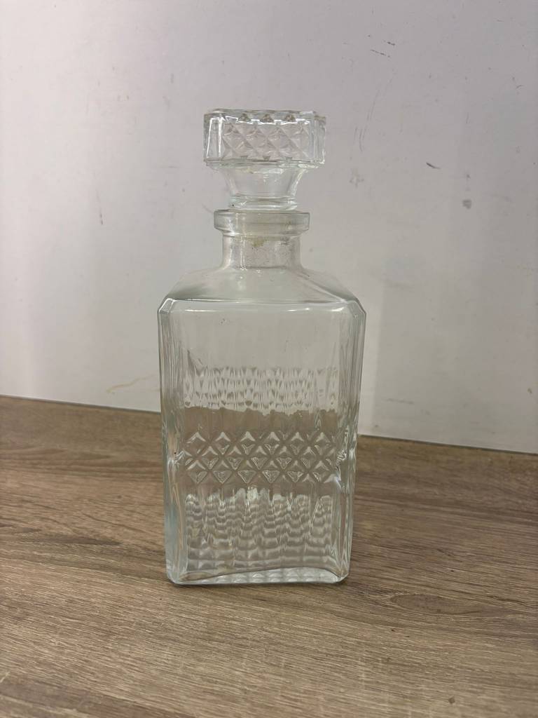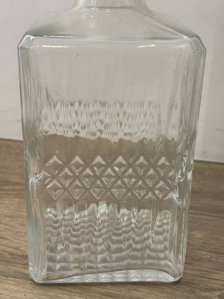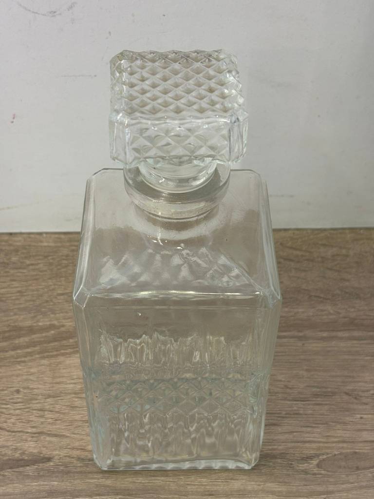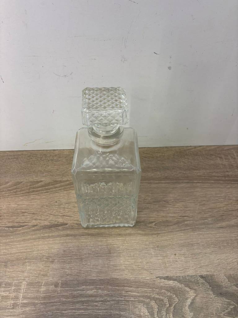 Botella licorera fabricada en cristal tallado de buena calidad de color transparente. Se trata de una botella de licor que tiene una forma cuadrada y lleva un tapón incorporado para mantener dentro el líquido en buen estado. Es una botella ideal para ponerla en un salón comedor a modo decorativo o para servir dentro algún licor. Como se puede observar en las fotografías se encuentra en buenas condiciones.