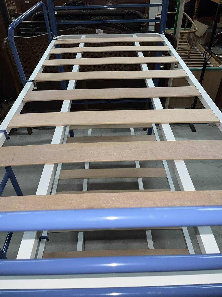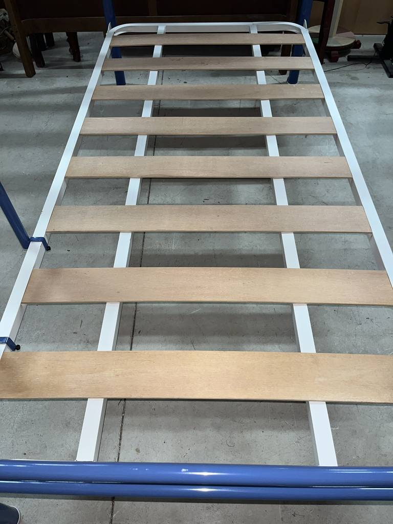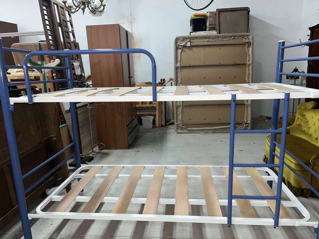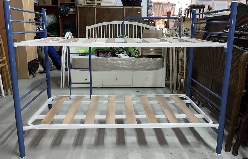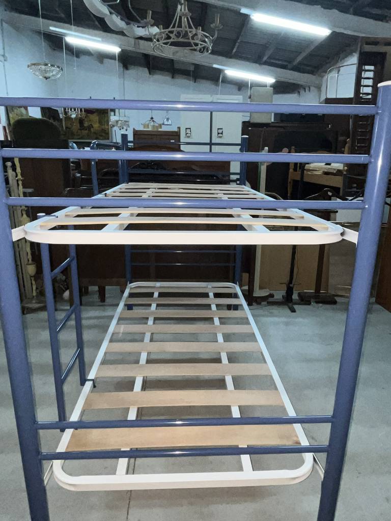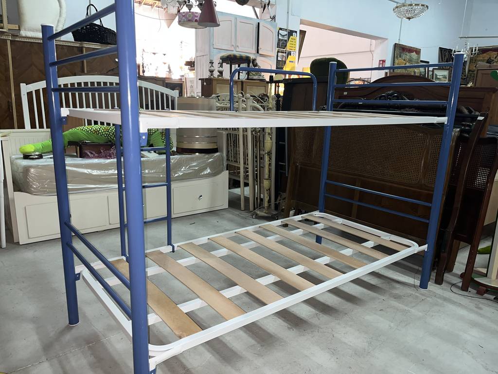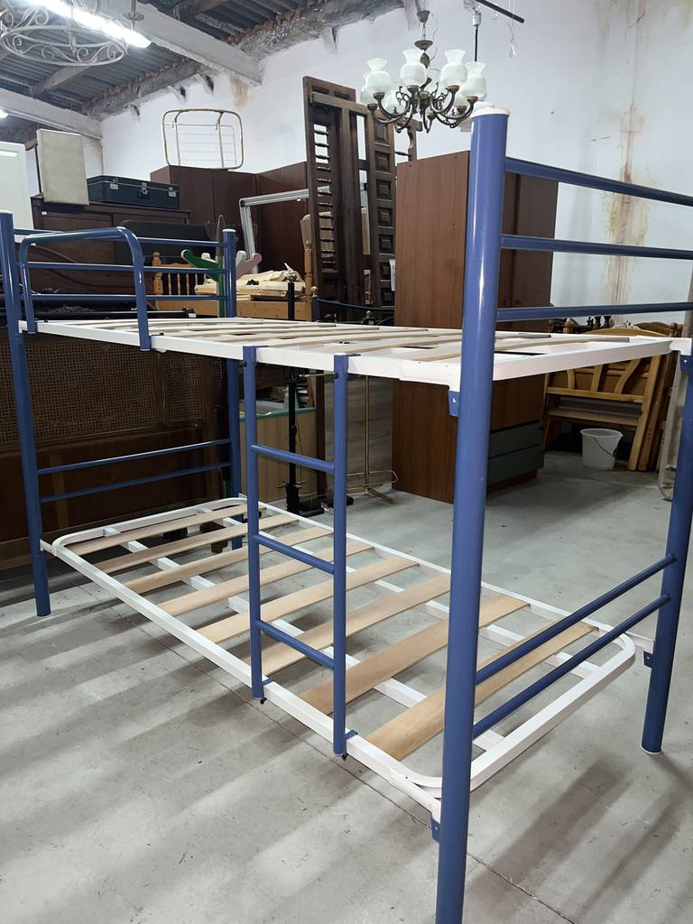 Litera de noventa por ciento noventa centímetros fabricada en madera y metal de buena calidad de color blanco y azul marino. Se trata de una litera que cuenta con dos somieres perfectos para colocar dos colchones de tamaño individual. Es una litera perfecta para colocarla en un dormitorio infantil o juvenil. Como se puede observar en las fotografías se encuentra en buen estado.