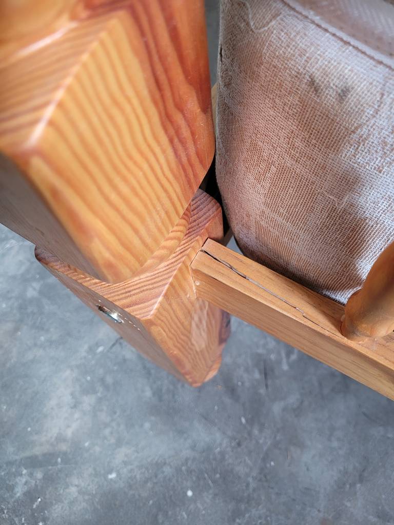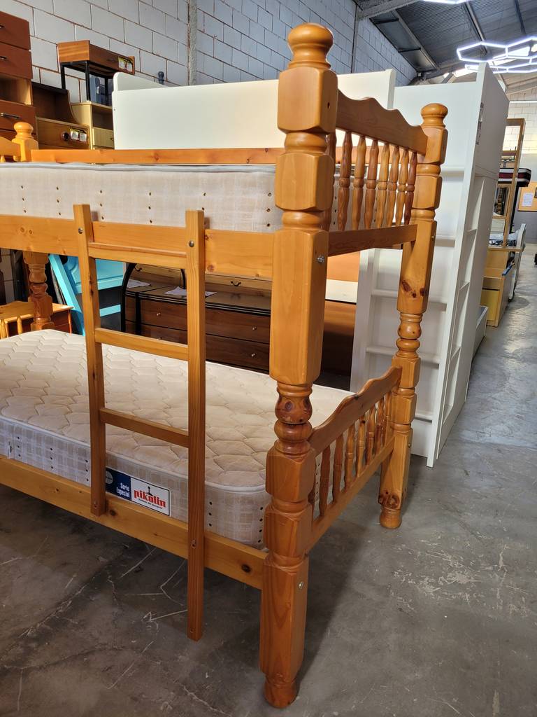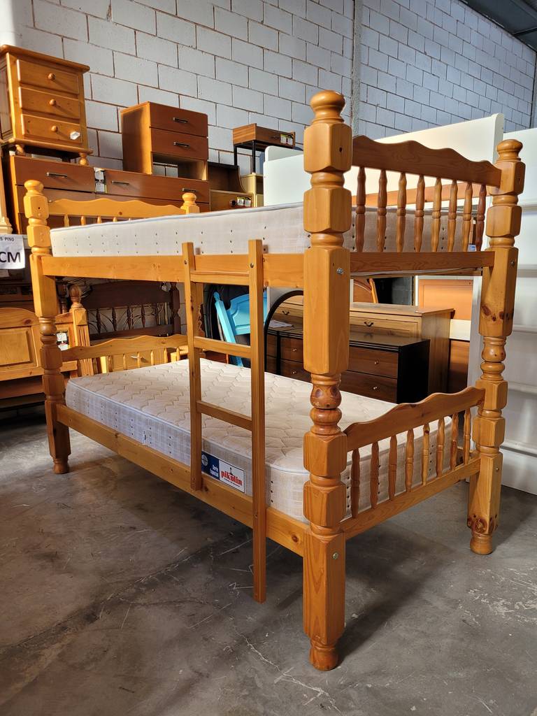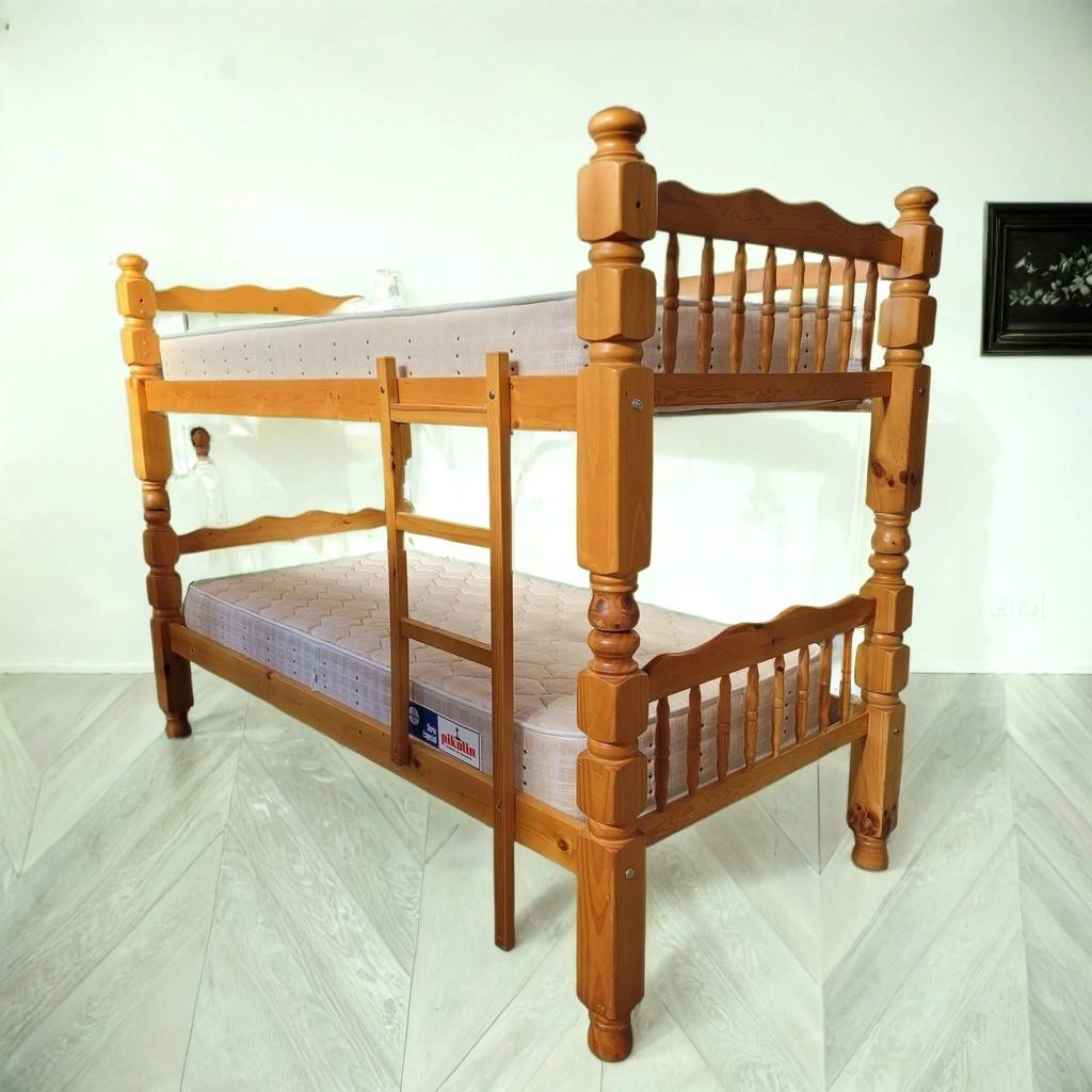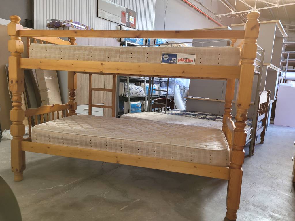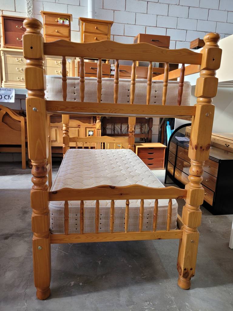 Litera de estilo rústico que ha sido fabricada con madera de buena calidad y robusta. Incorpora espacio para colocar dos colchones y en un lateral una escalera para acceder fácilmente a la parte superior. Se trata de una litera muy estable con gruesas patas unidas por listones de madera. Como podemos observar en las fotografías presenta un ligero desperfecto. El precio no incluye los colchones.