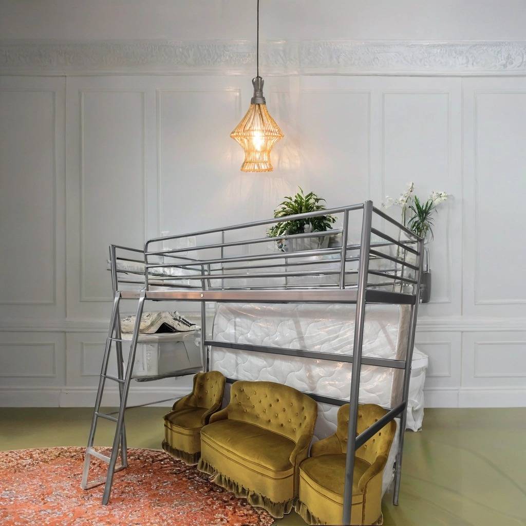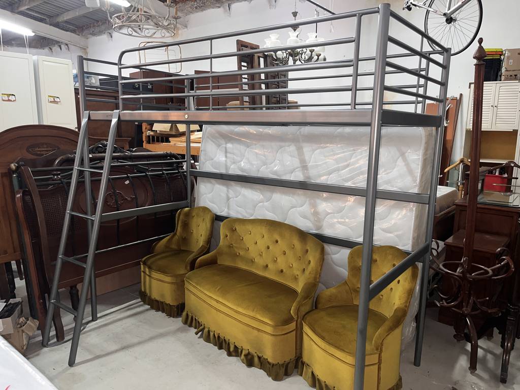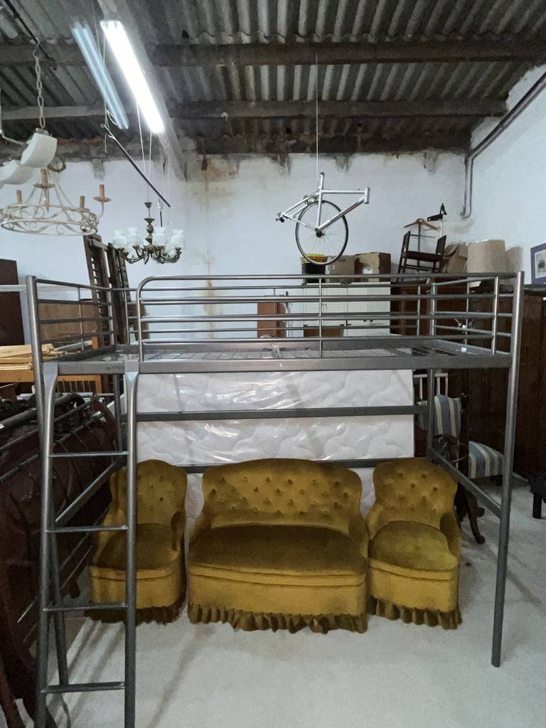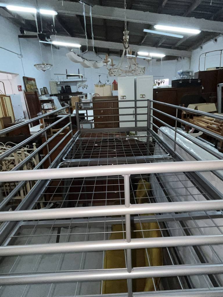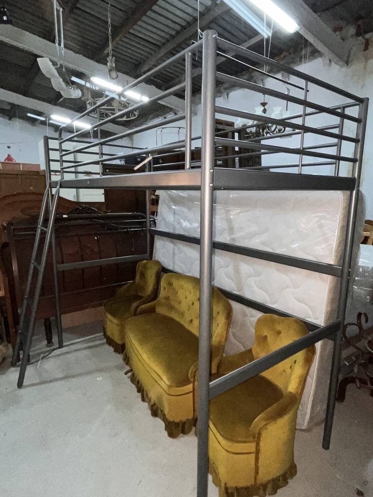 Litera fabricada en metal de color plateado con una estructura robusta y resistente. Se trata de una litera metálica que cuenta con una escalera para poder subir a la parte de arriba y tiene espacio suficiente para poner un colchón de tamaño individual. Es una litera perfecta para ponerla en un dormitorio infantil. Como se puede observar en las fotografías se encuentra en buenas condiciones.