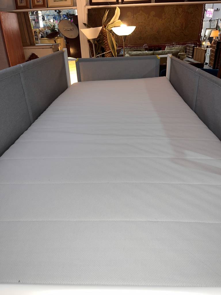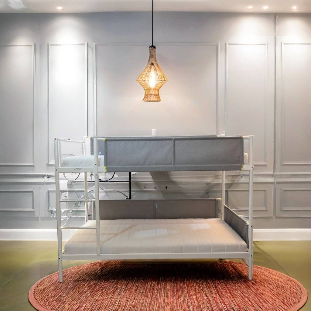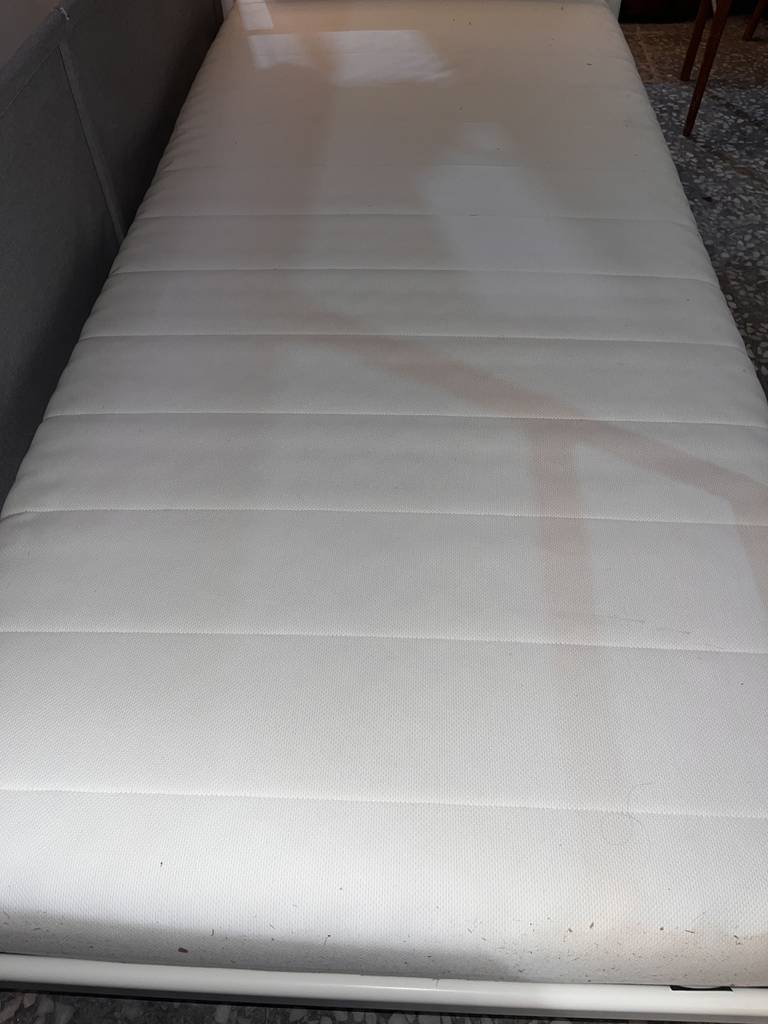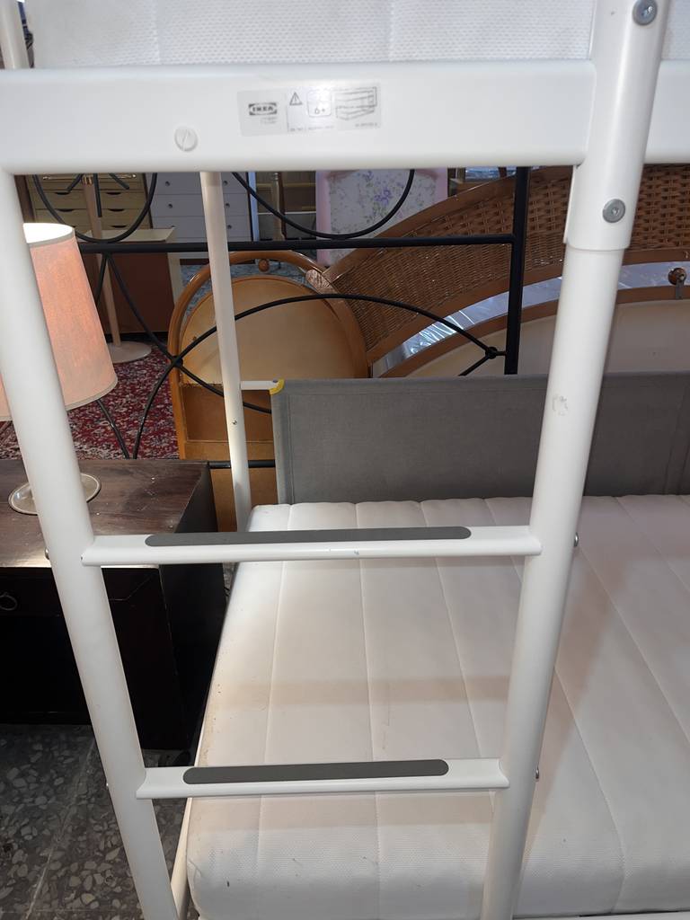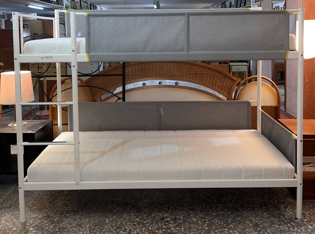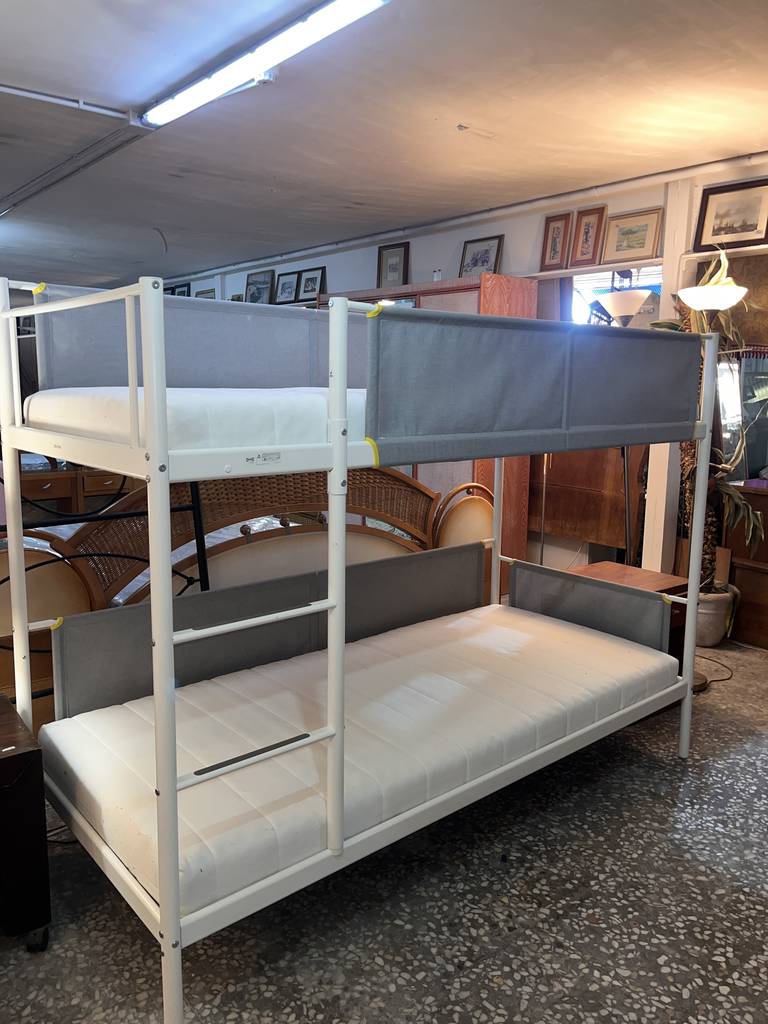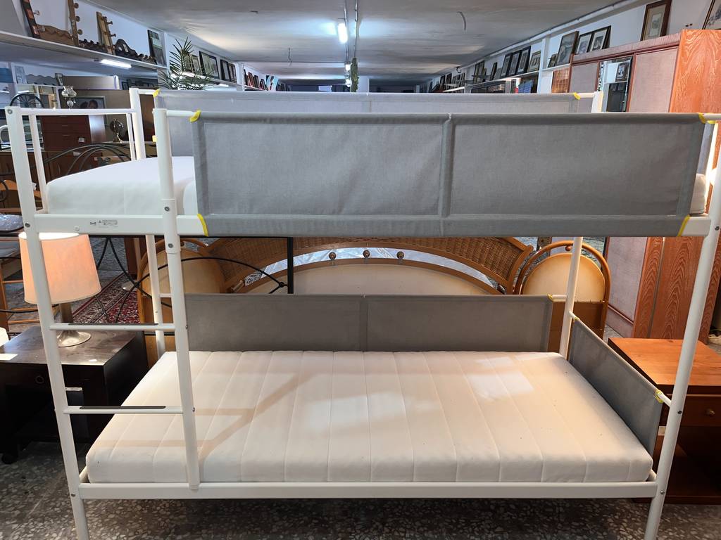Litera fabricada en metal de color blanco con una estructura robusta y resistente. Se trata de una litera metálica que cuenta con una escalera para poder subir a la parte de arriba y dispone de dos camas con dos colchones incorporados de 90x200cm. Es una litera perfecta para ponerla en un dormitorio infantil. Como se puede observar en las fotografías se encuentra en buenas condiciones.