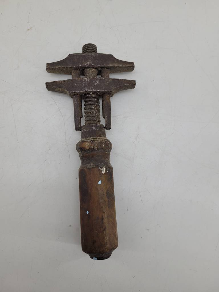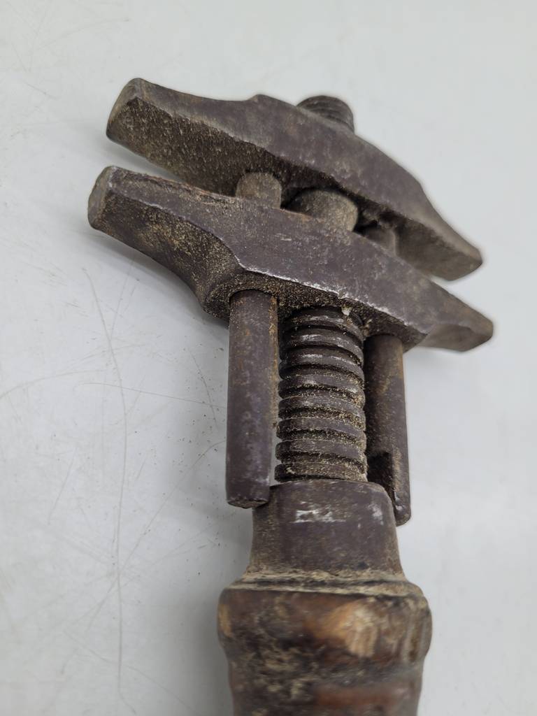 Llave inglesa antigua de buena calidad compuesta por un mango ancho de madera robusta duradera. Se trata de una pieza ideal para gente que quiera realizar trabajos manuales con una herramienta de buena calidad y duradera. Es ideal para uso particular o para un taller o negocio. Como podemos observar en las fotografías se encuentra con desgaste, pero cumple su función perfectamente.