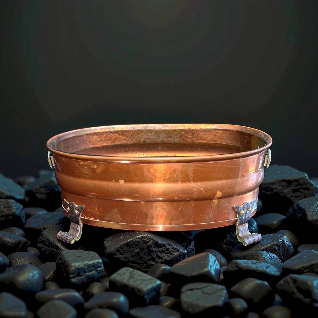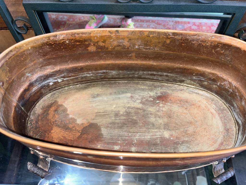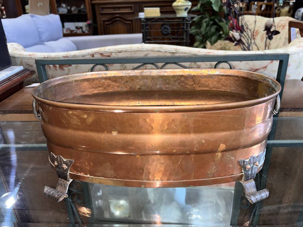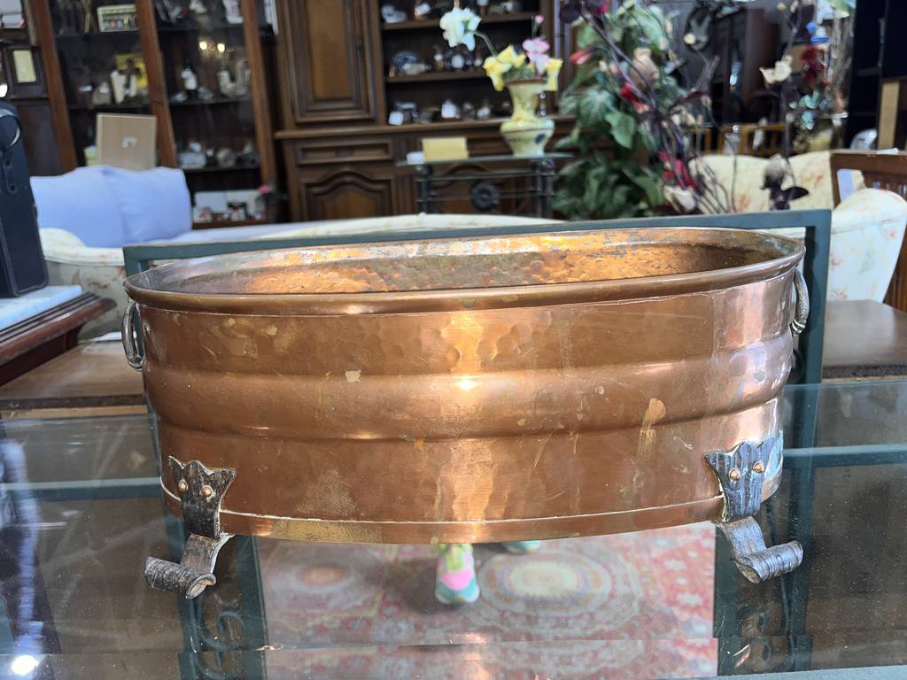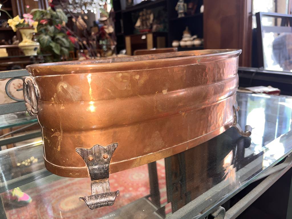 Macetero de estilo clásico fabricado en cobre de buena calidad de color anaranjado. Se trata de un macetero de tamaño mediano que está fabricado en cobre auténtico y tiene una forma ovalada y estirada. Es un macetero ideal para colocarlo en el exterior de un hogar debido a la resistencia de su material principal. Como se puede observar en las fotografías se encuentra en buenas condiciones.