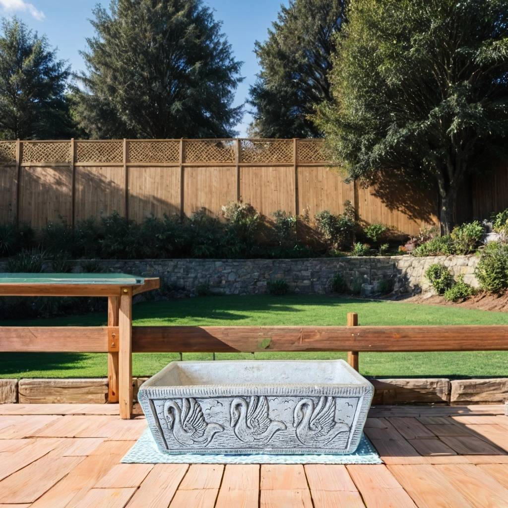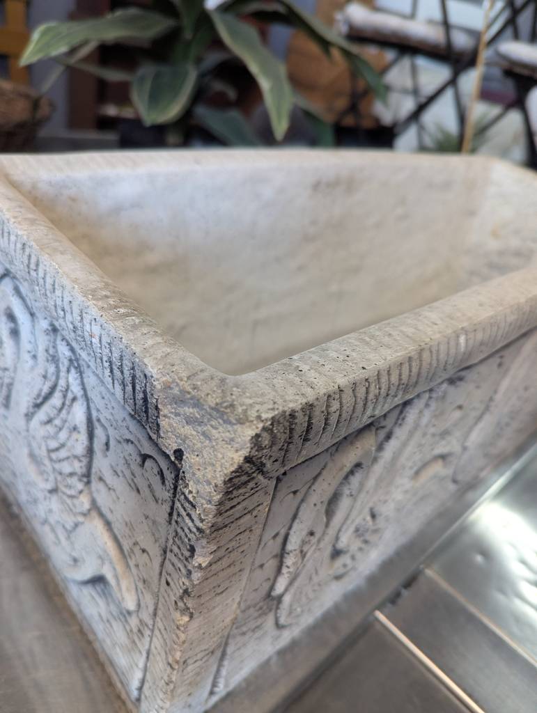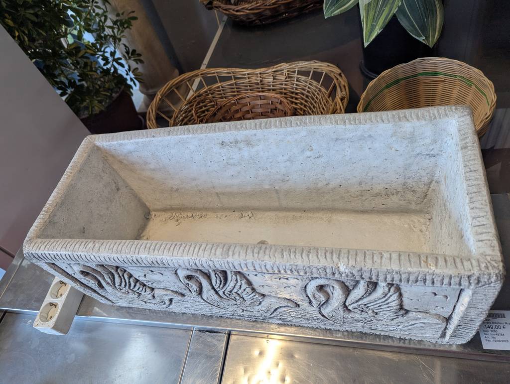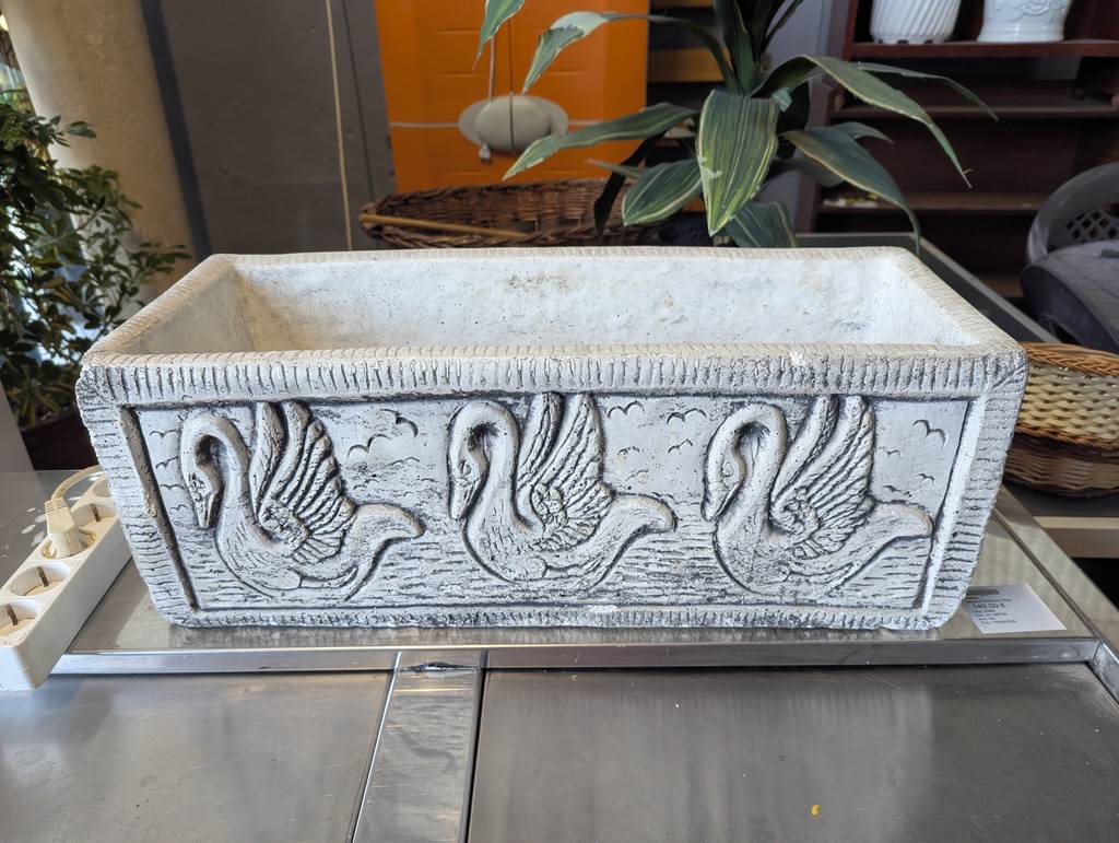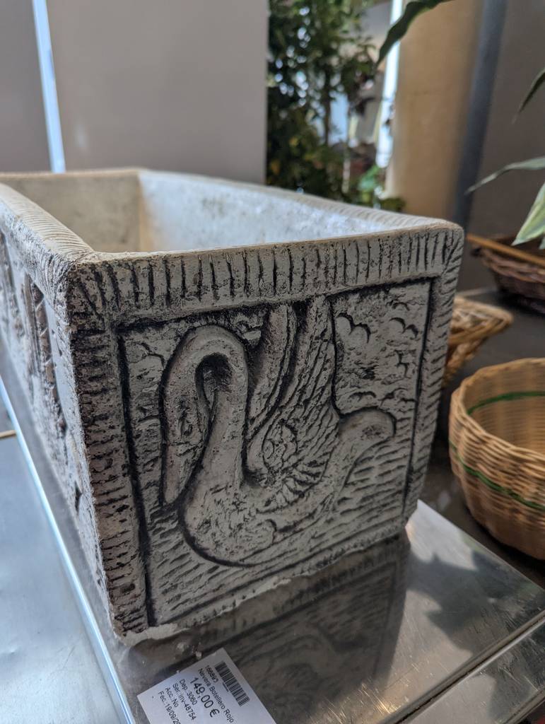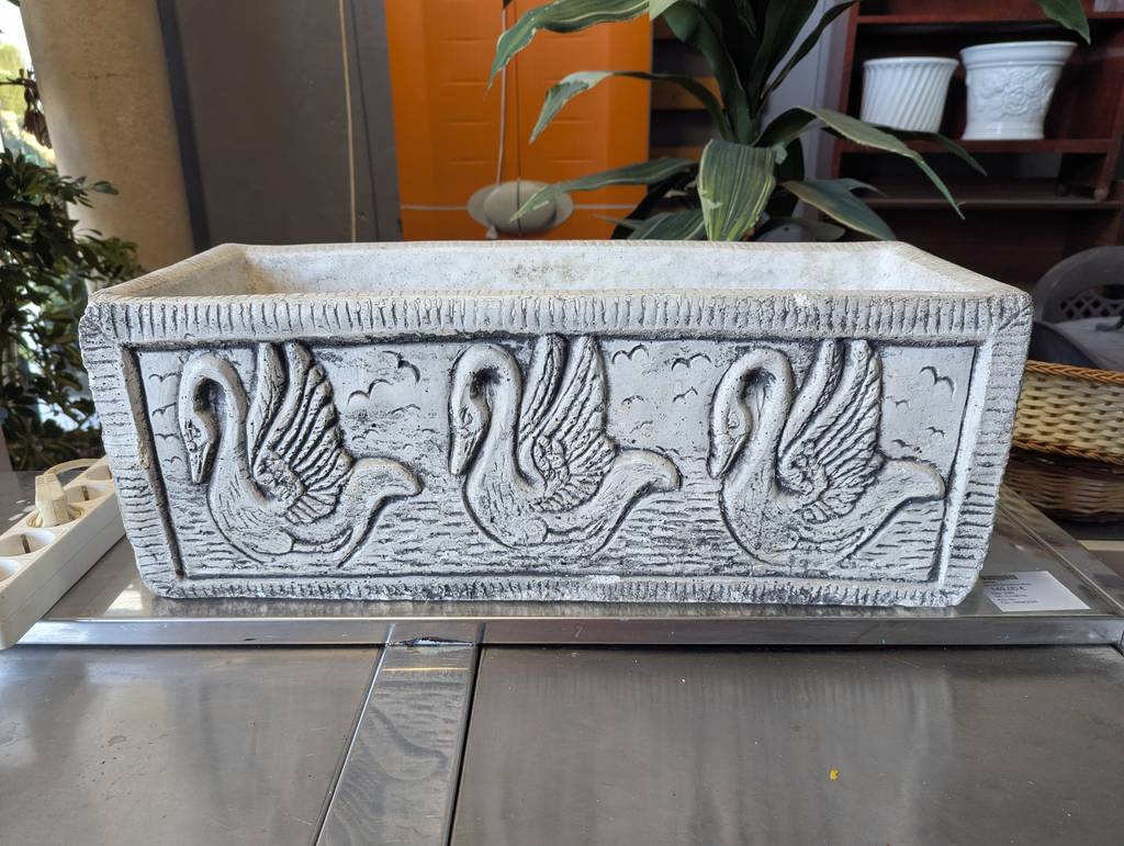 Macetero de tamaño medio fabricado en piedra de buena calidad y con cisnes tallados con precisión y detalle en el agua con pájaros revoloteando a su alrededor. Es un macetero para acompañar con unas bonitas plantas en su interior en un jardín o porche haciéndolo resaltar. Como podemos observar en las fotografías presenta un ligero desperfecto.