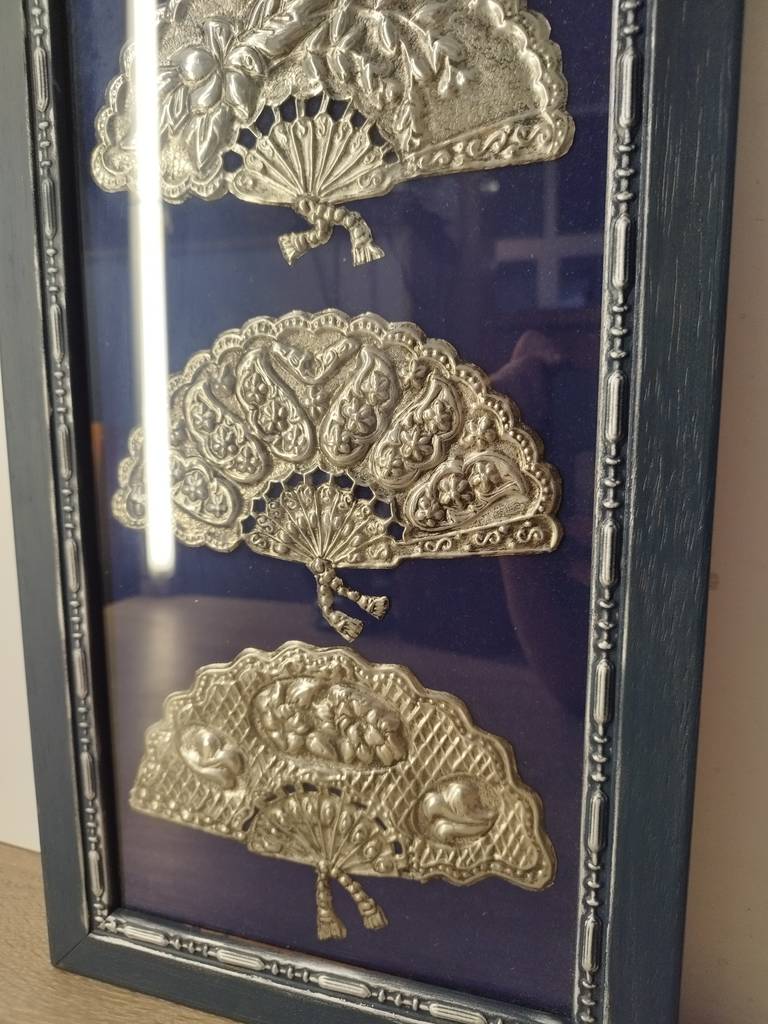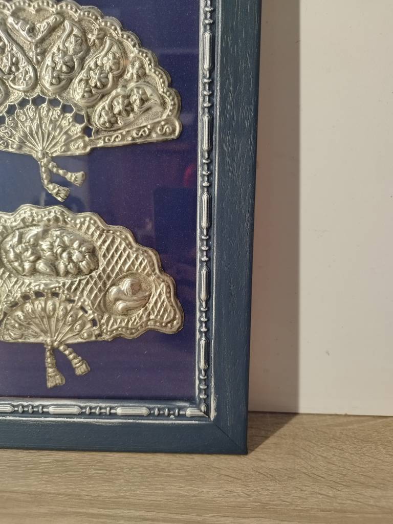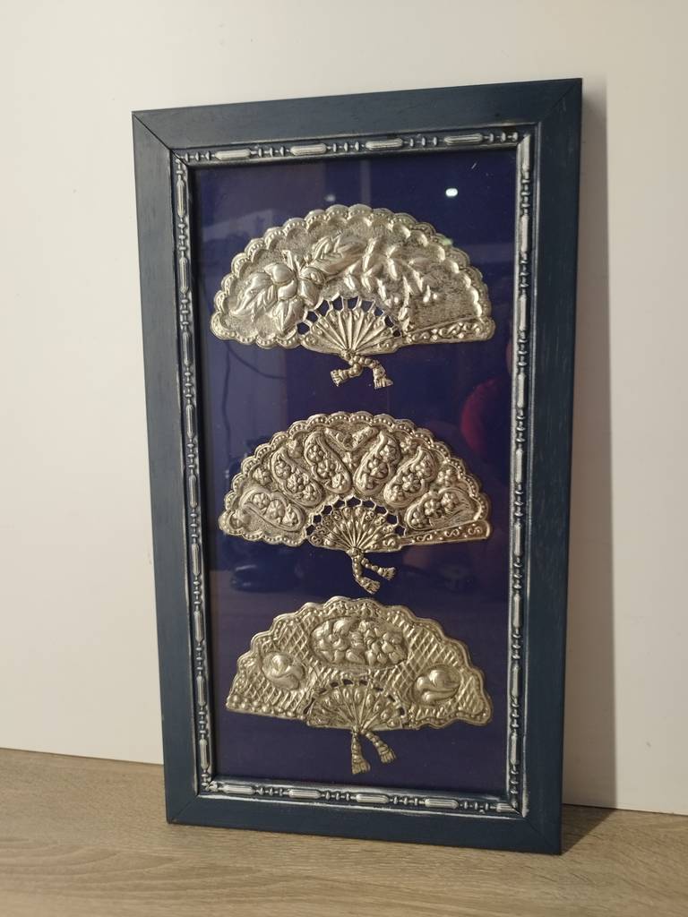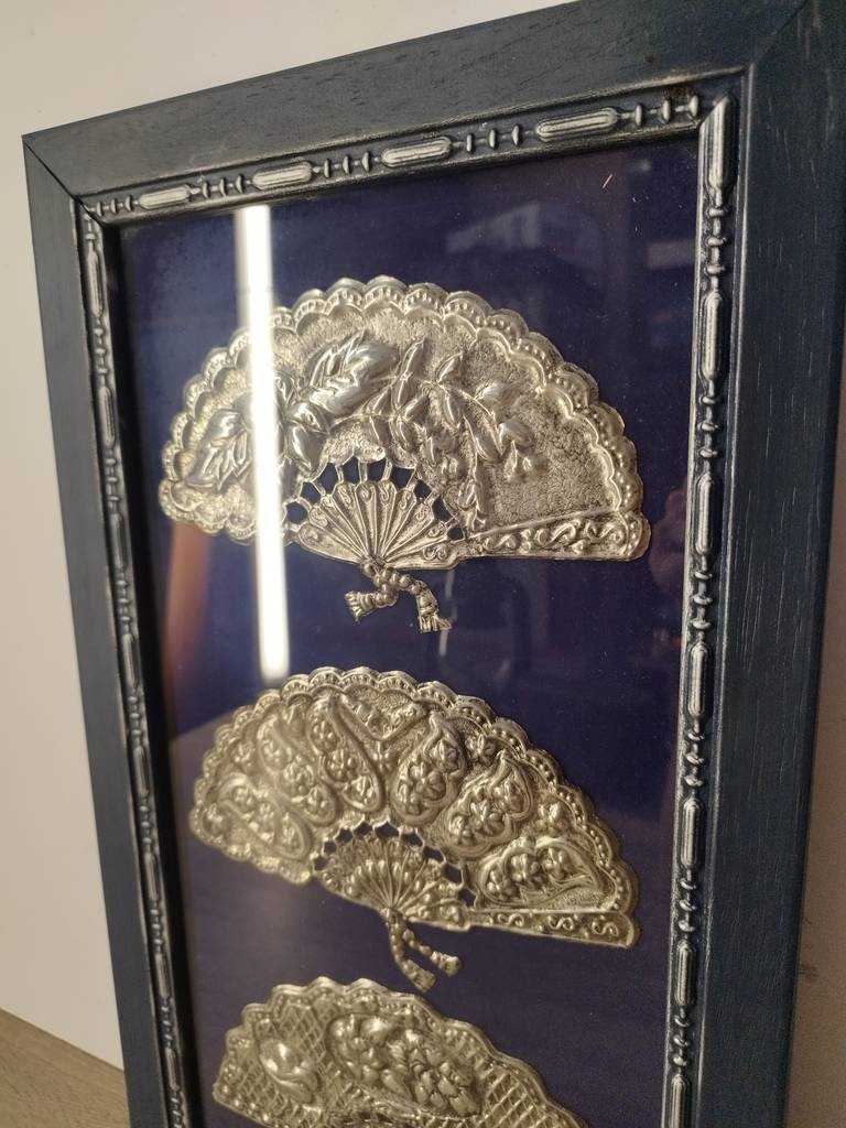 Marco de madera decorativo en color azul con una parte central con tres abanicos dorados en vertical sobre una base aterciopelada azul oscuro. Es un elemento decorativo que resaltará en cualquier estancia de nuestra casa, en especial en un salón comedor o en un recibidor. Como podemos observar en las fotografías se encuentra en buenas condiciones.