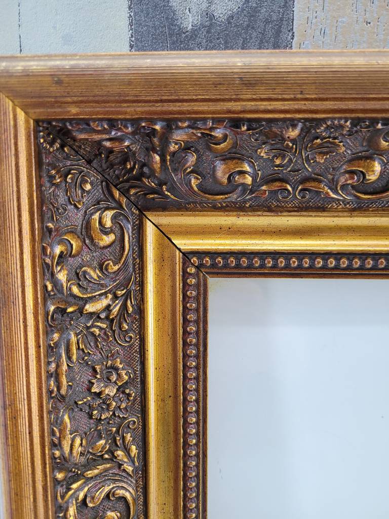 Marco dorado de tamaño mediano con un cristal grueso transparente de buena calidad. Se trata de un elegante marco de fotos que resulta ideal para ponerle cualquier tipo de fotografía y colocarlo encima de una mesa o una cómoda, ya sea en un salón comedor o en un dormitorio. Como se puede observar en las fotografías se encuentra en buenas condiciones para ser utilizado.