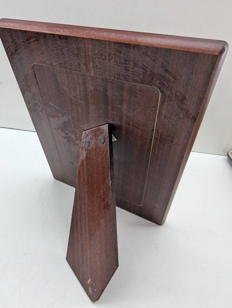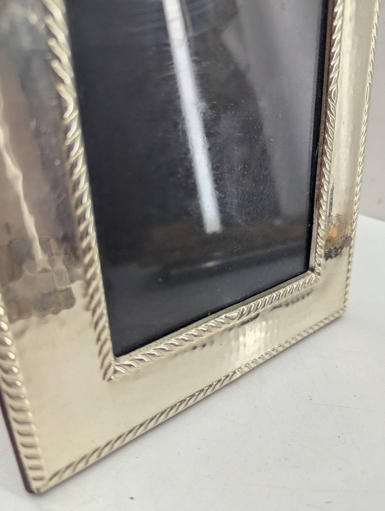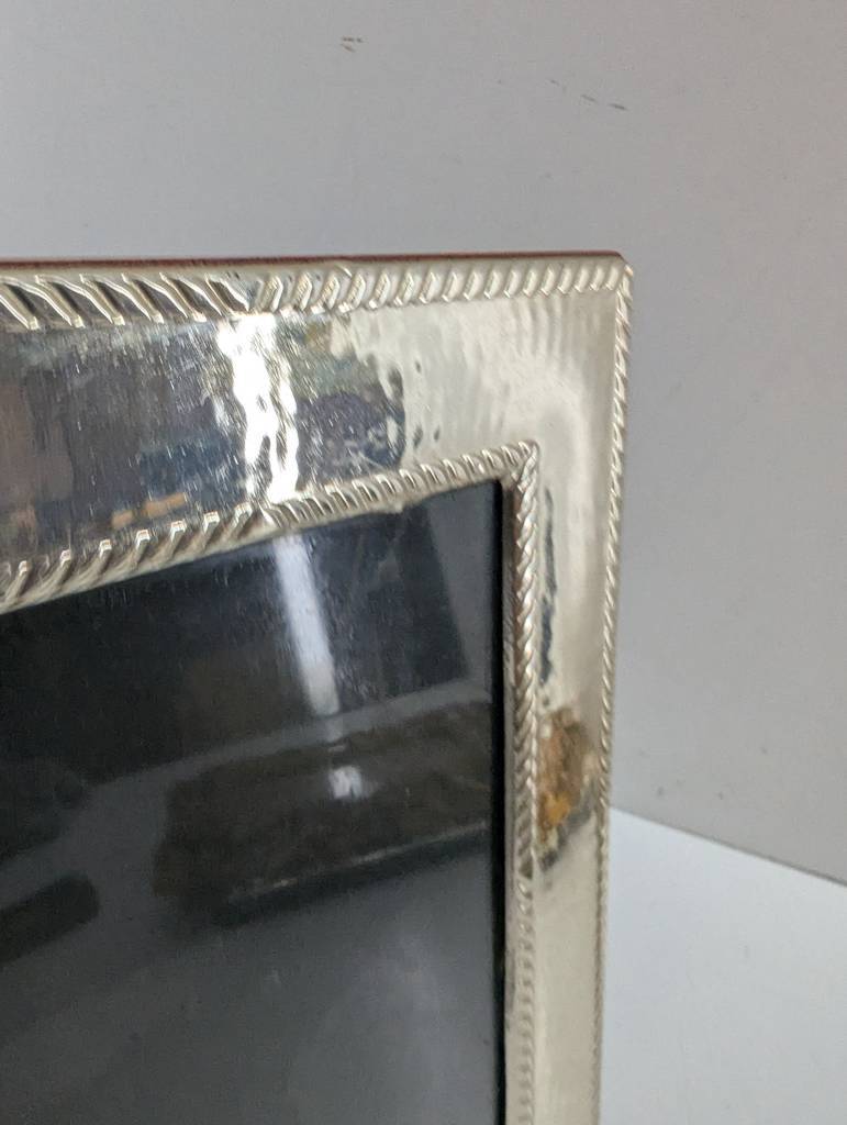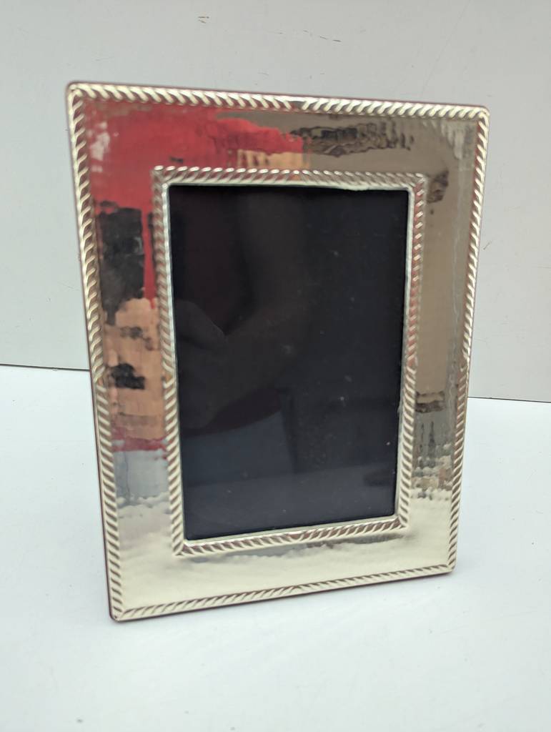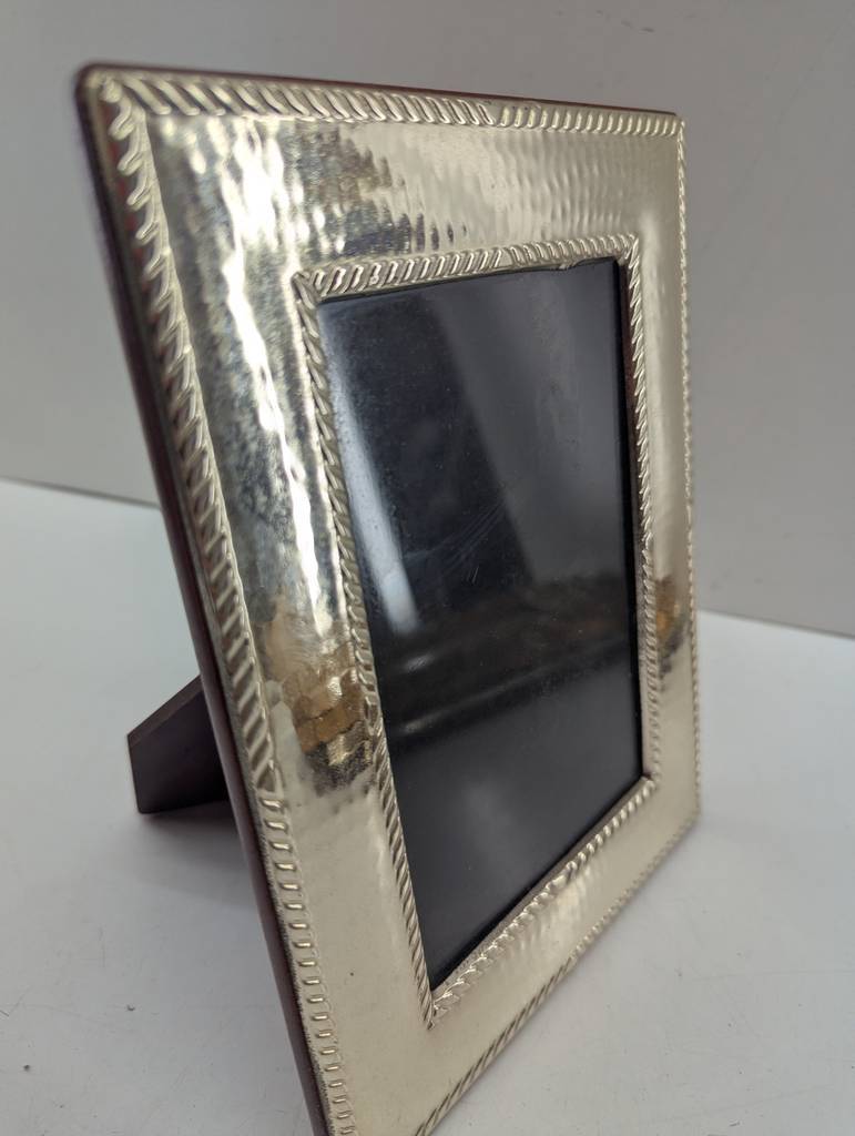 Marco o portafotos de color plateado con un acabado brillante. Se trata de un marco de fotos grueso que tiene una forma rectangular y dispone de un pie en la parte trasera para poder mantenerse plantado. Es un marco ideal para poner una foto o una imagen y colocarlo encima de un mueble en un salón comedor. Como se puede observar en las fotografías se encuentra en buenas condiciones.