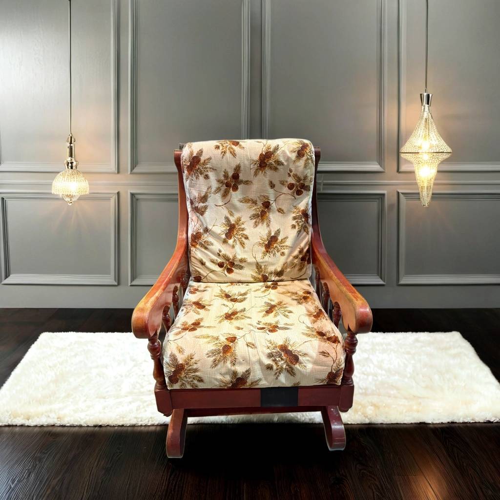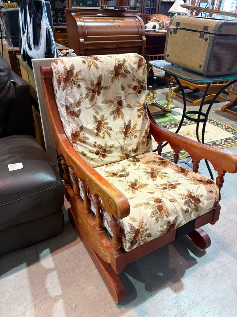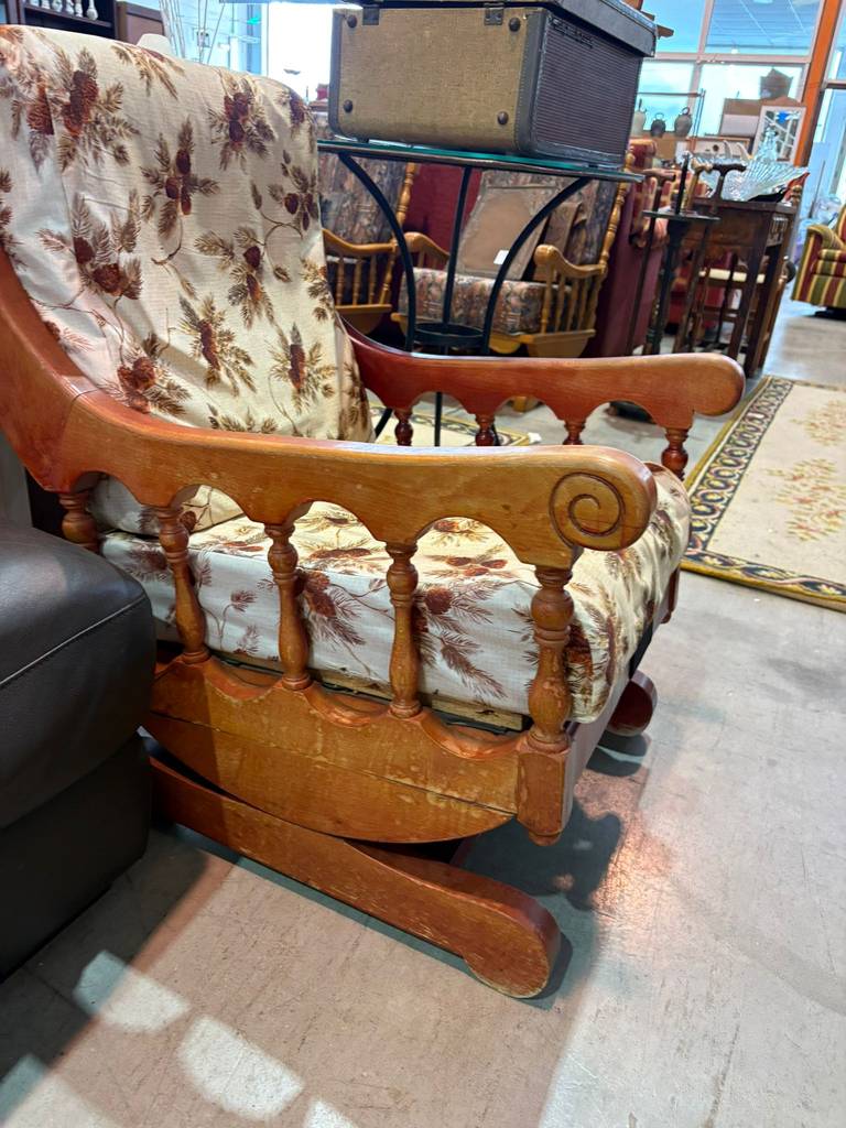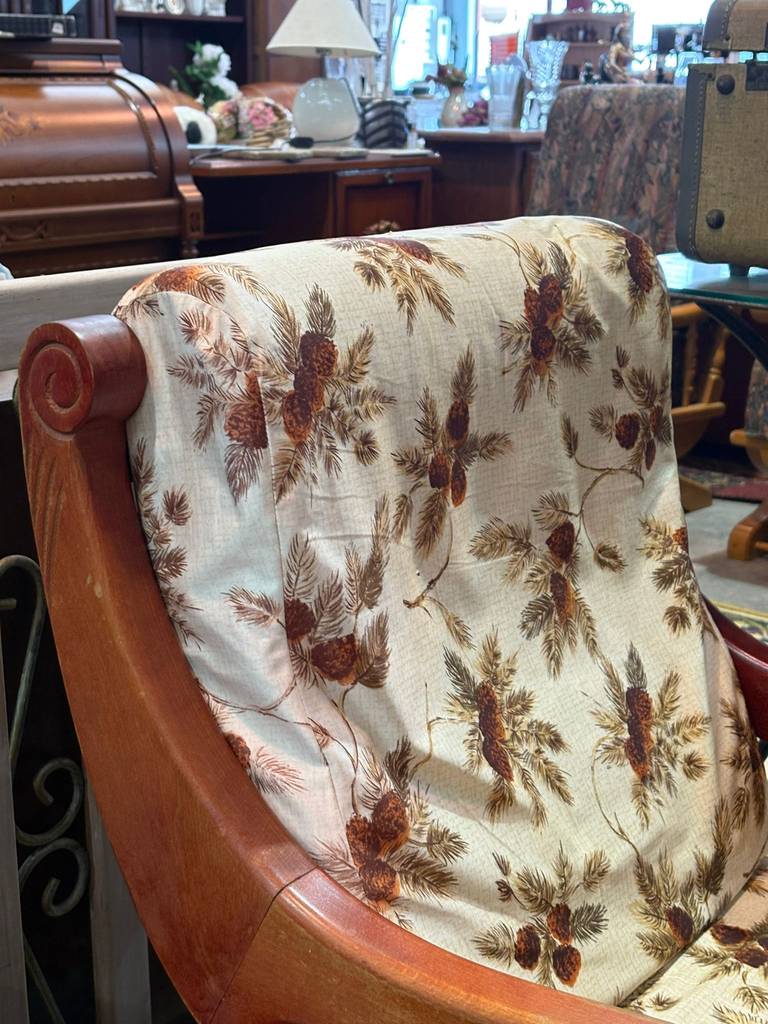 Mecedora fabricada en madera de buena calidad de color marrón claro con un asiento y un respaldo tapizados y acolchados con una tela con estampado alegre en tonos claros. Se trata de una cómoda mecedora que resulta ideal para colocarla en un salón comedor de estilo clásico. Como se puede observar en las fotografías se encuentra en buenas condiciones.