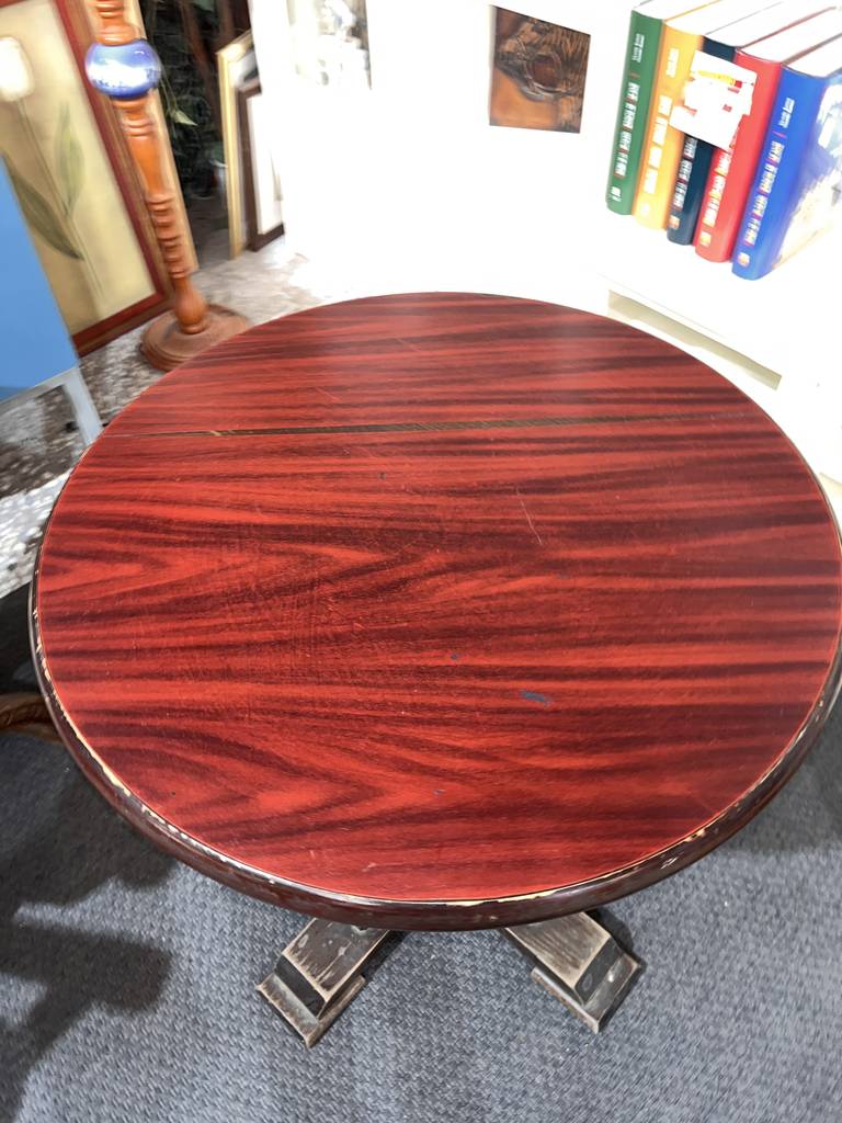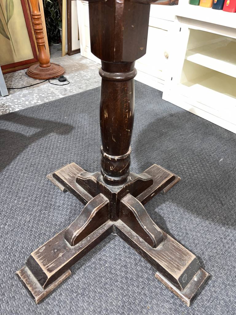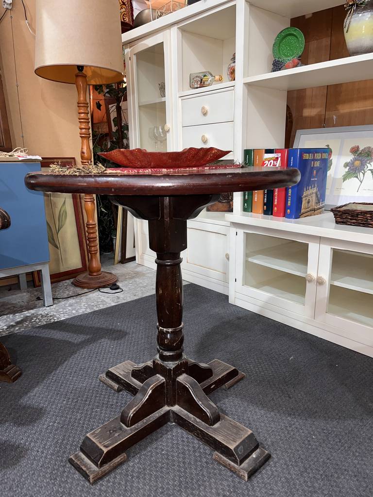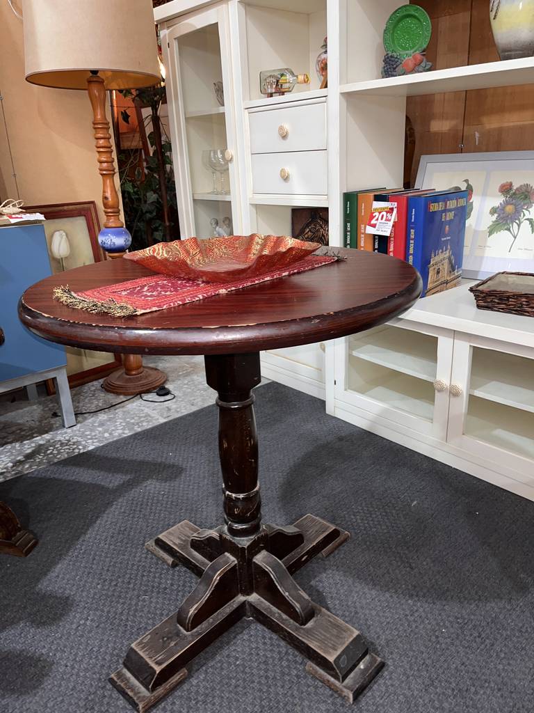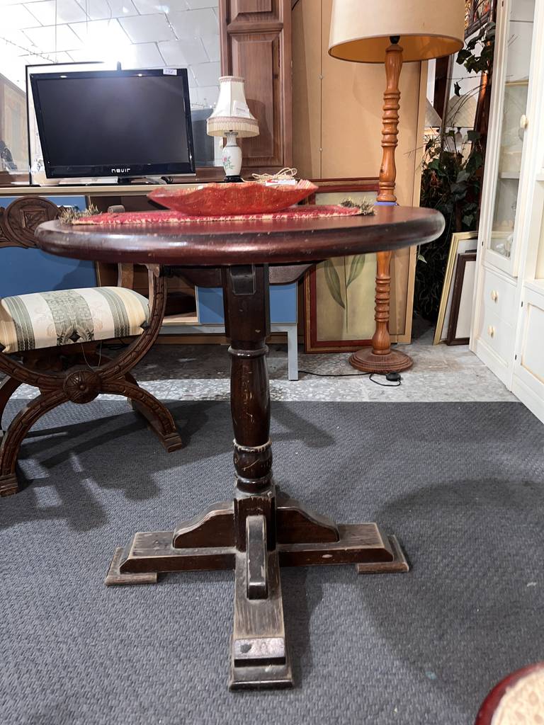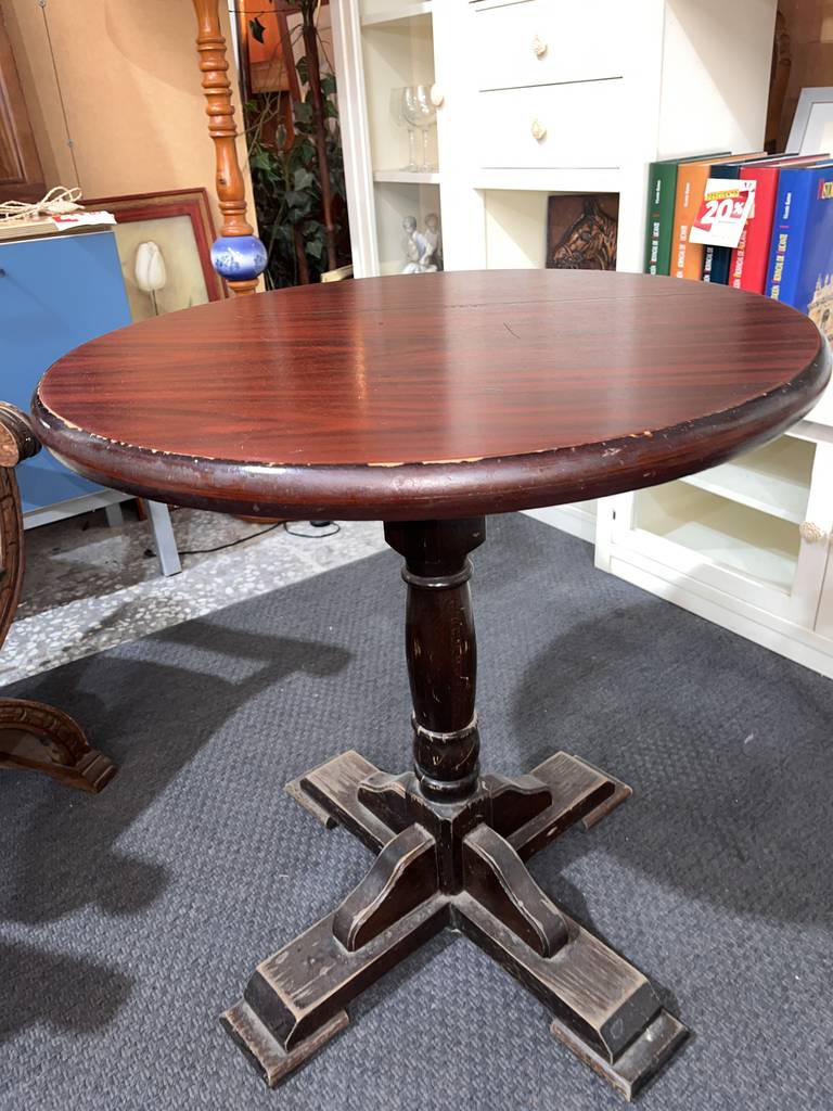 Mesa auxiliar de estilo clásico y con forma redonda que ha sido fabricada con madera de buena calidad y robusta. Se trata de una mesa muy estable con un pie grueso en la parte central. Es ideal para colocar en un salón comedor al lado de nuestro sofá acompañado de una bonita lámpara. Como podemos observar en las fotografías presenta desgaste.