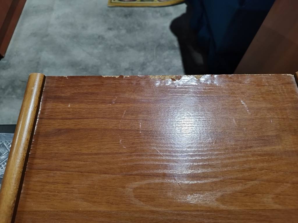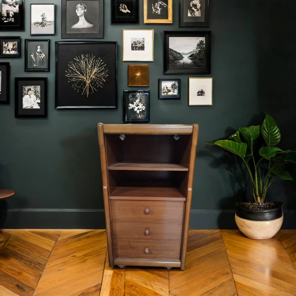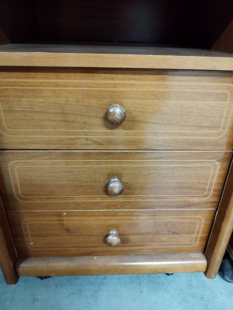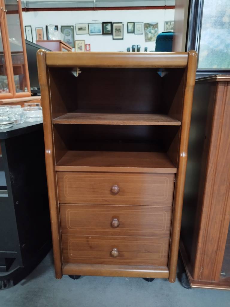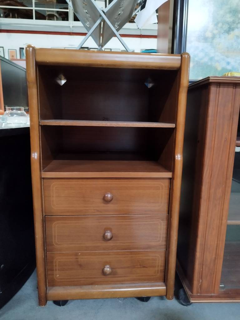 Mesa auxiliar fabricada en madera de buena calidad de color marrón oscuro. Se trata de una mesa auxiliar que tiene cuatro ruedas para poder moverla por cualquier estancia con mayor facilidad. Es una mesa que cuenta con tres cajones en la parte inferior y una balda con dos habitáculos en la parte superior. Como se puede observar en las fotografías está en buenas condiciones.