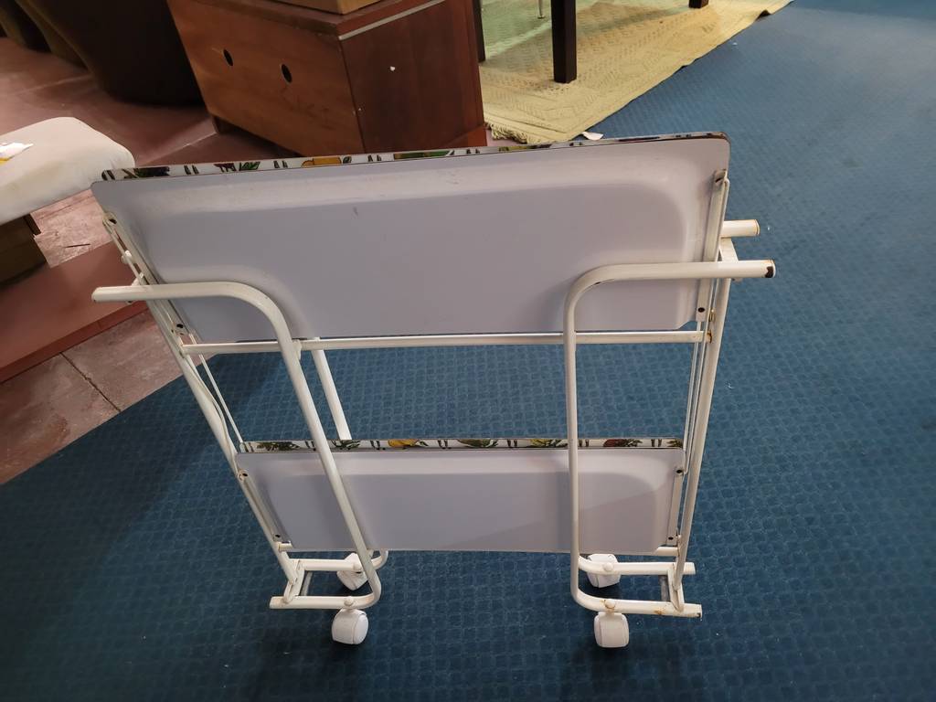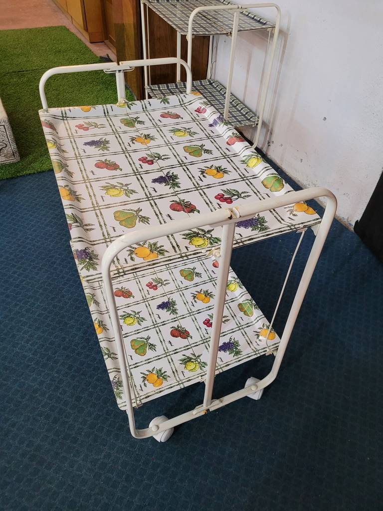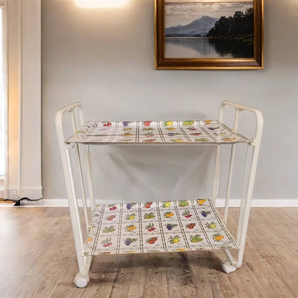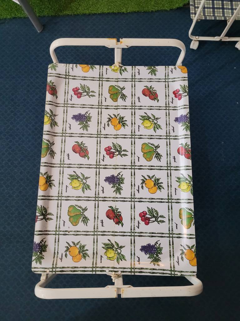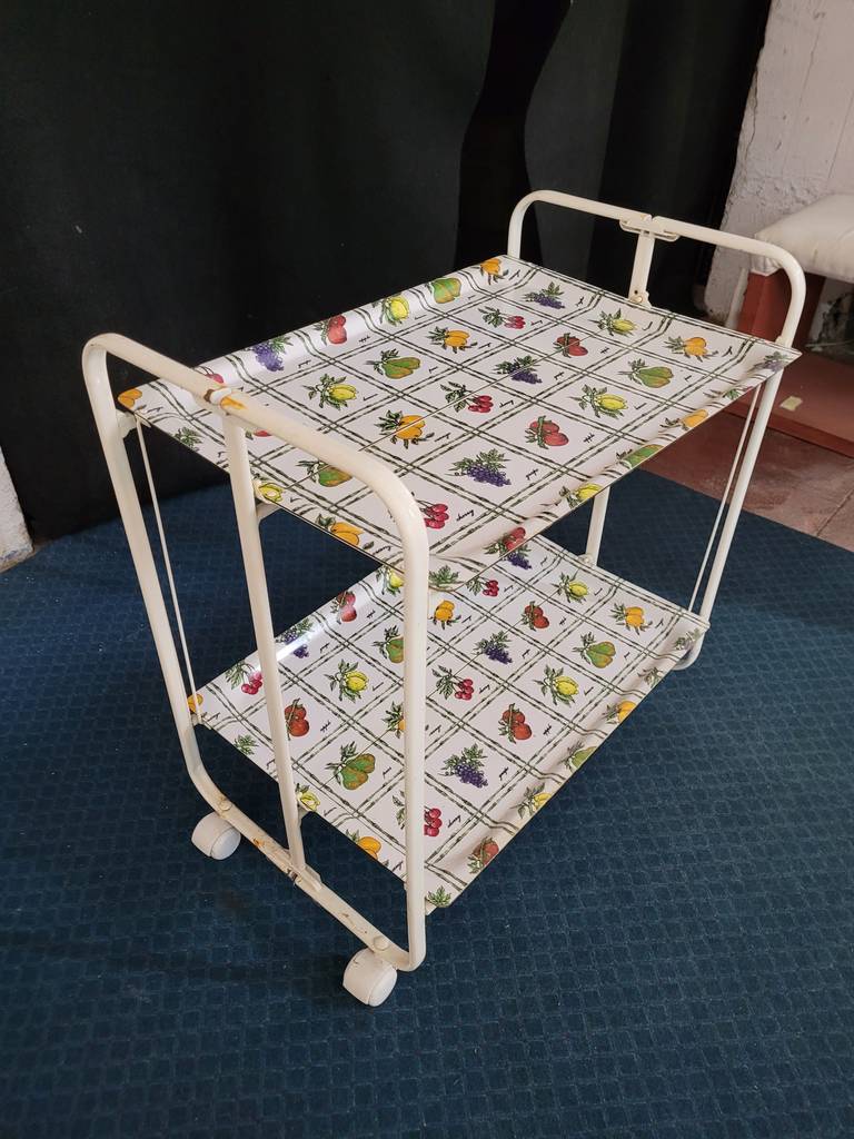 Mesa camarera plegable fabricada en metal de buena calidad y resistente de color blanco con decoración de frutas. Se trata de una mesa camarera que tiene ruedas y se puede transportar por cualquier espacio con mayor facilidad. La mesa es plegable y se puede guardar en un espacio reducido. Como se puede observar en las fotografías se encuentra algo deteriorada por el uso.