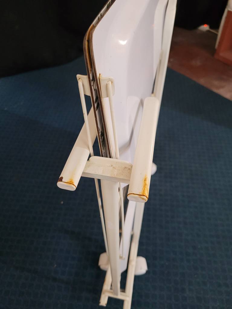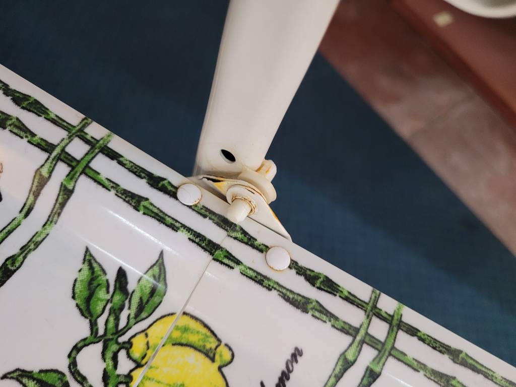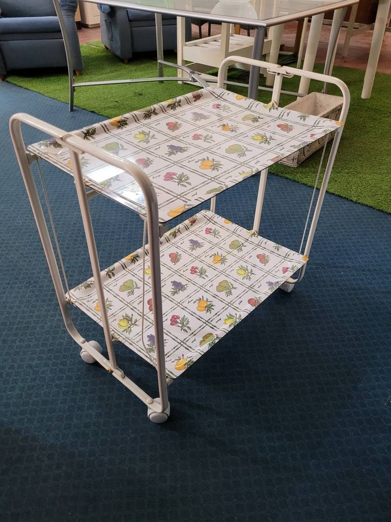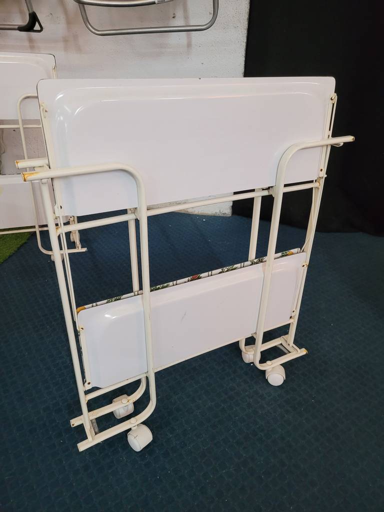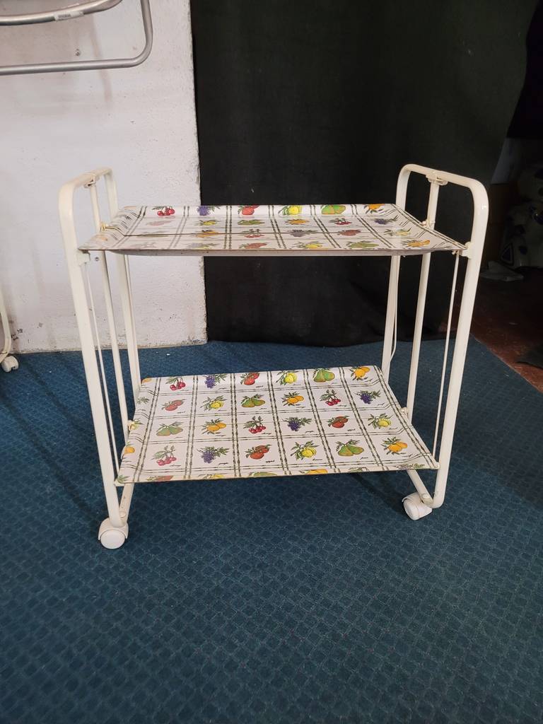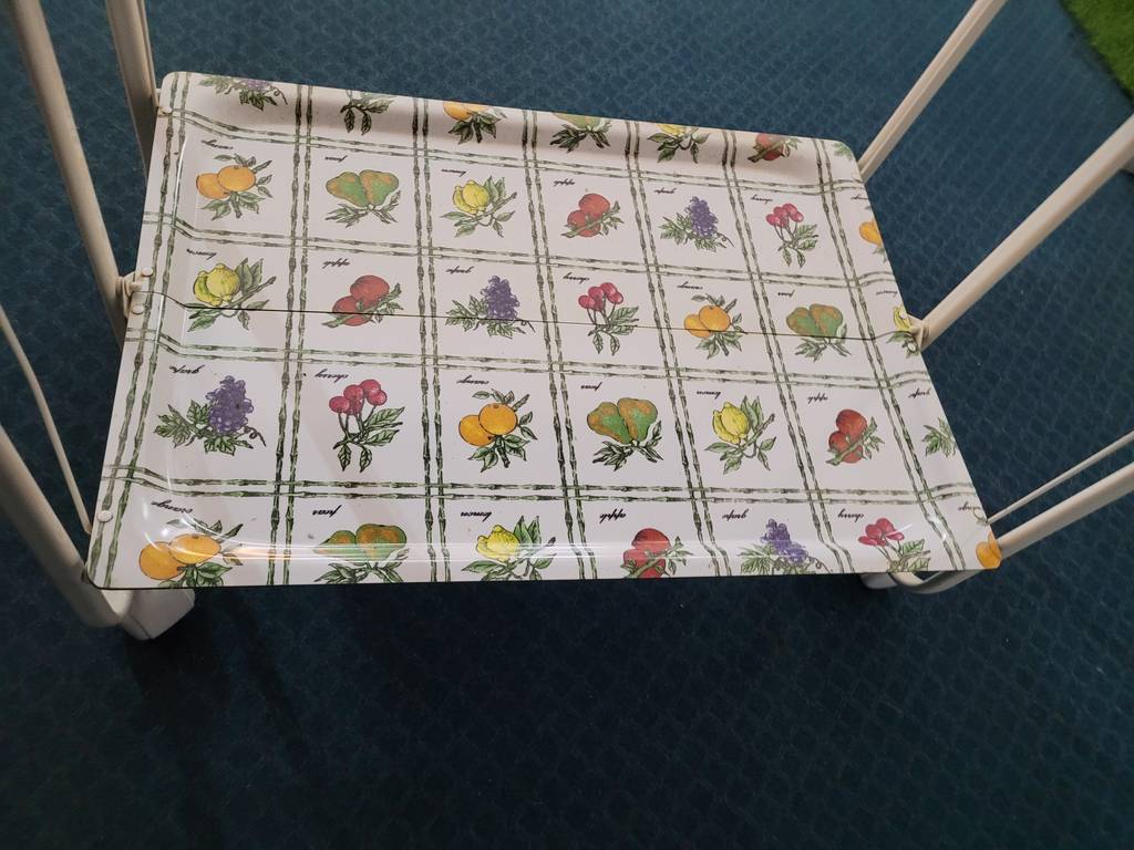 Mesa camarera plegable fabricada en metal de buena calidad y resistente de color blanco con decoración de frutas. Se trata de una mesa camarera que tiene ruedas y se puede transportar por cualquier espacio con mayor facilidad. La mesa es plegable y se puede guardar en un espacio reducido. Como se puede observar en las fotografías se encuentra algo deteriorada por el uso.