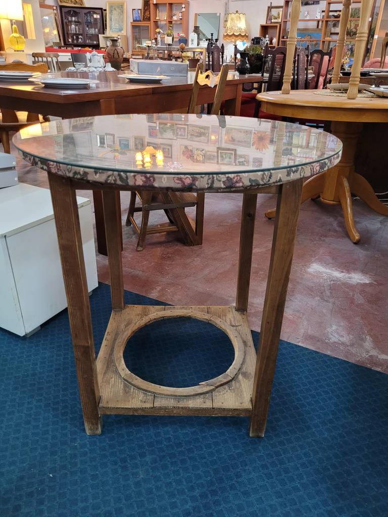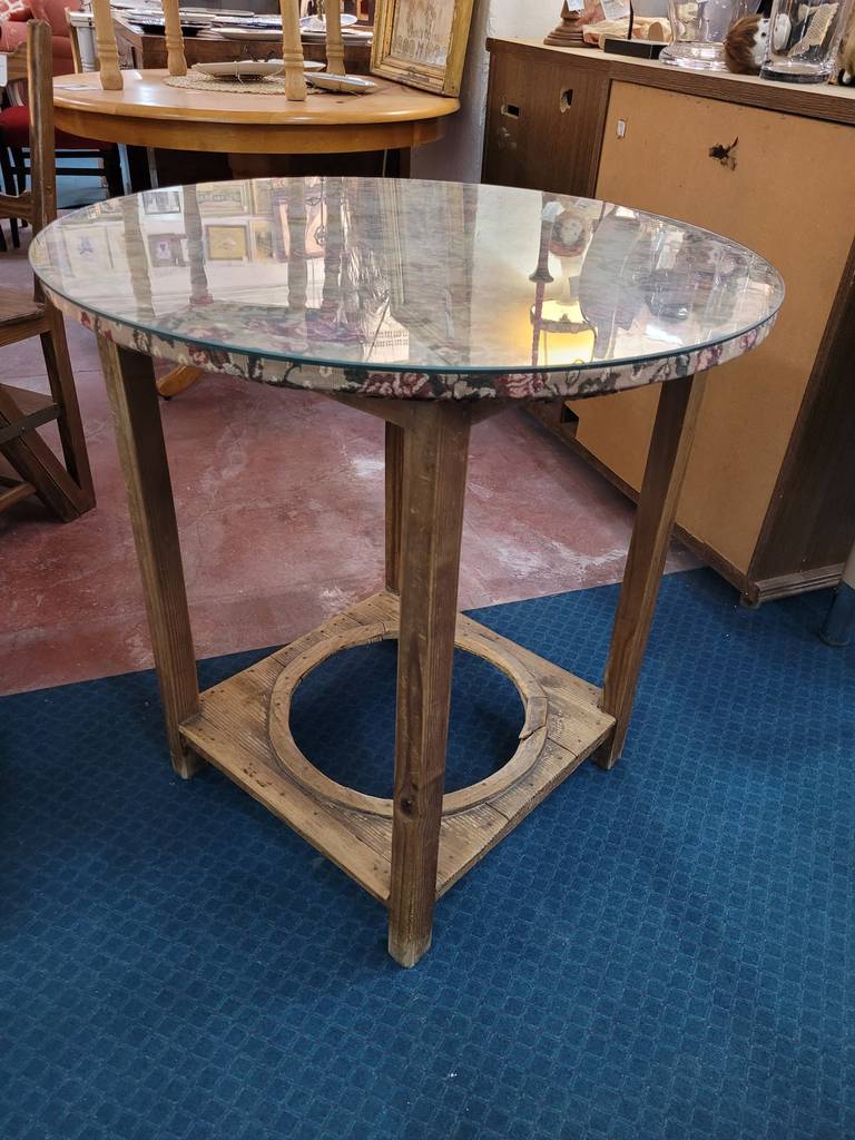 Mesa camilla con cristal incorporado fabricada en madera de buena calidad de color marrón. Se trata de una mesa camilla que cuenta con una base cuadrada con un agujero redondo y tiene una superficie redonda grande con un cristal grueso encima. Es una mesa perfecta para tenerla en un salón comedor. Como se puede observar en las fotografías se encuentra en buenas condiciones.
