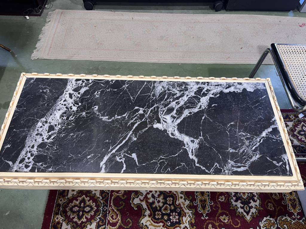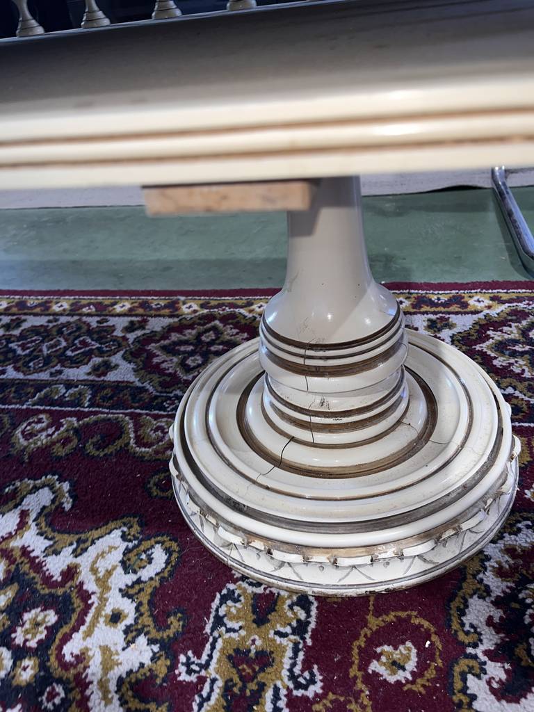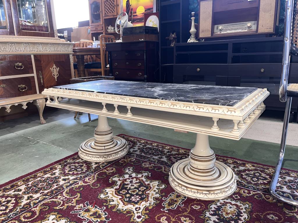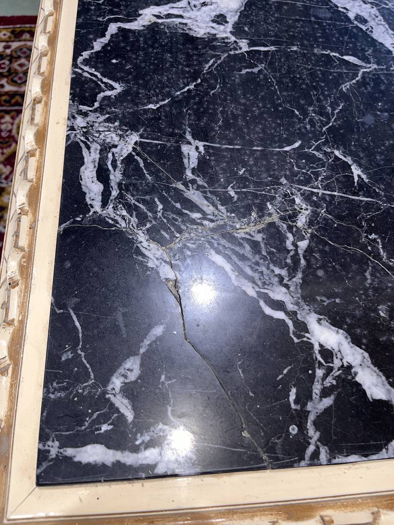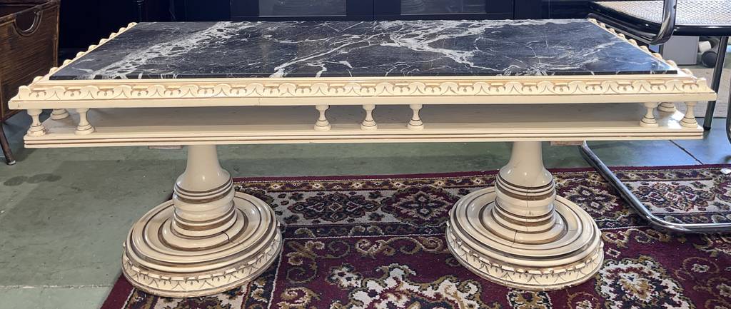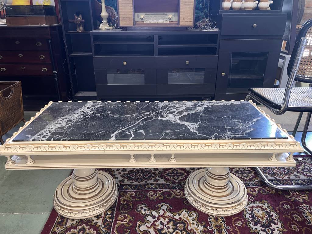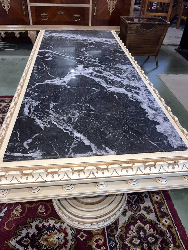 Mesa de centro de estilo clásico de mármol de buena calidad. Se trata de una mesa de centro con una forma rectangular y alargada que tiene dos patas redondas y gruesas. Es una mesa ideal para colocarla en el centro de un salón comedor de estilo clásico. Como se puede observar en las fotografías la mesa tiene el mármol algo roto por alguna de las partes.