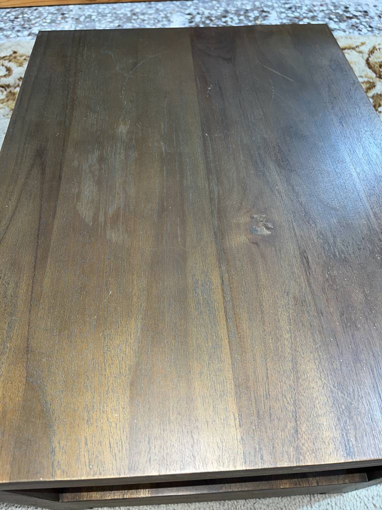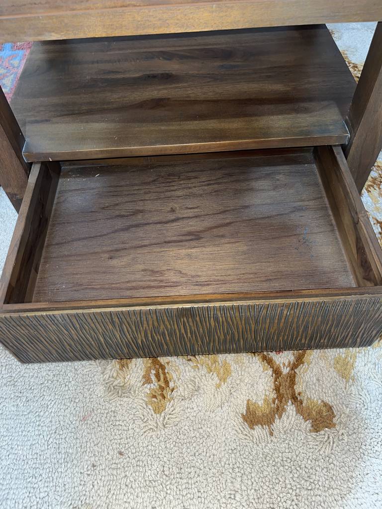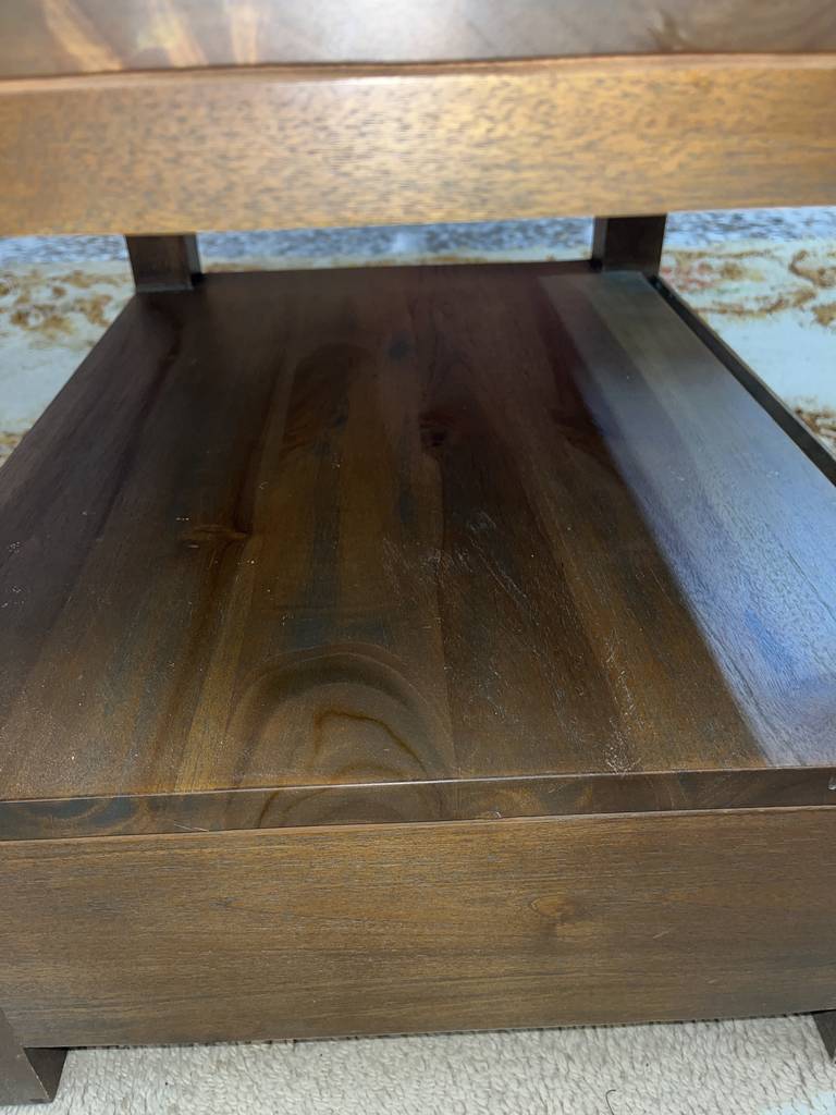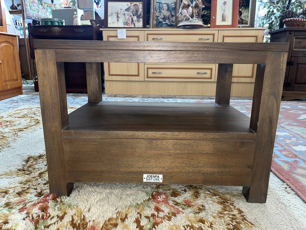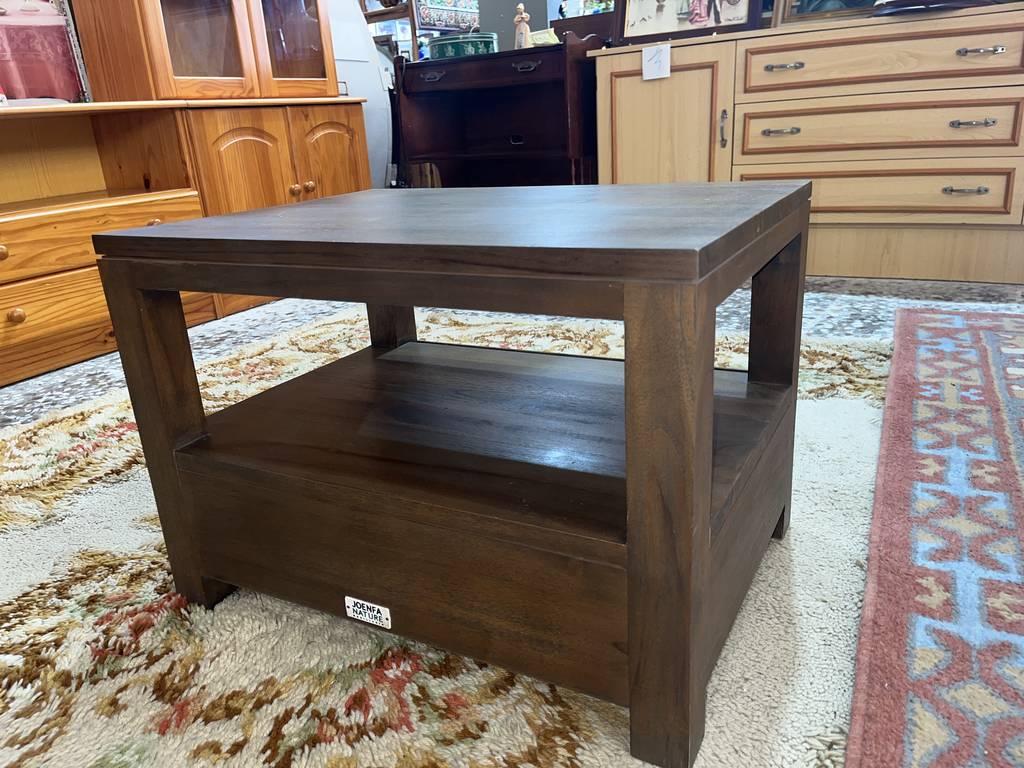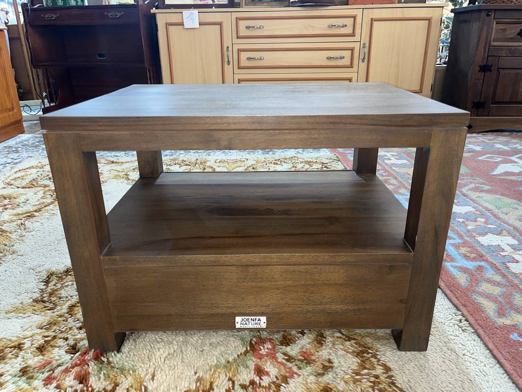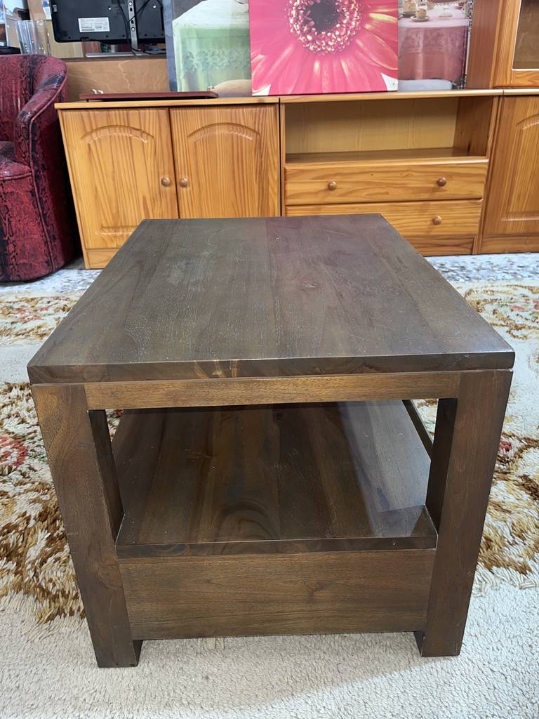 Mesa de centro que ha sido fabricada con madera de buena calidad y robusta. Se compone de un habitáculo abierto inferior, ideal para colocar revistas o libros, así como también un cajón amplio debajo. Es ideal para colocar en un salón comedor frente al sofá. Como podemos observar en las fotografías presenta ligeros rasguños.