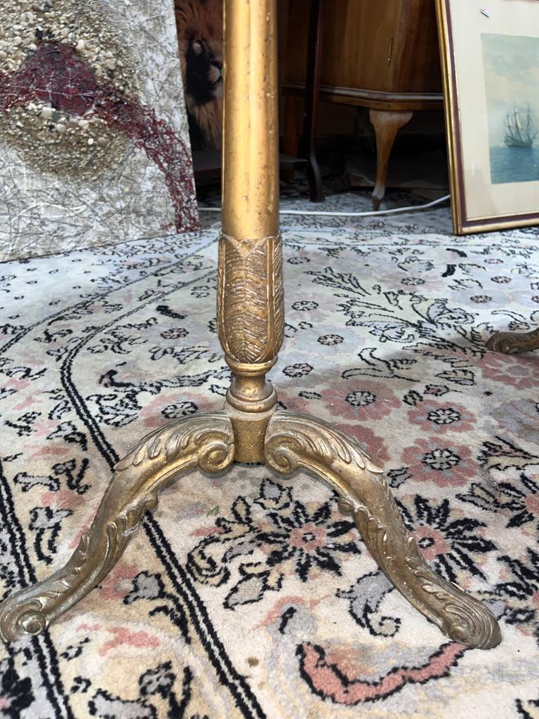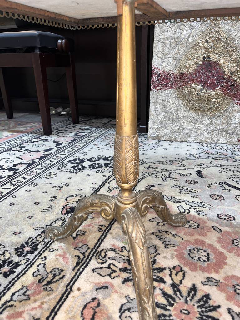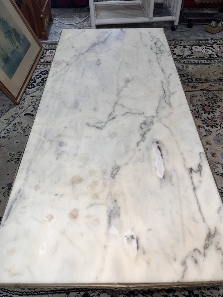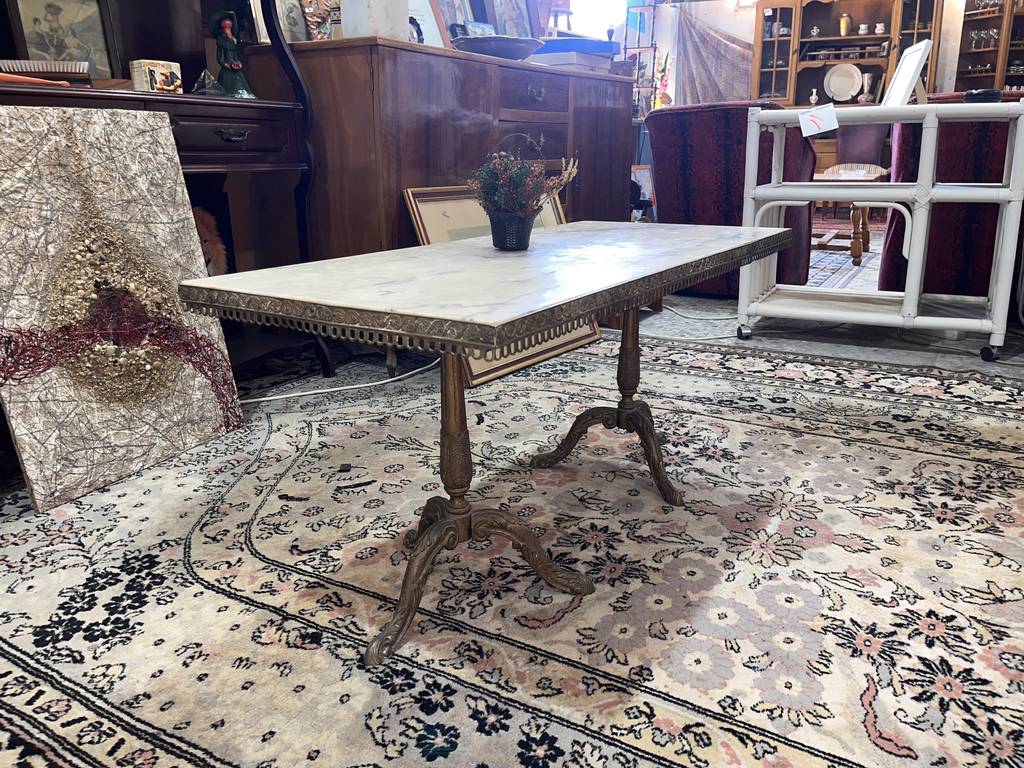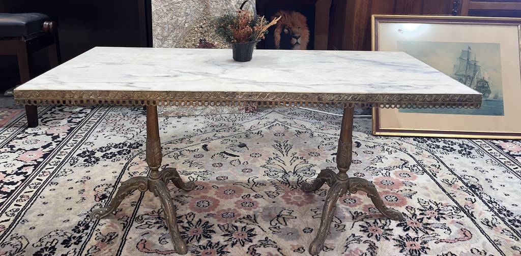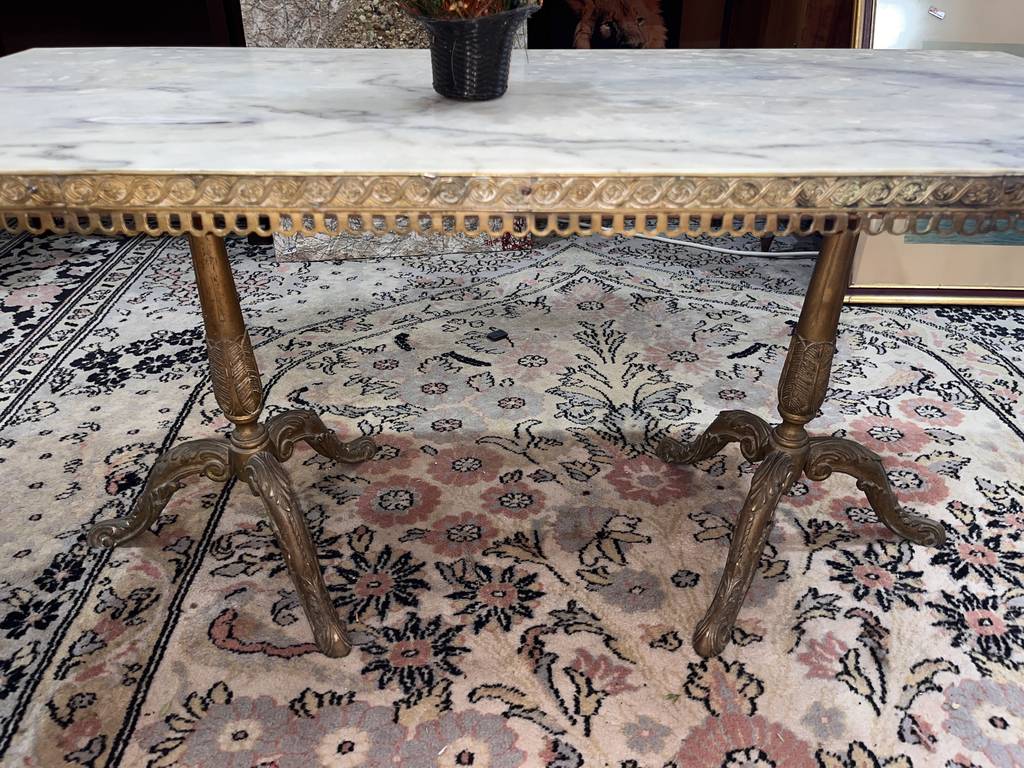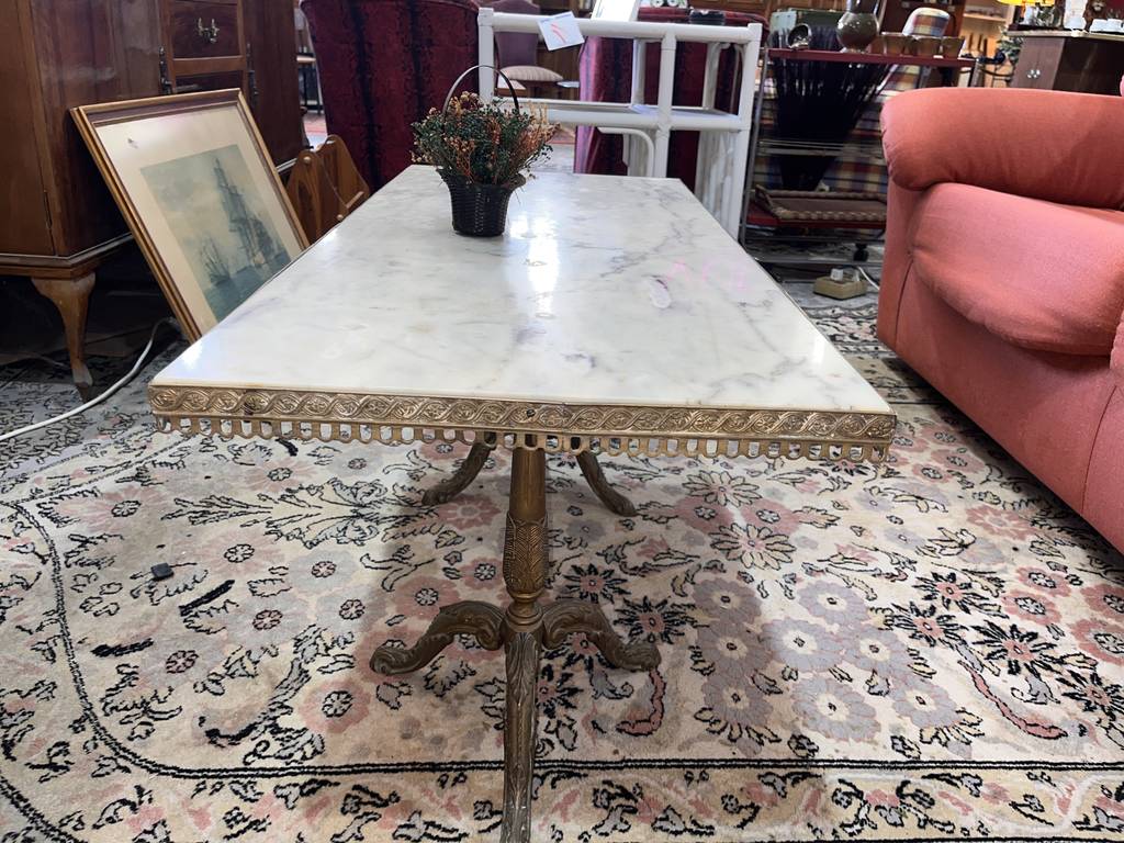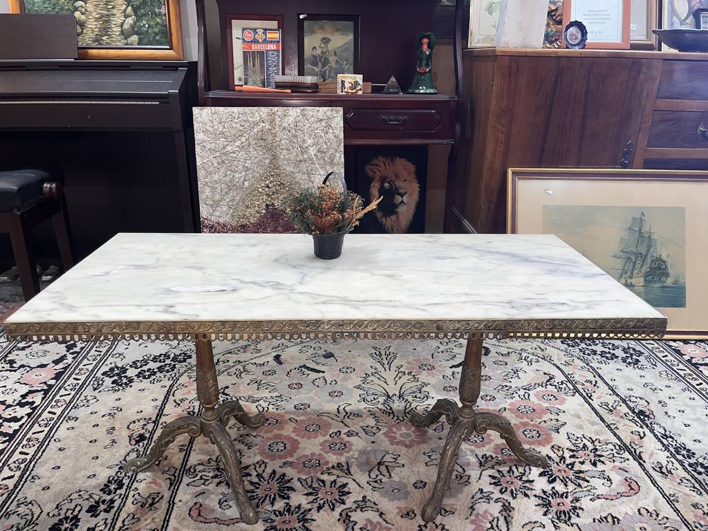 Mesa de centro de estilo clásico cuya estructura está fabricada en metal y tiene una superficie rectangular de color blanco con vetas de color gris efecto mármol. Se trata de una mesa de gran tamaño con una superficie rectangular que se puede colocar en un salón comedor. Como se puede observar en las fotografías la mesa se encuentra algo deteriorada por el paso del tiempo por lo que se recomienda restaurar.