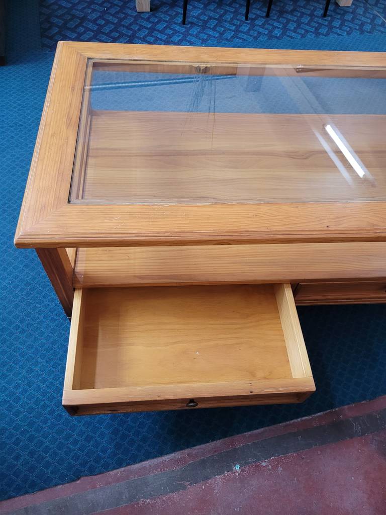 Mesa de centro de estilo moderno en color marrón oscuro que ha sido fabricada con madera de buena calidad y robusta. Se trata de una mesa compuesta por un tablón superior que se asienta sobre cuatro patas amplias unidas por robustos listones de madera. Es ideal para colocar en un salón comedor frente al sofá. Como podemos observar en las fotografías se encuentra en buenas condiciones.