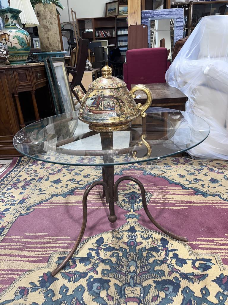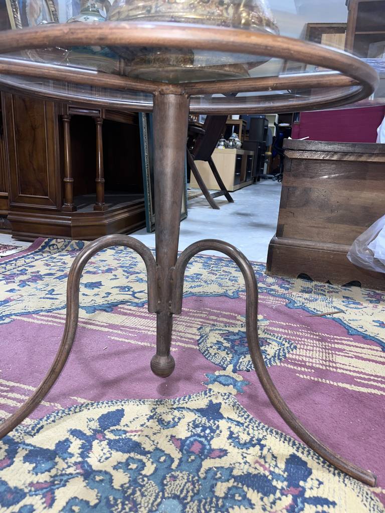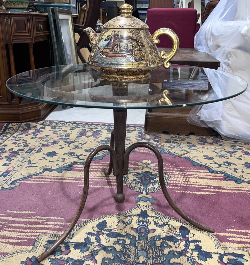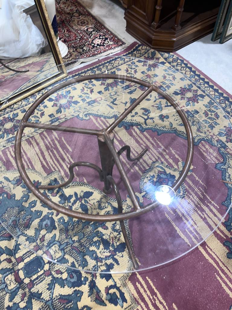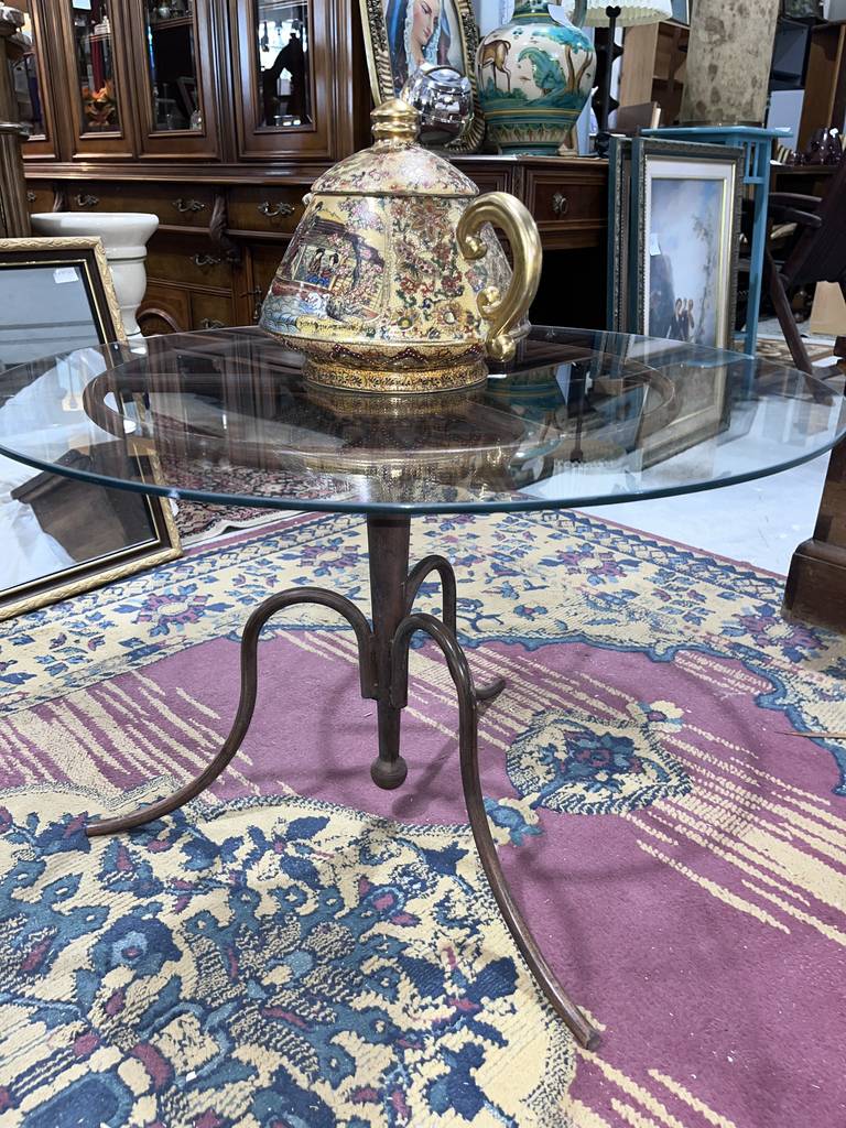 Mesa de centro baja con una forma circular que está compuesta por una parte superior de cristal grueso y unas patas de forja de color marrón oscuro. Se trata de una mesa de centro circular baja que resulta ideal para colocarla en un salón comedor entre un sofá y una televisión. Como se puede observar en las fotografías se encuentra en buenas condiciones.